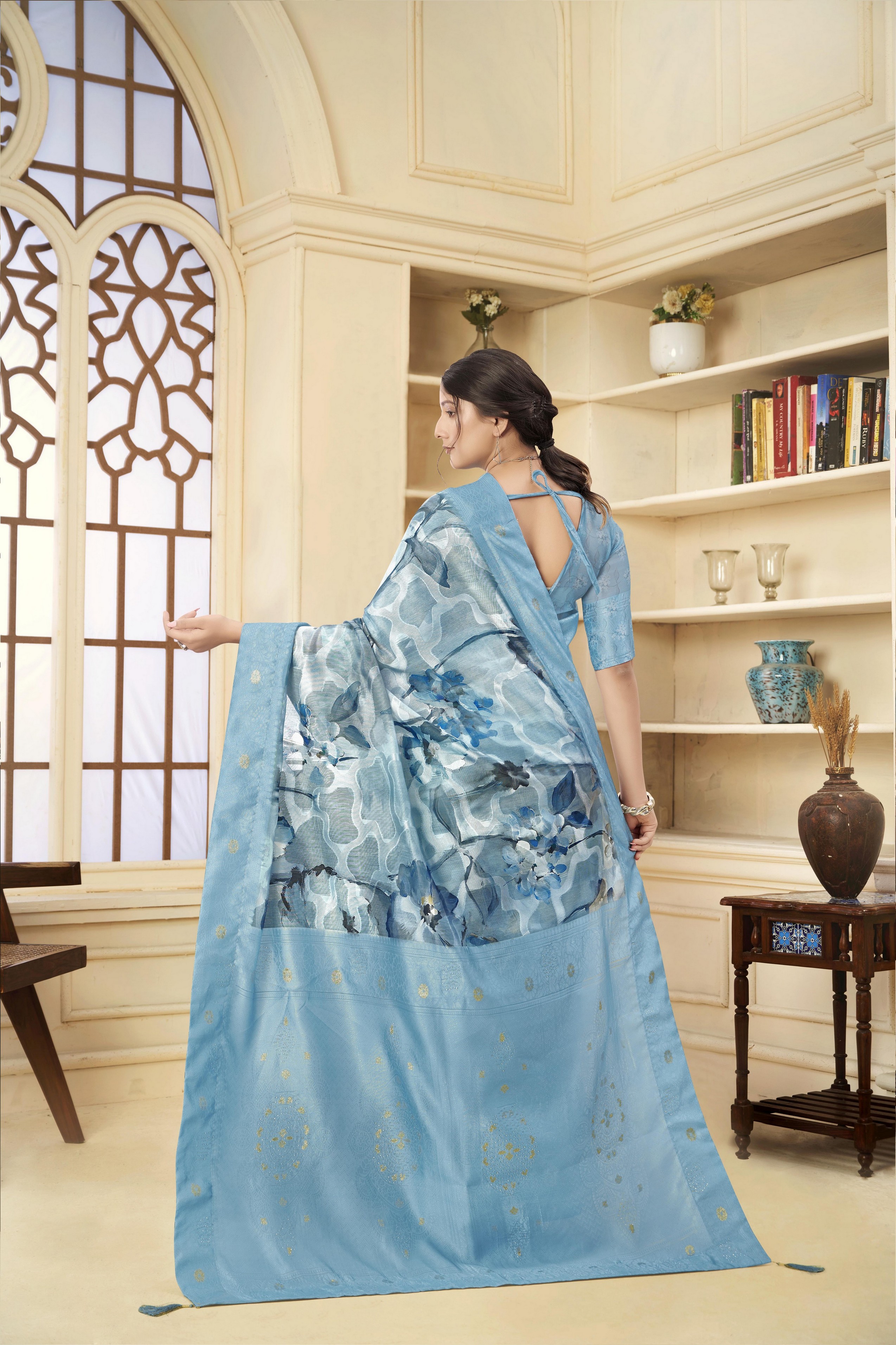 Blue Color Wevon Jacquard Designer With Printed Rich Silk Fabric Stylish Ceremonial Saree