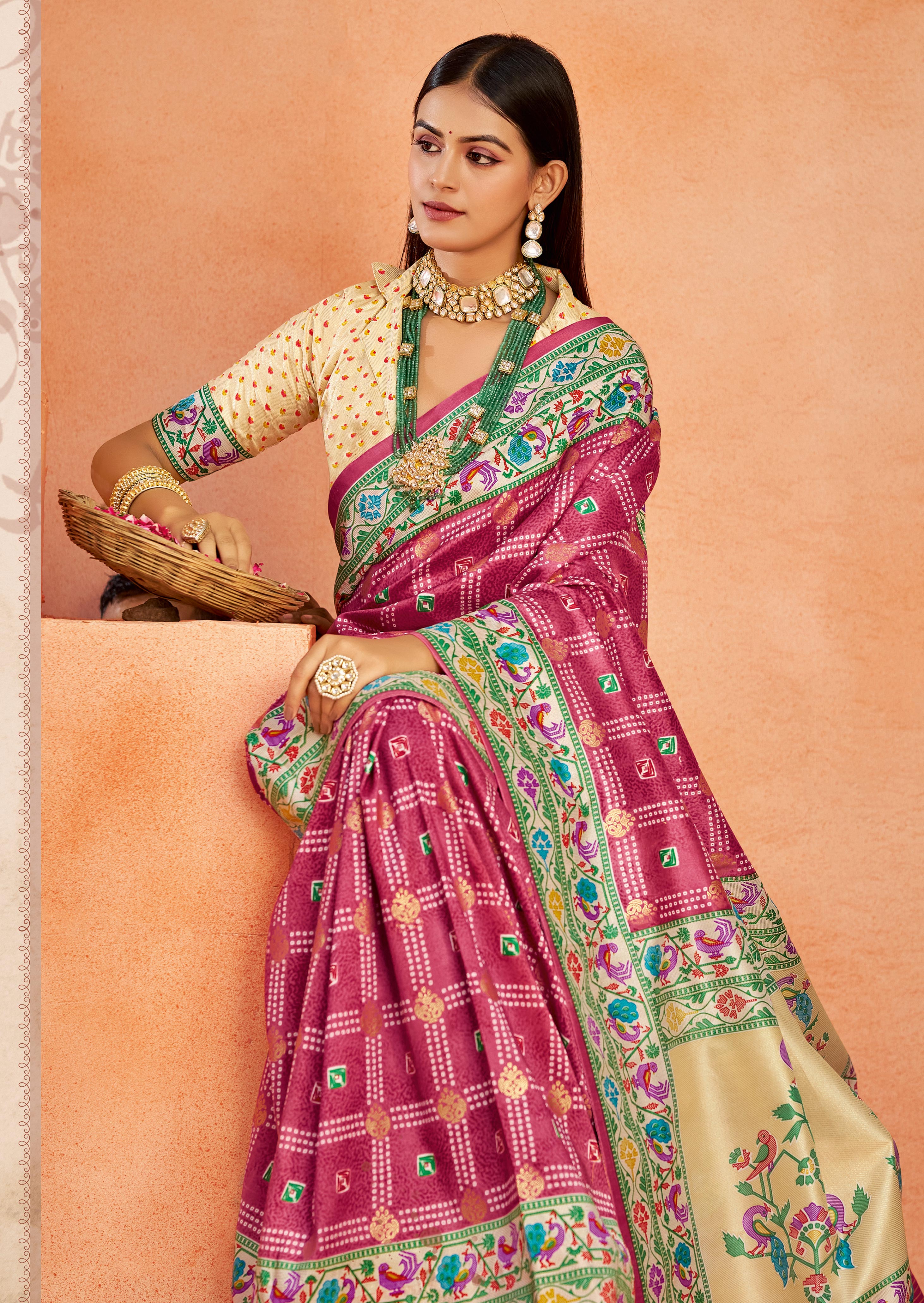 Brick Red Color Velvet Tussar Silk Fabric Partywear Saree With Paithani Pallu And Traditional Ghatchola Print