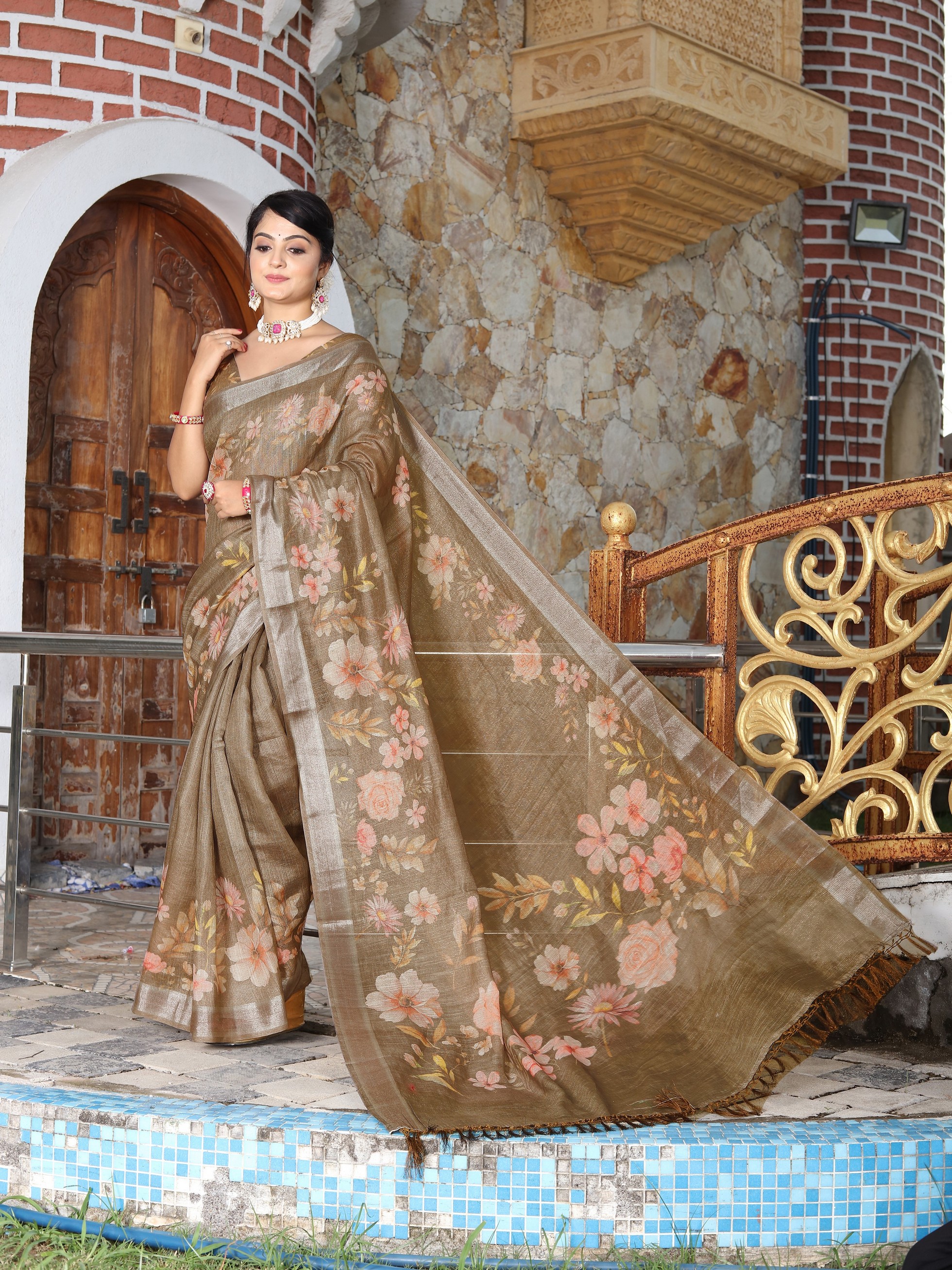 Brown Color Cotton Shimmer Fabric Smart Printed Saree With Woven Border