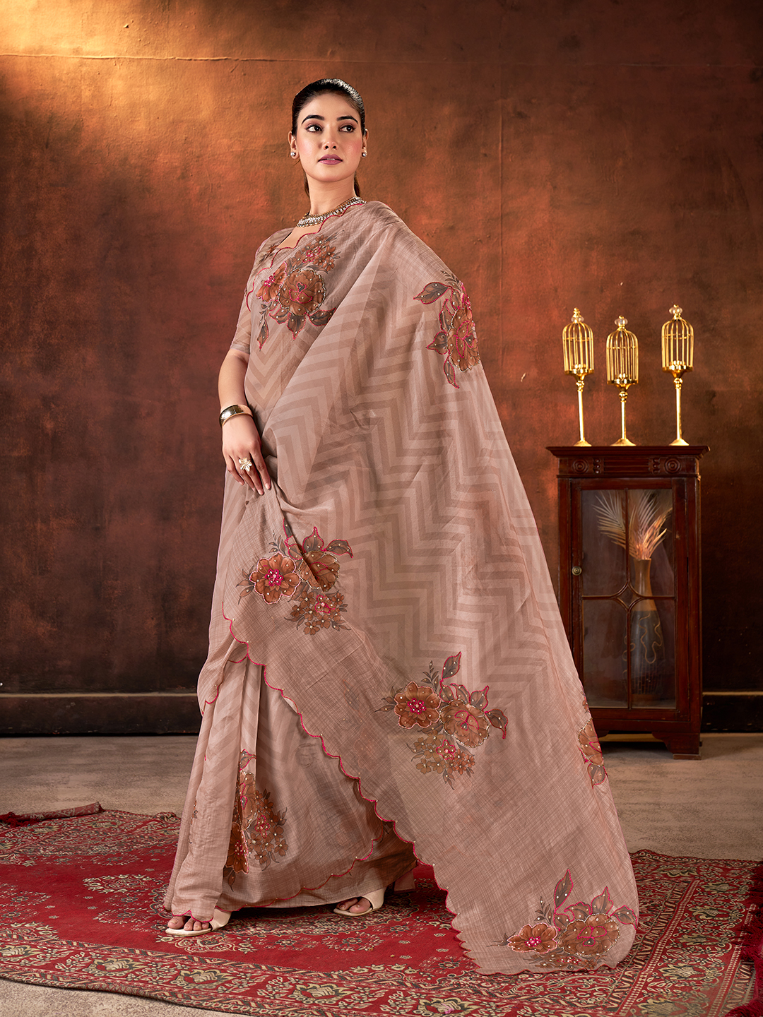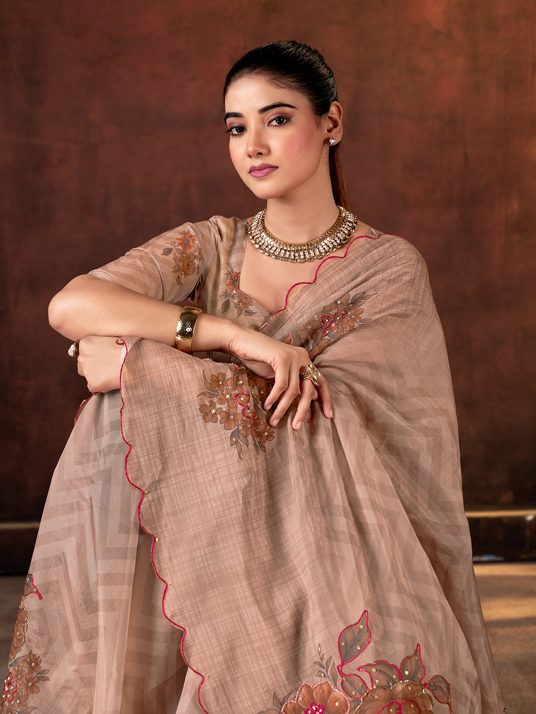 Brown Color Designer Tabby Organza Fabric Designer Printed With Khatli Work Saree