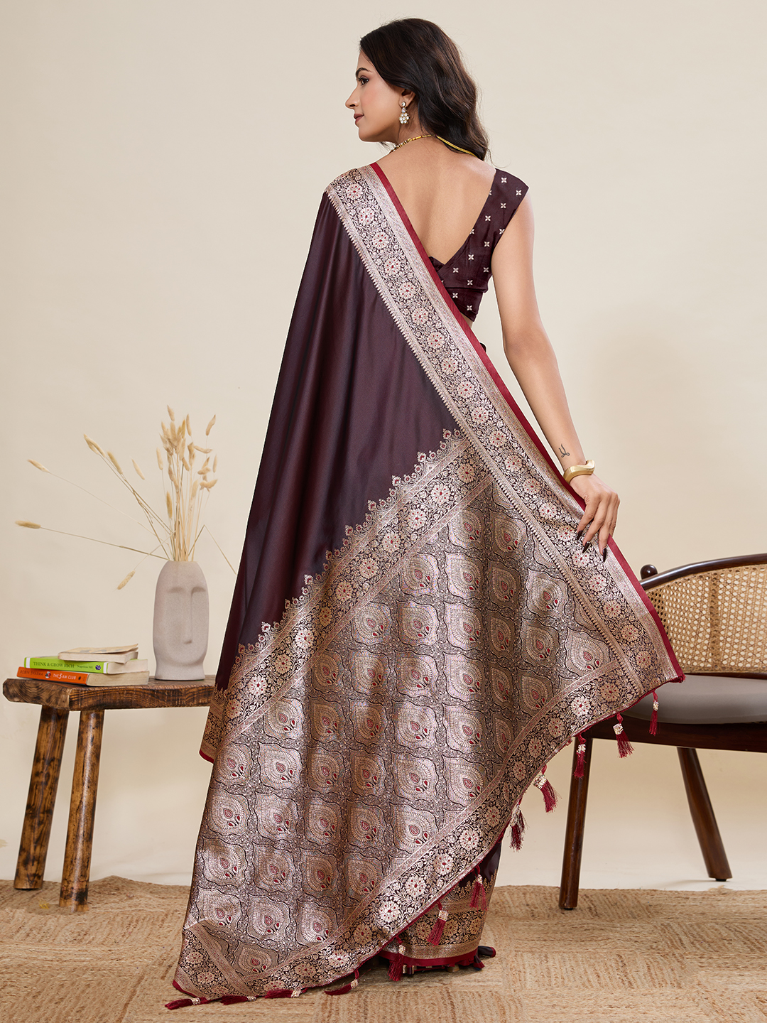 Brown Color Satin Silk Fabric Wevon Jari Designer Graceful Partywear Saree