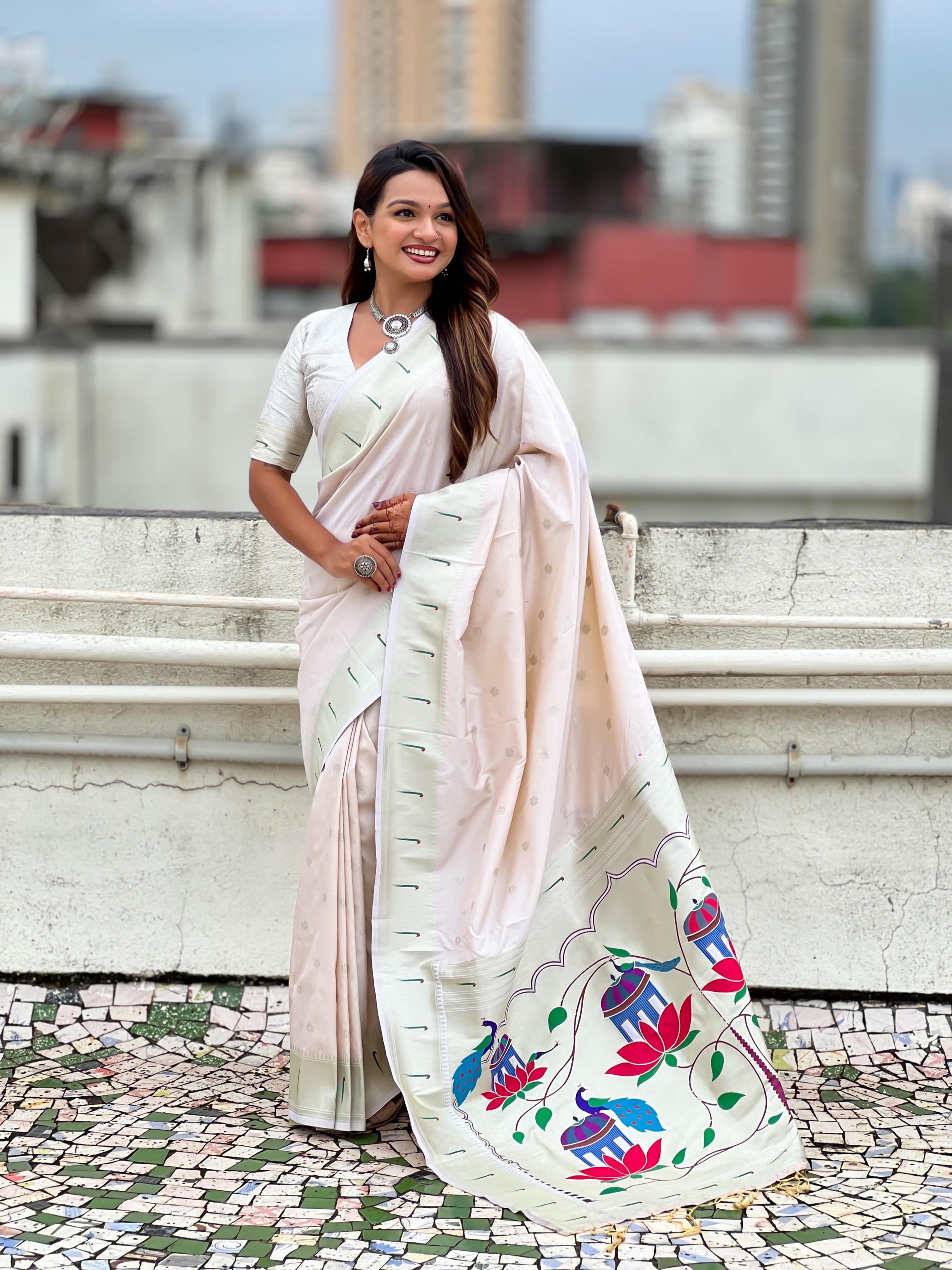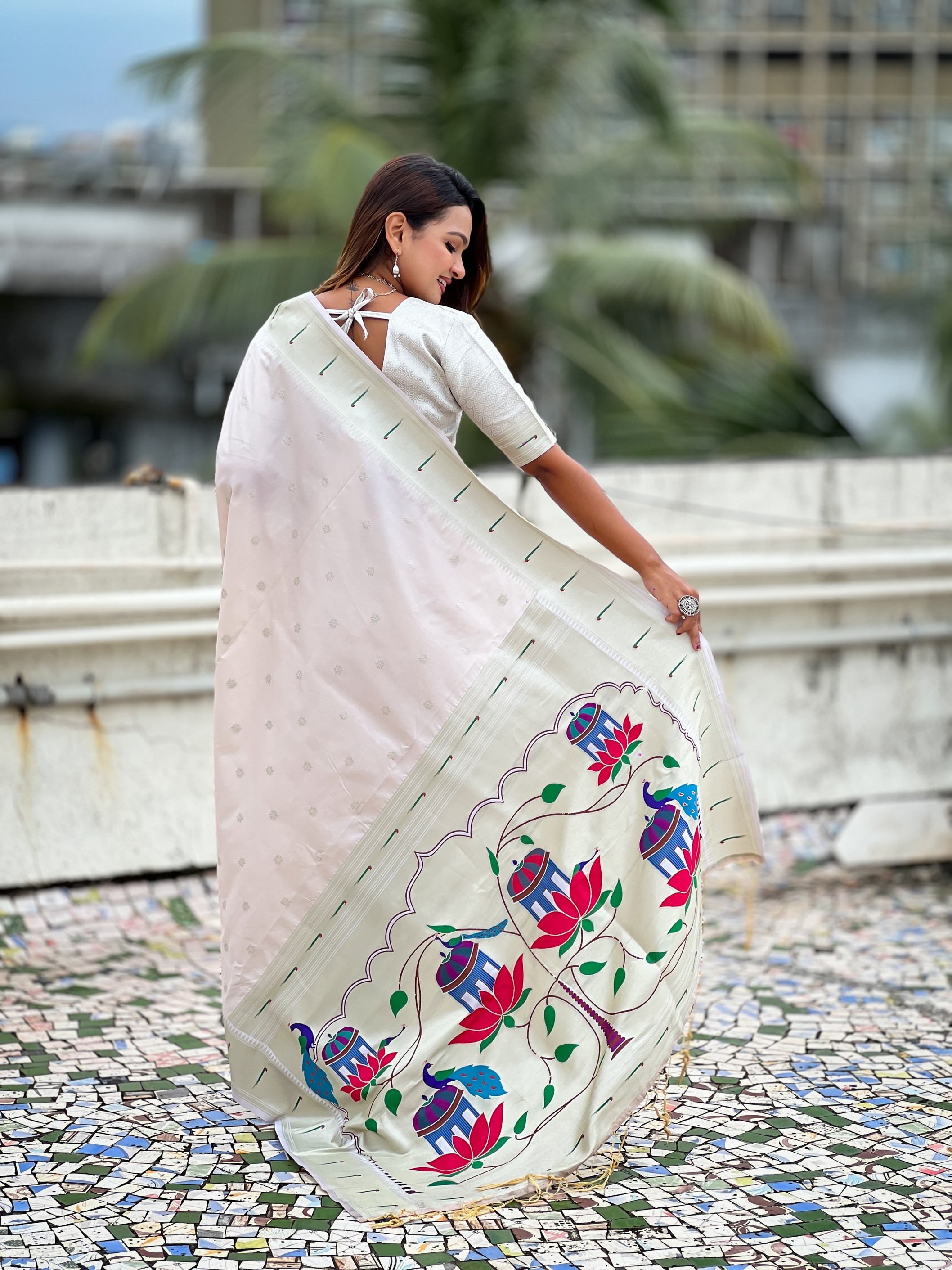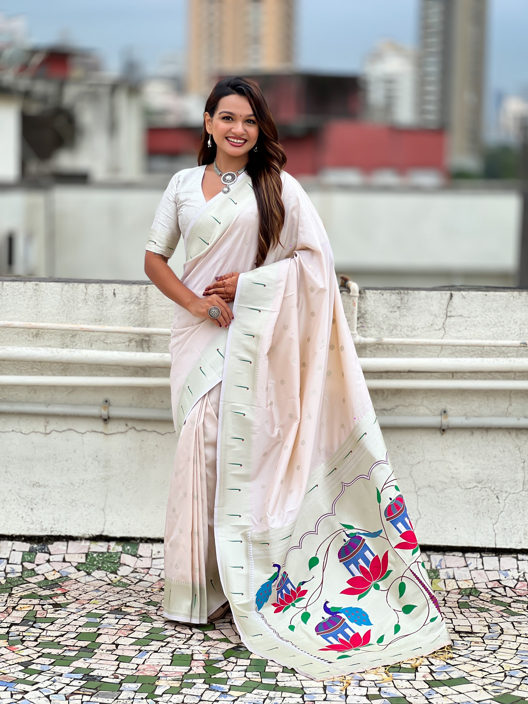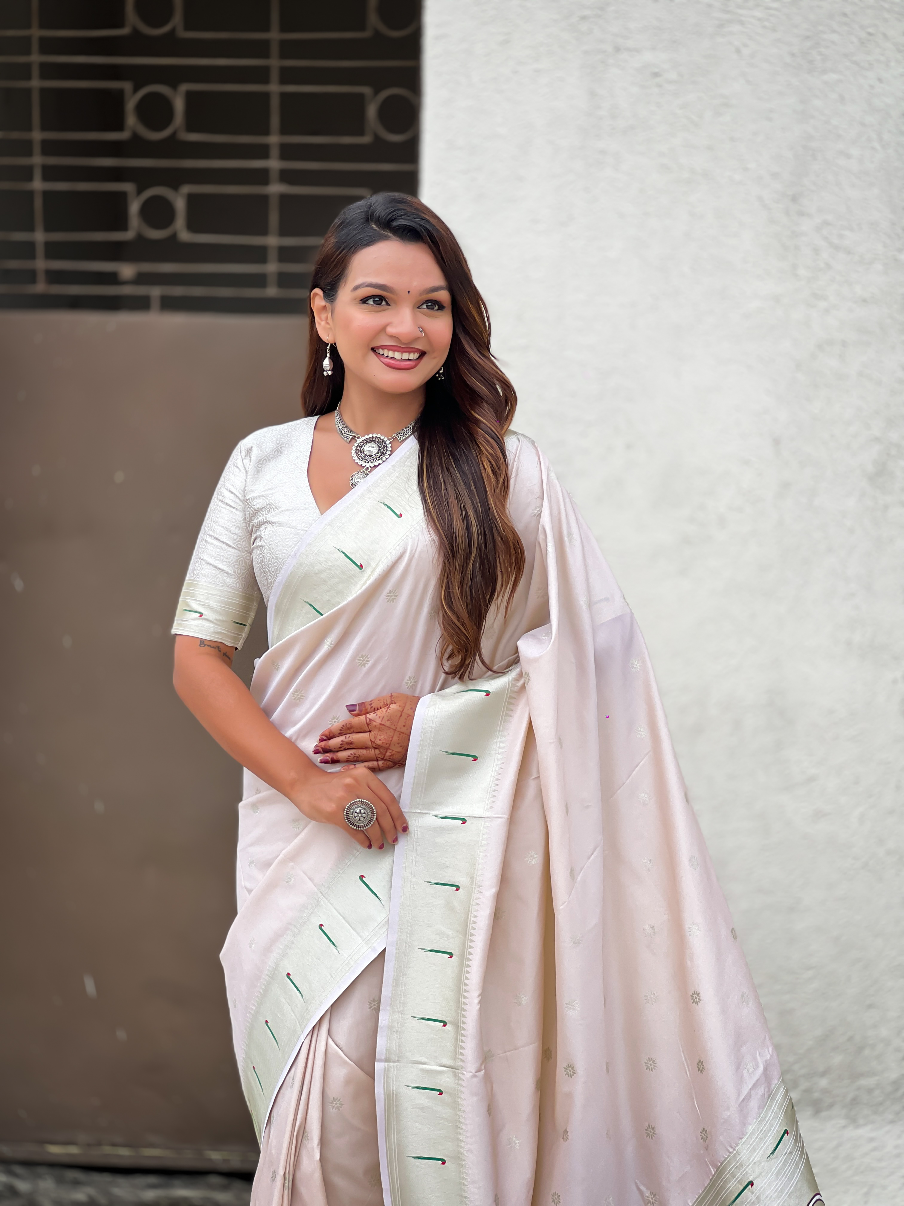 Attractive These Party Wear Saree in Fine Colored.These Saree And Blouse is Fabricated On Paithani Silk.Its Beautified With Weaving Silver Jari, Meenakari Peacock Designer.
