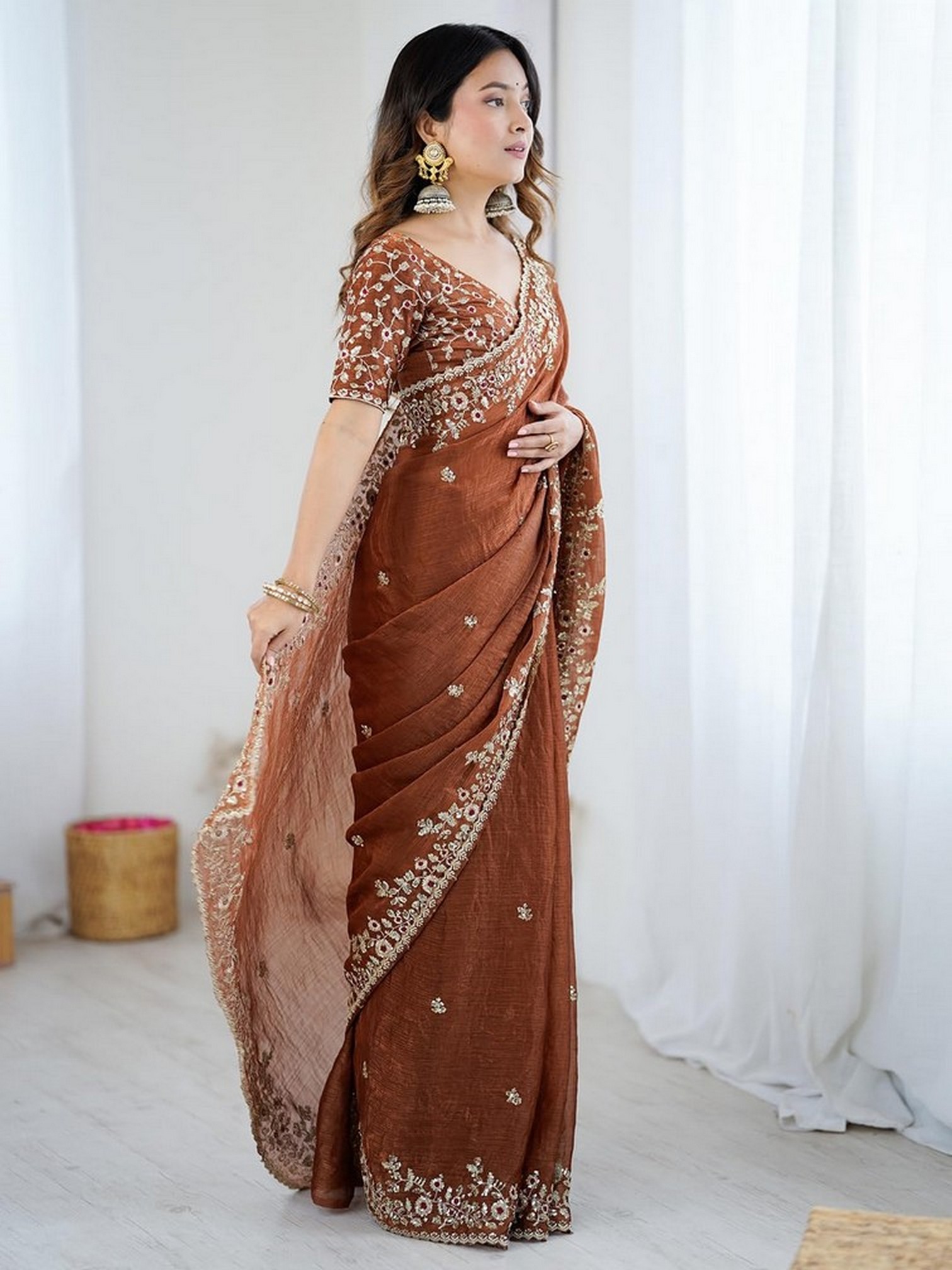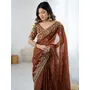 Coffee Color Fendy Chiffon Fabric Designer Embroidered Saree For Ceremonial Looks