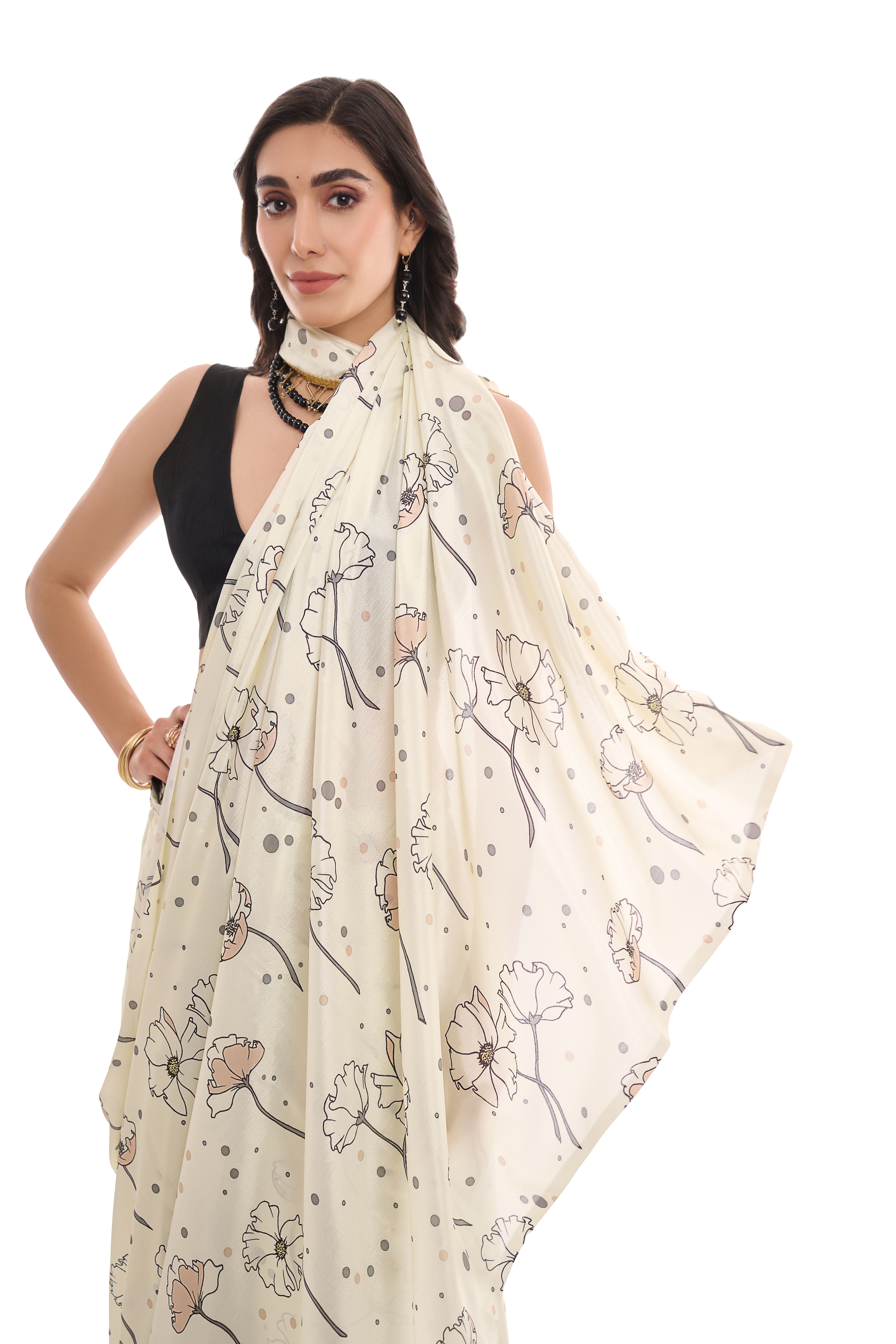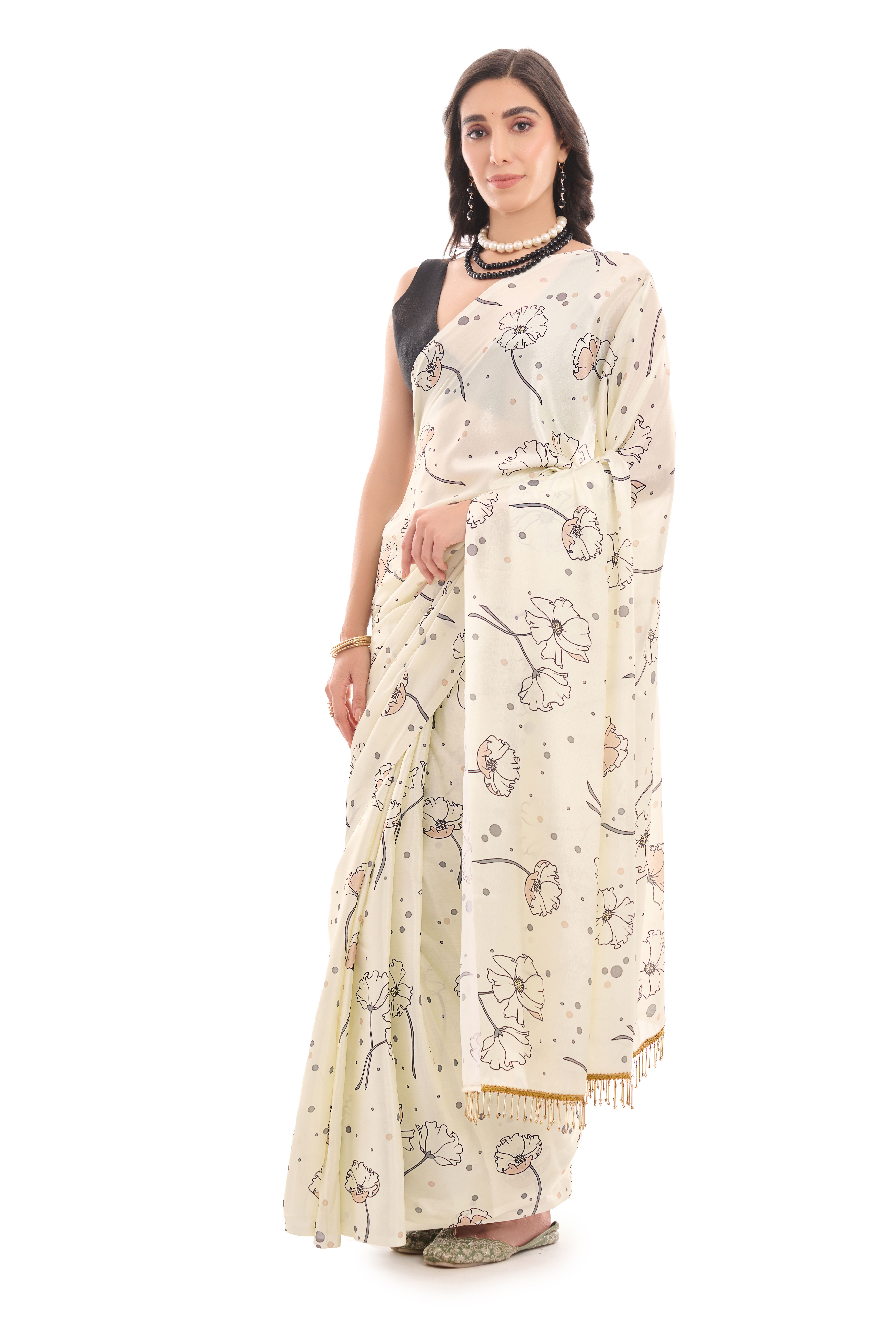 Cream Color Chinon Fabric Designer Prinnted Ready To Wear Saree