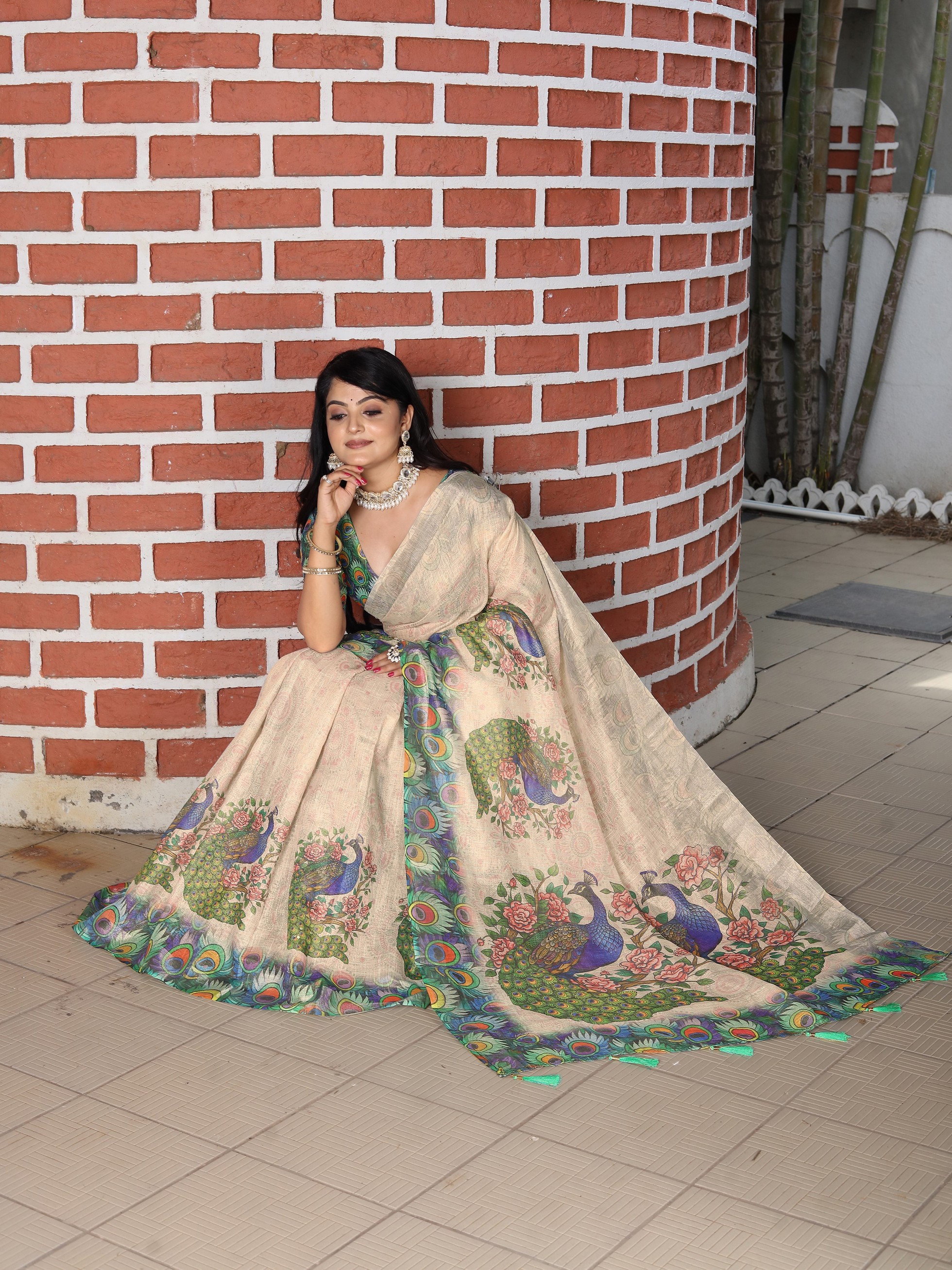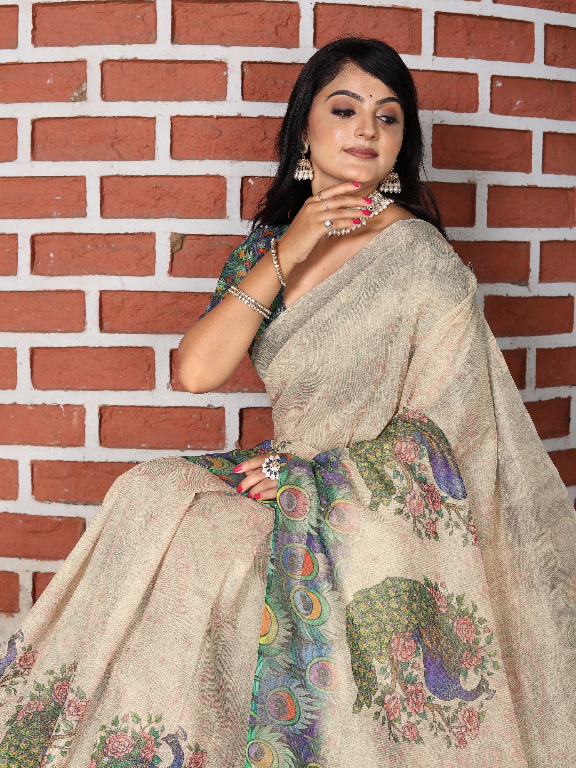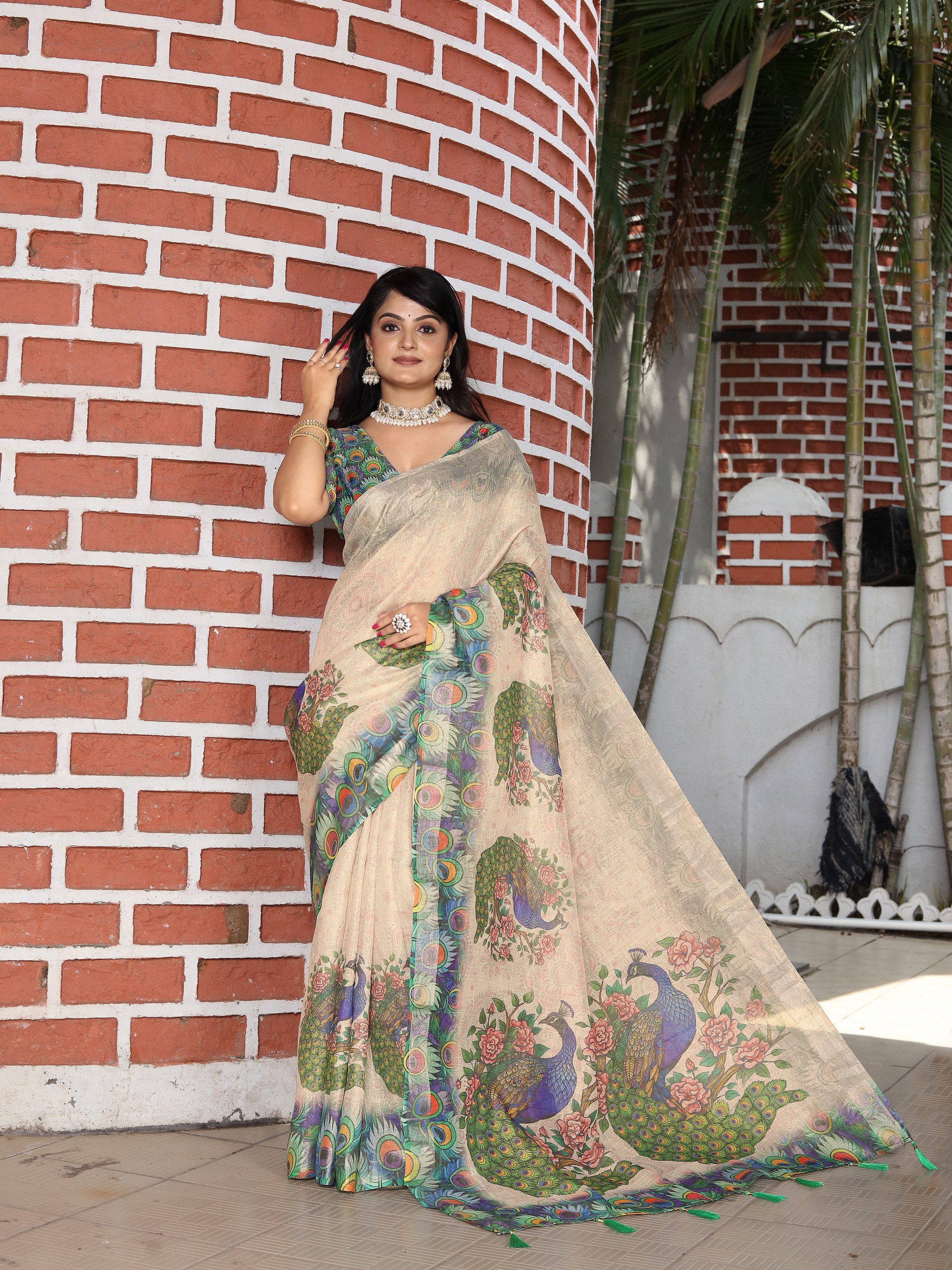 Cream Color Cotton Shimmer Fabric Smart Printed Saree With Woven Border