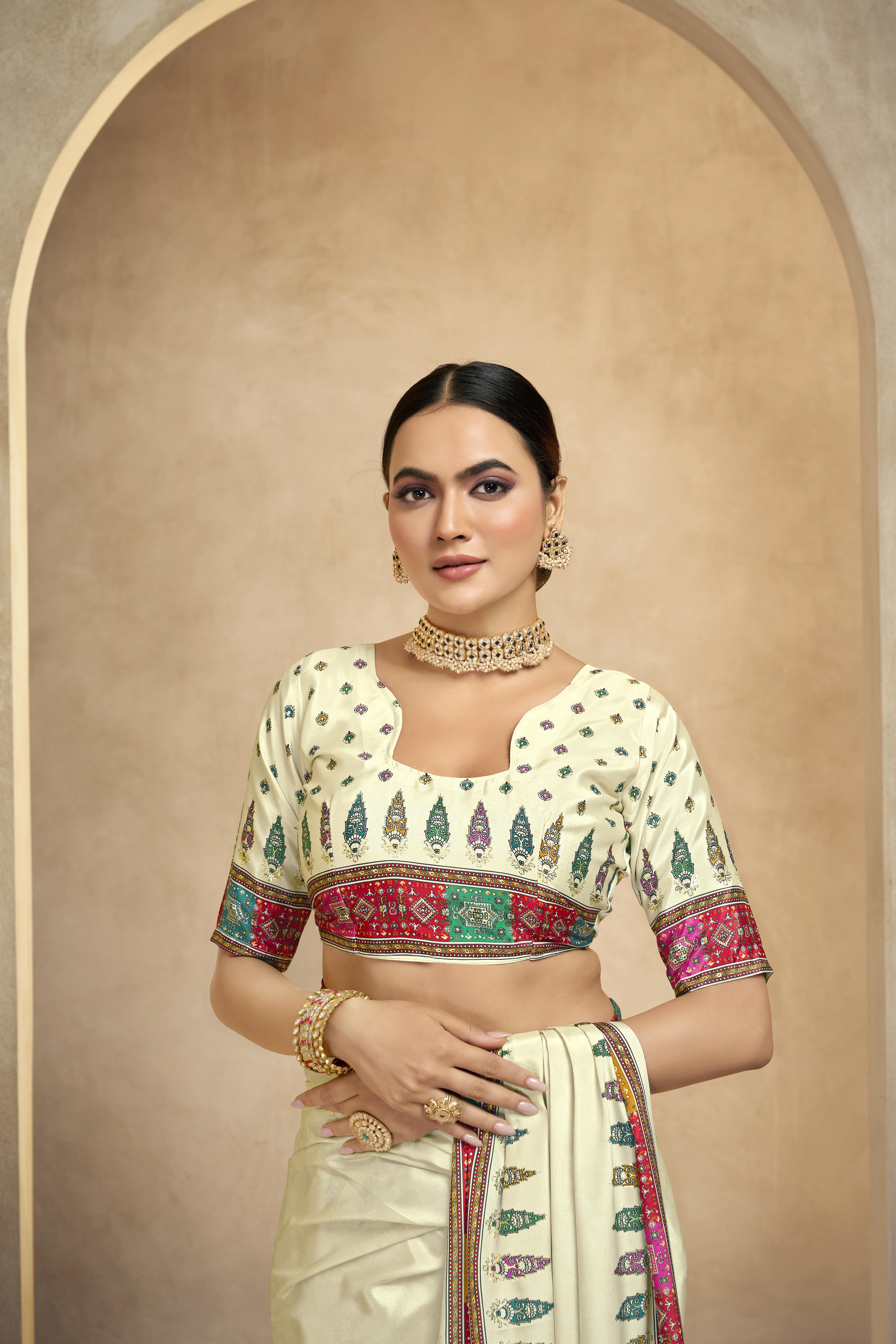 Cream Color Crepe Silk Fabric Position Digital Foil Printed Saree