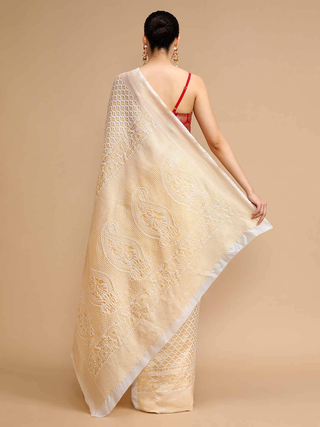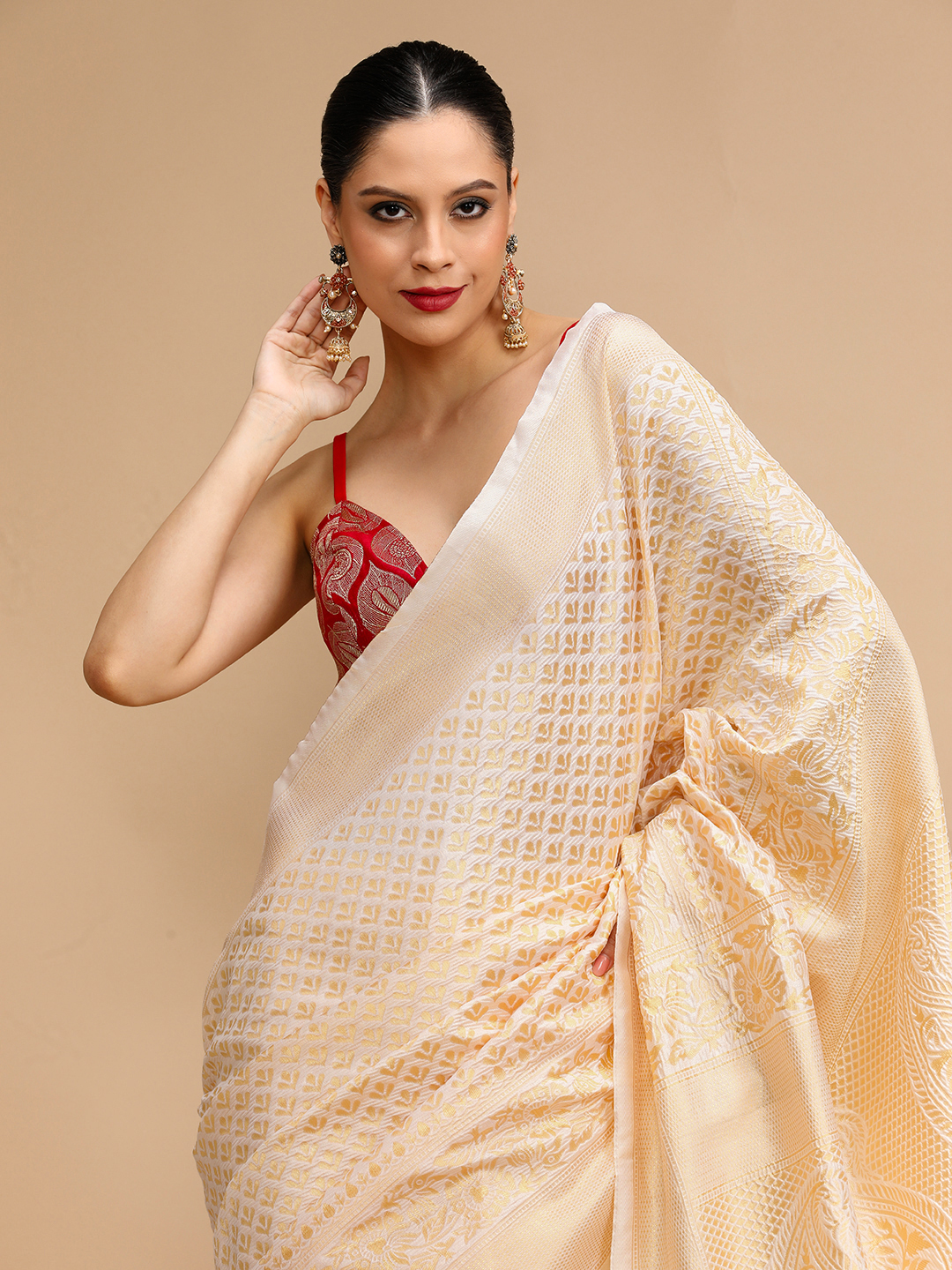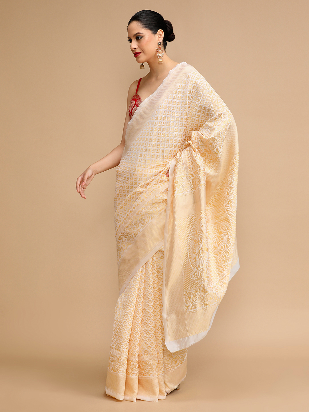 Cream Color Lichi Silk Saree Woven Jacquard Designer For Ceremonial Looks