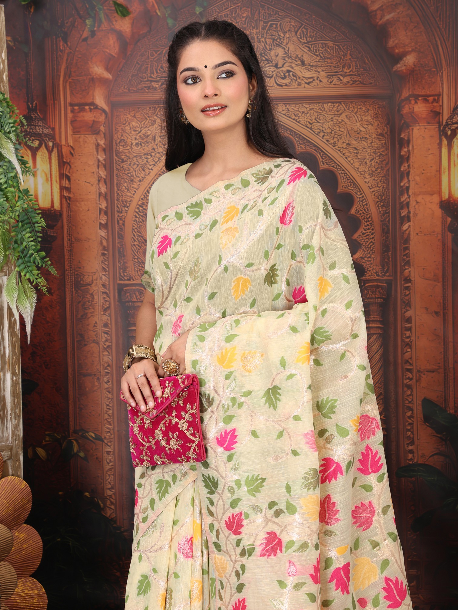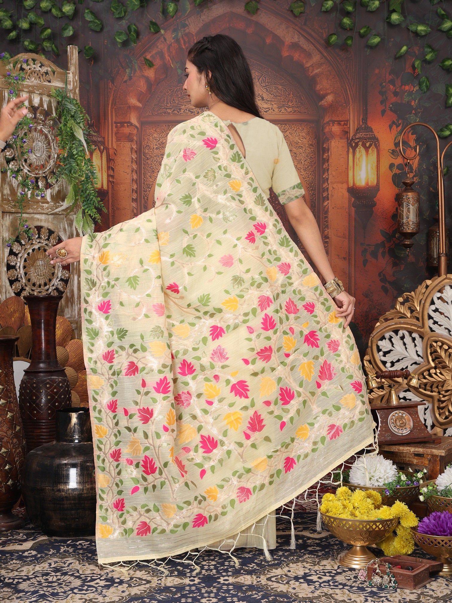 Cream Color Linen Cotton Fabric Woven Designer Partywear Saree