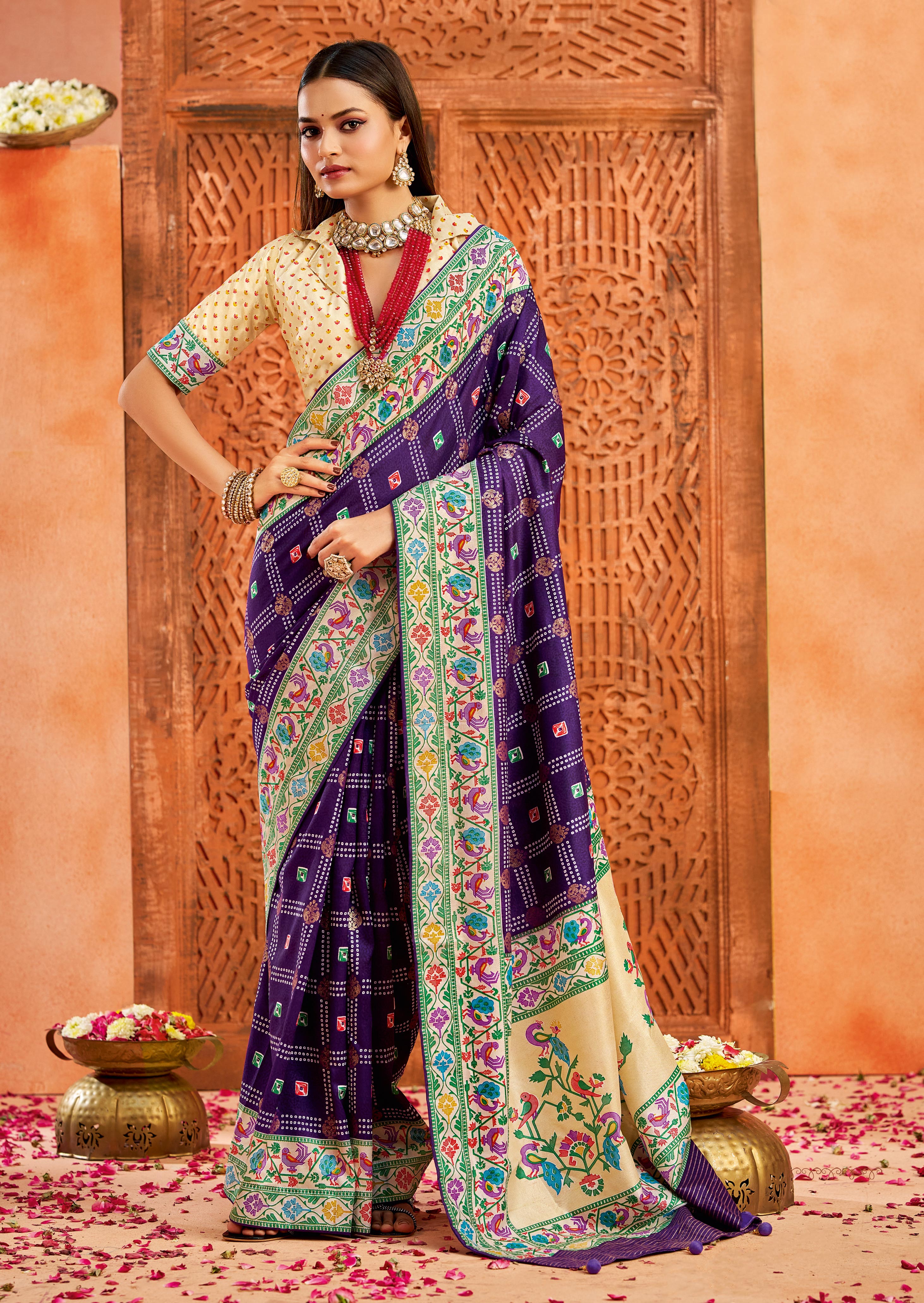 Dark Purple Color Velvet Tussar Silk Fabric Partywear Saree With Paithani Pallu And Traditional Ghatchola Print
