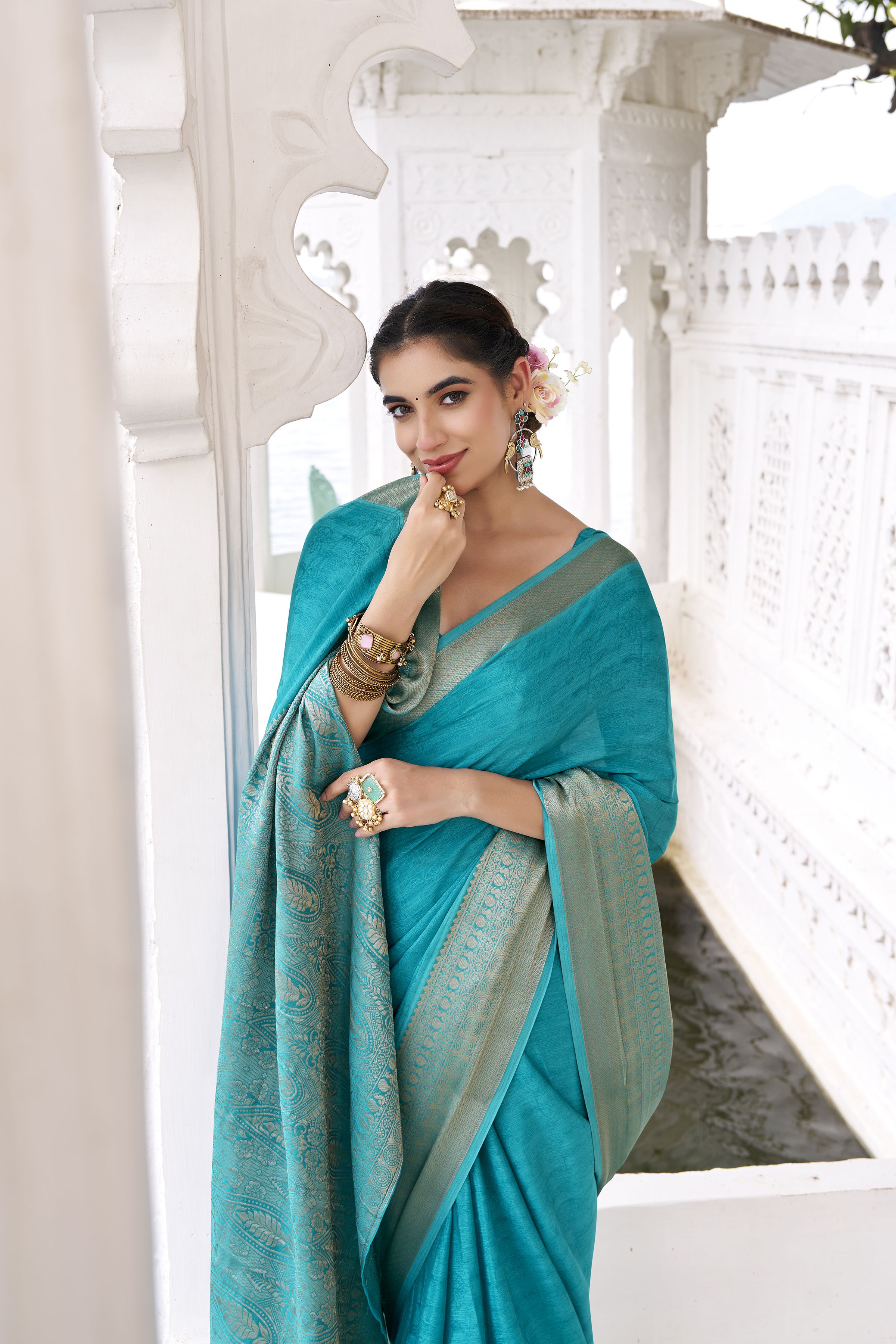 Firozi Color Beautiful Chinon Fabric Woven Designer Saree For Trendy Girlie Looks
