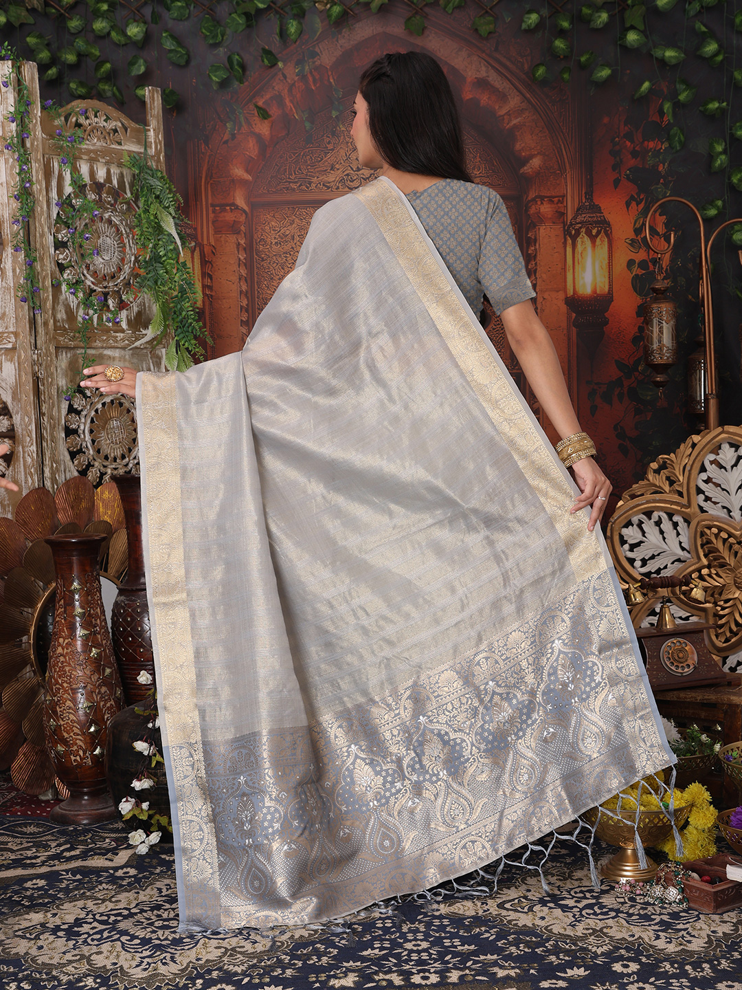 Gray Color Organza Fabric Woven Designer Trendy Ethnic Saree