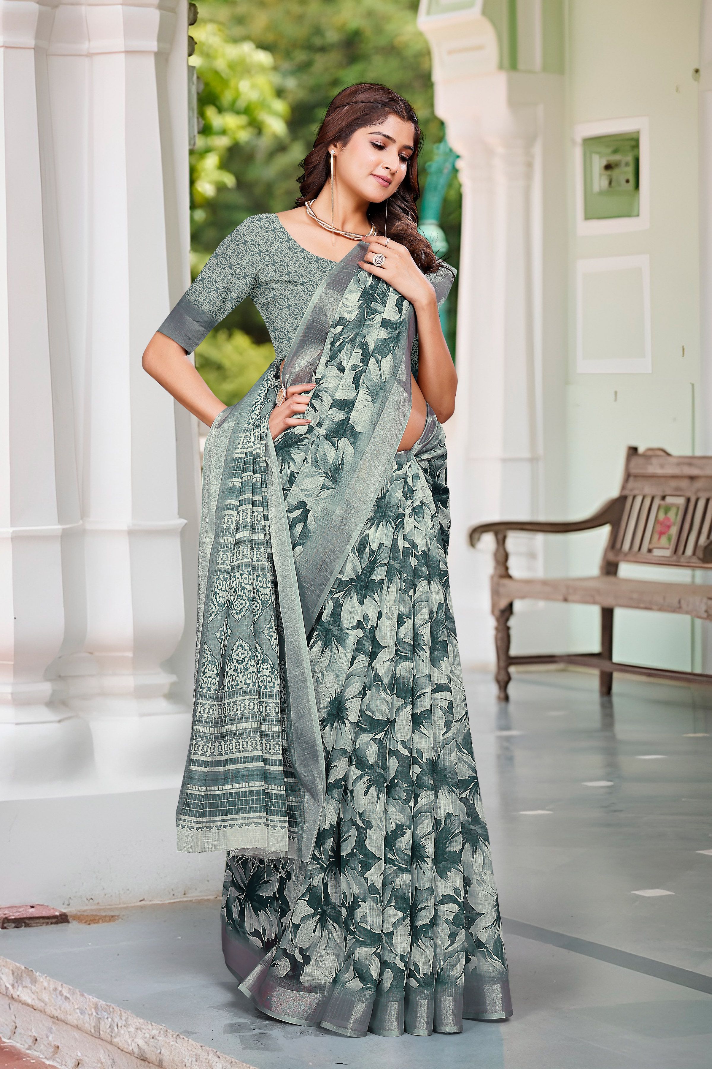 Garb These Festive Saree in Fine Colored.These Saree Are Linen Cotton And Blouse is Fabricated On Linen Cotton Pair.Its Beautified With Wevon Jari Border With Designer Digital Printed.