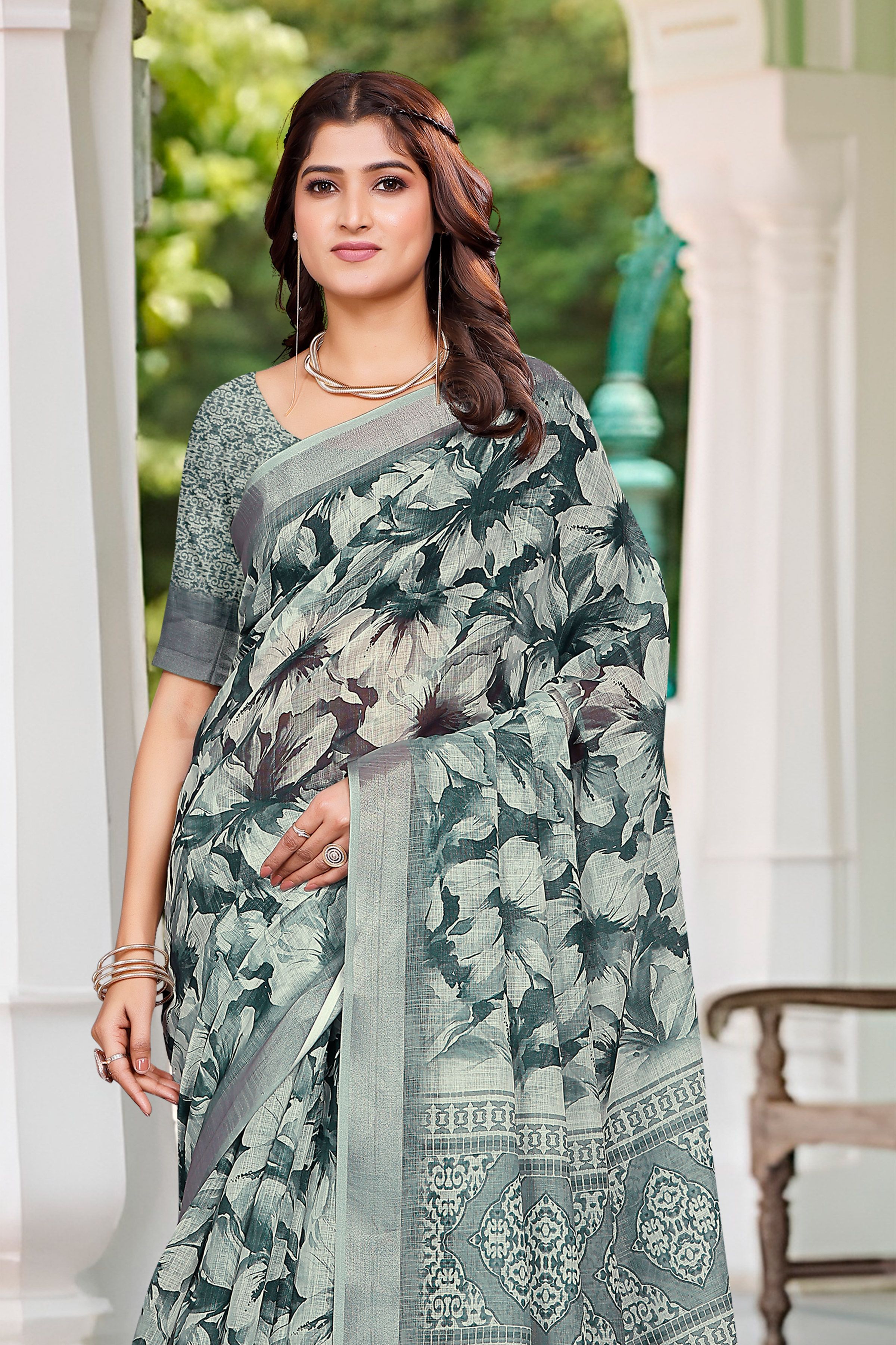 Green Color Linen Cotton Fabric Beautiful Festive Special Saree