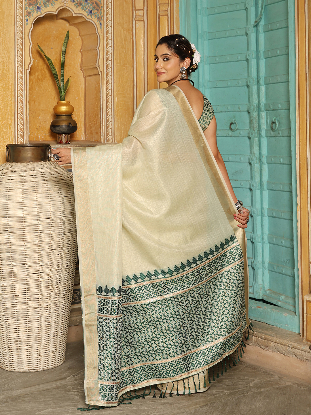 Green Color Linen Fabric Woven Designer Beautiful Fancy Saree