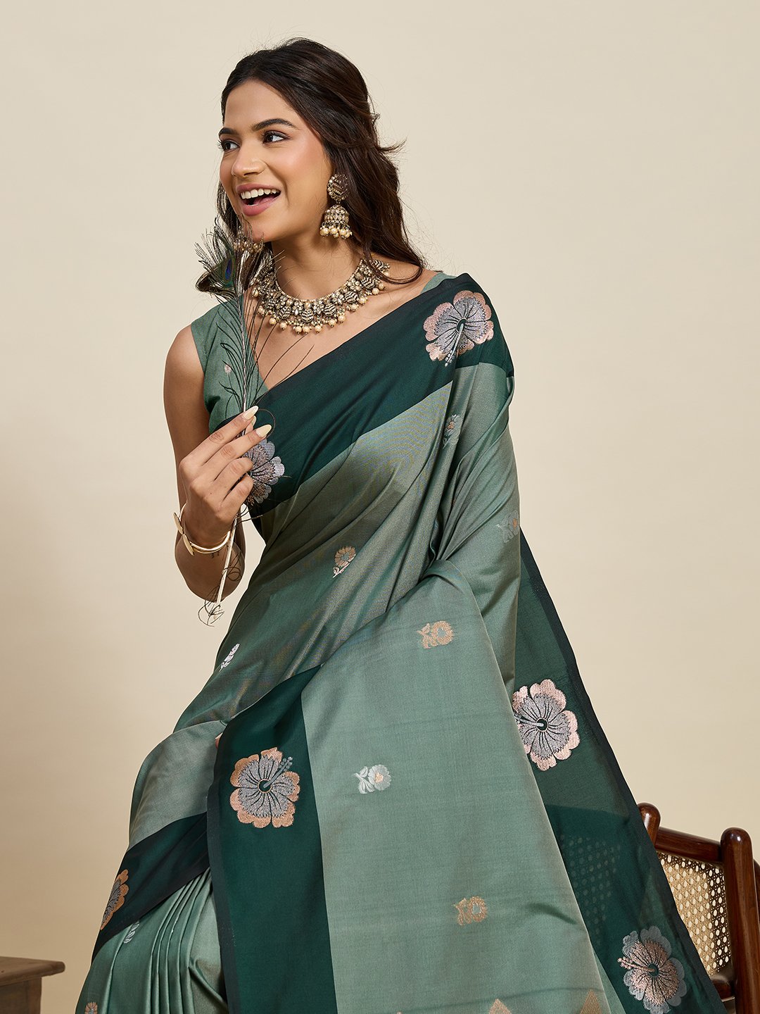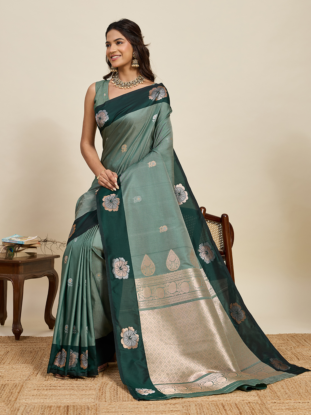 Green Color Soft Silk Fabric Woven Jari Designer Ethnic Indian Saree