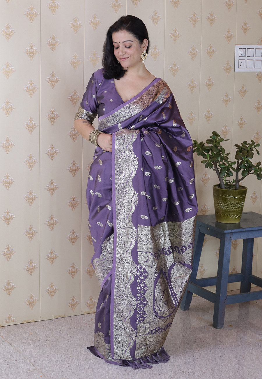 Grey Color Banarasi Silk Saree Woven Silver Jari Designer Ceremonial Partywear Saree