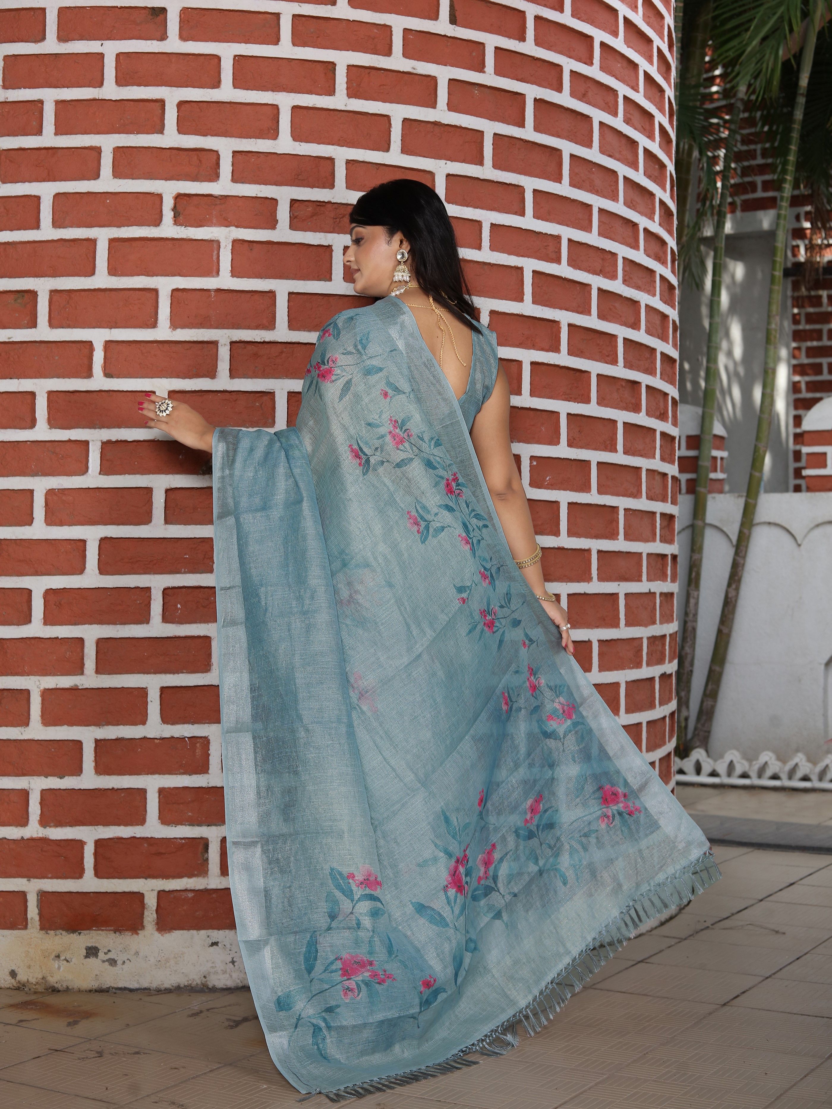 Grey Color Cotton Shimmer Fabric Designer Printed Ethnic Girlie Saree