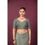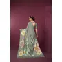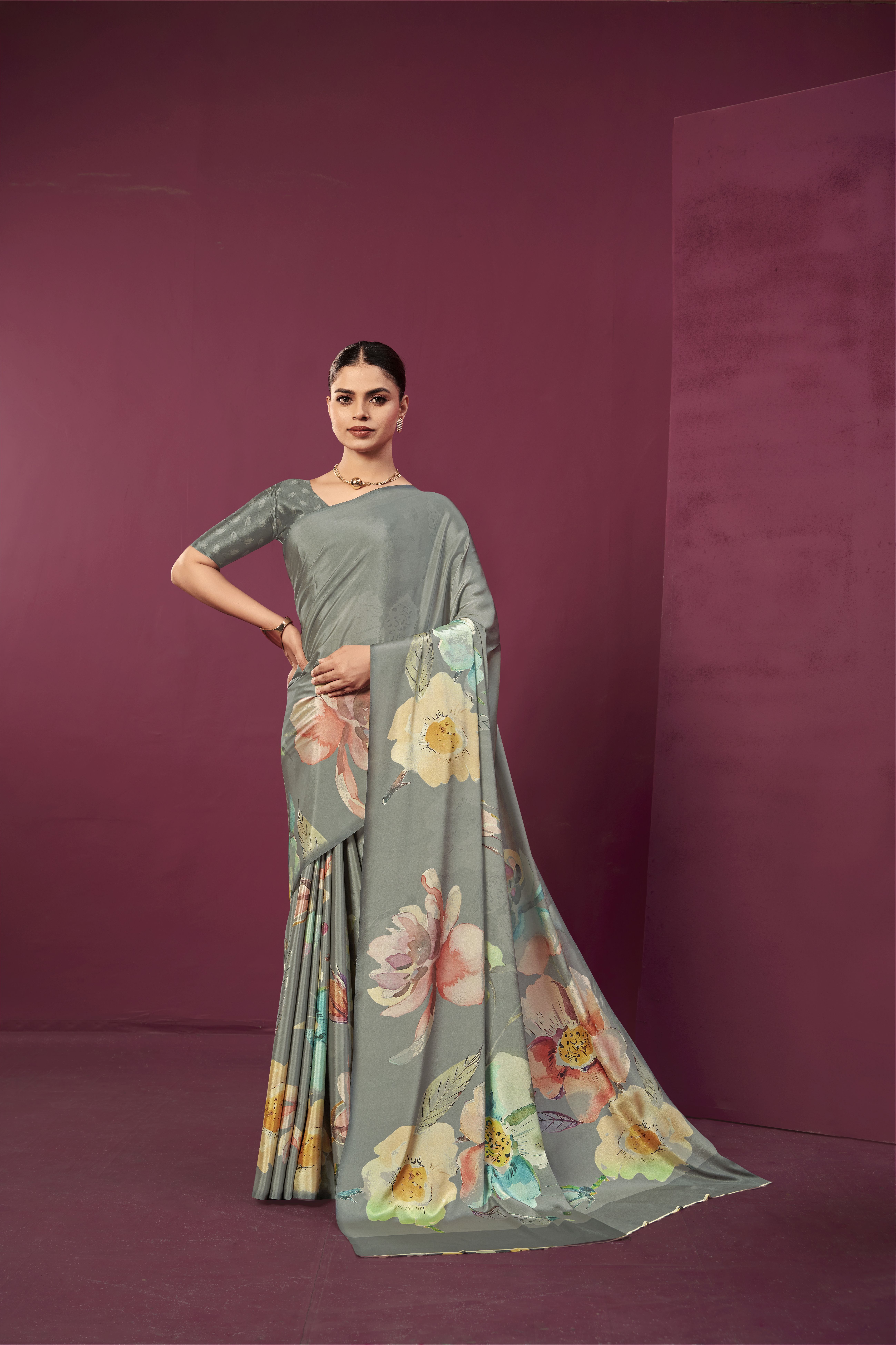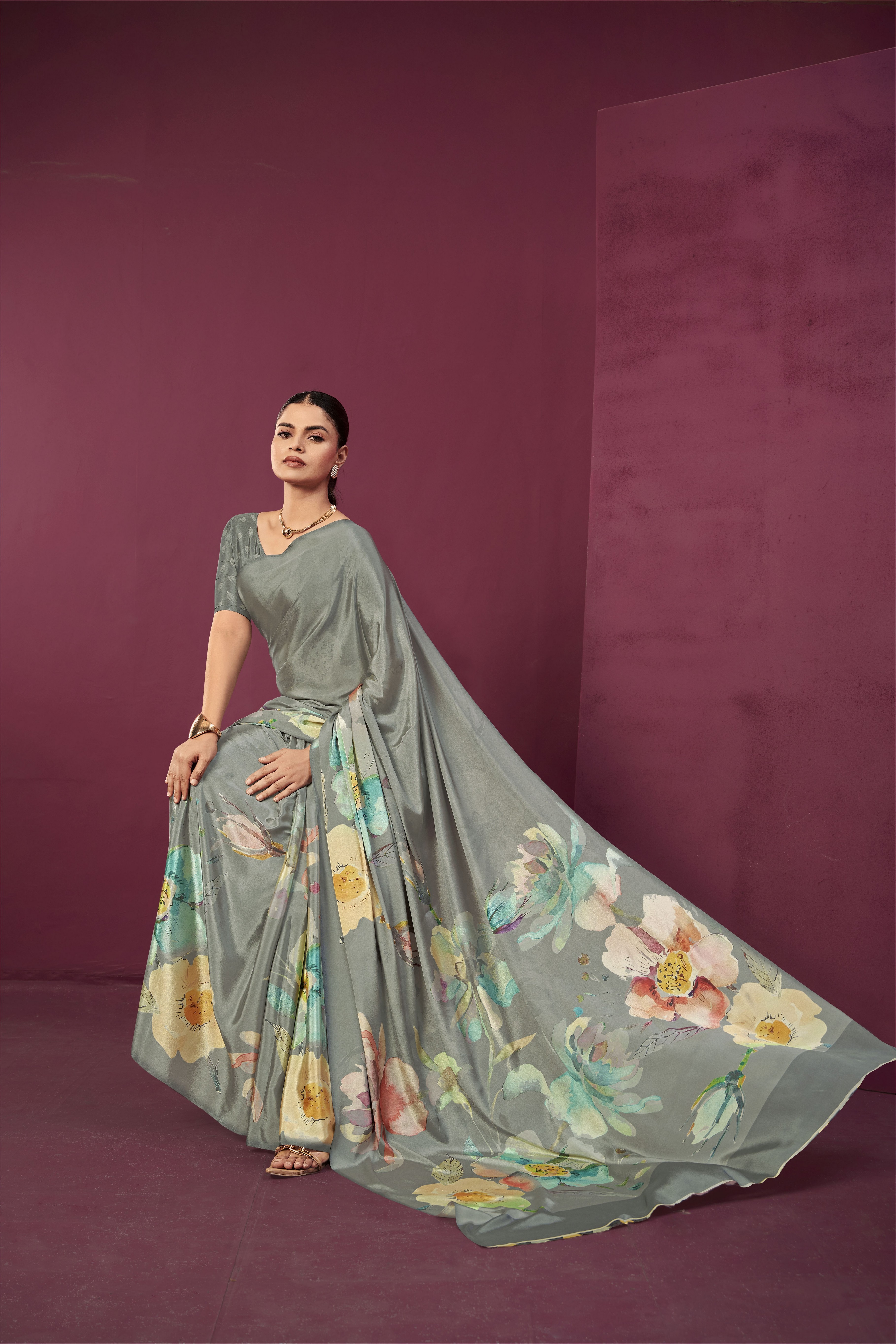 Grey Color Malai Crepe Silk Fabric Designer Digital Printed Ceremonial Partywear Saree