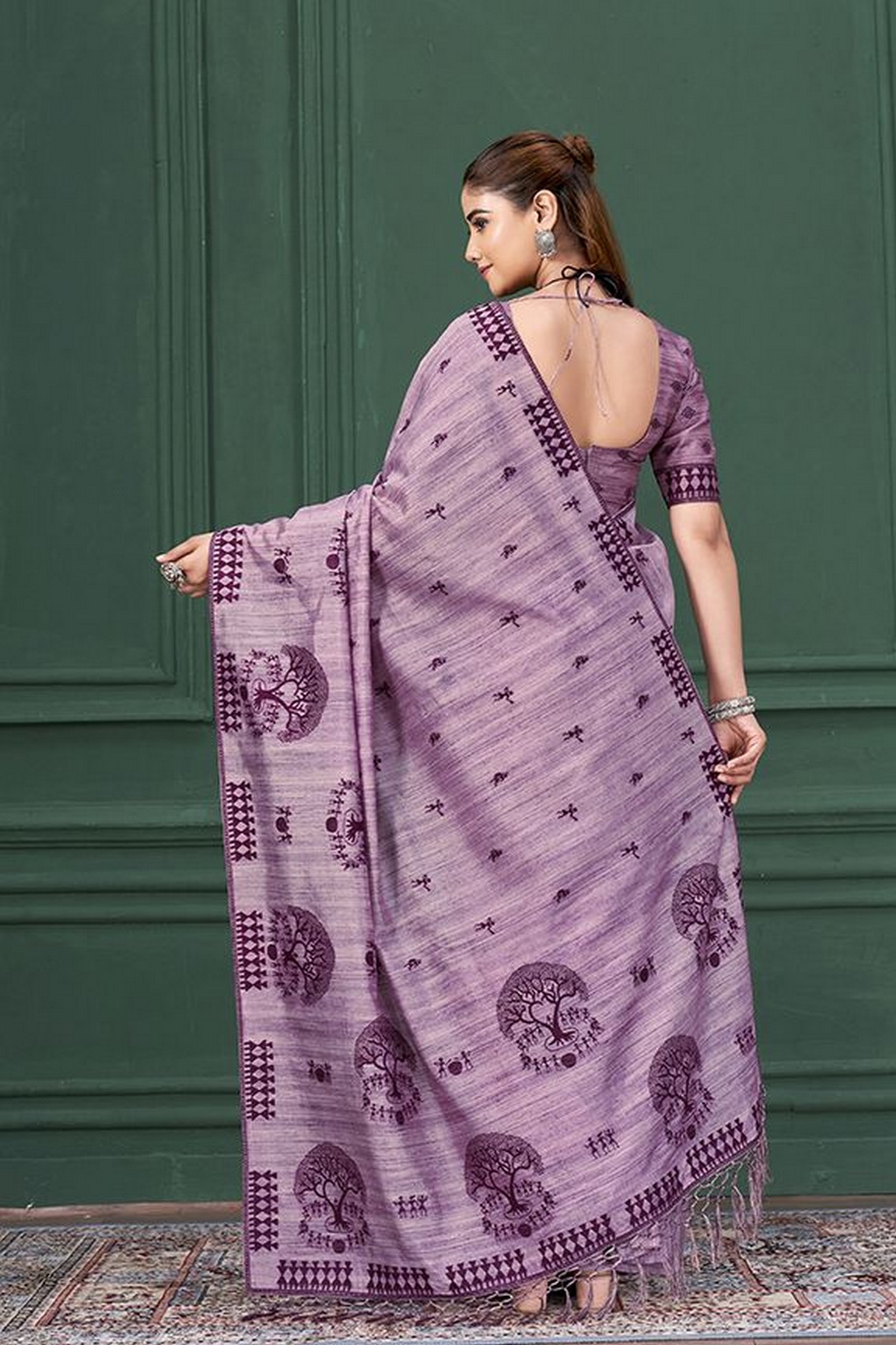 Lovender Color Warli Silk Fabric Warli Print Graceful Ceremonial Saree