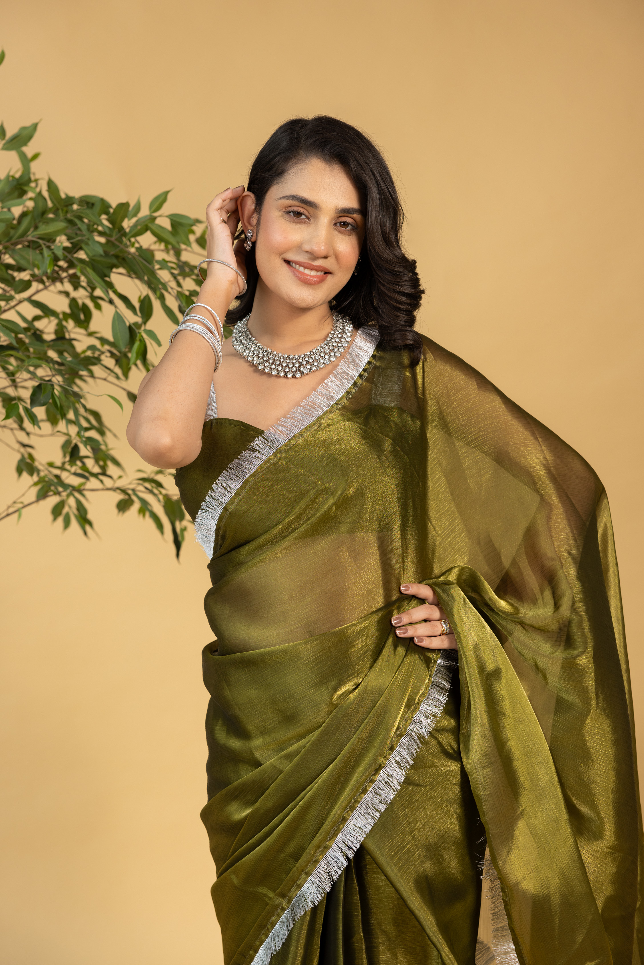 Mahendi Color Chiffon Fabric Ready To Wear Saree For Graceful Bollywood Style Saree