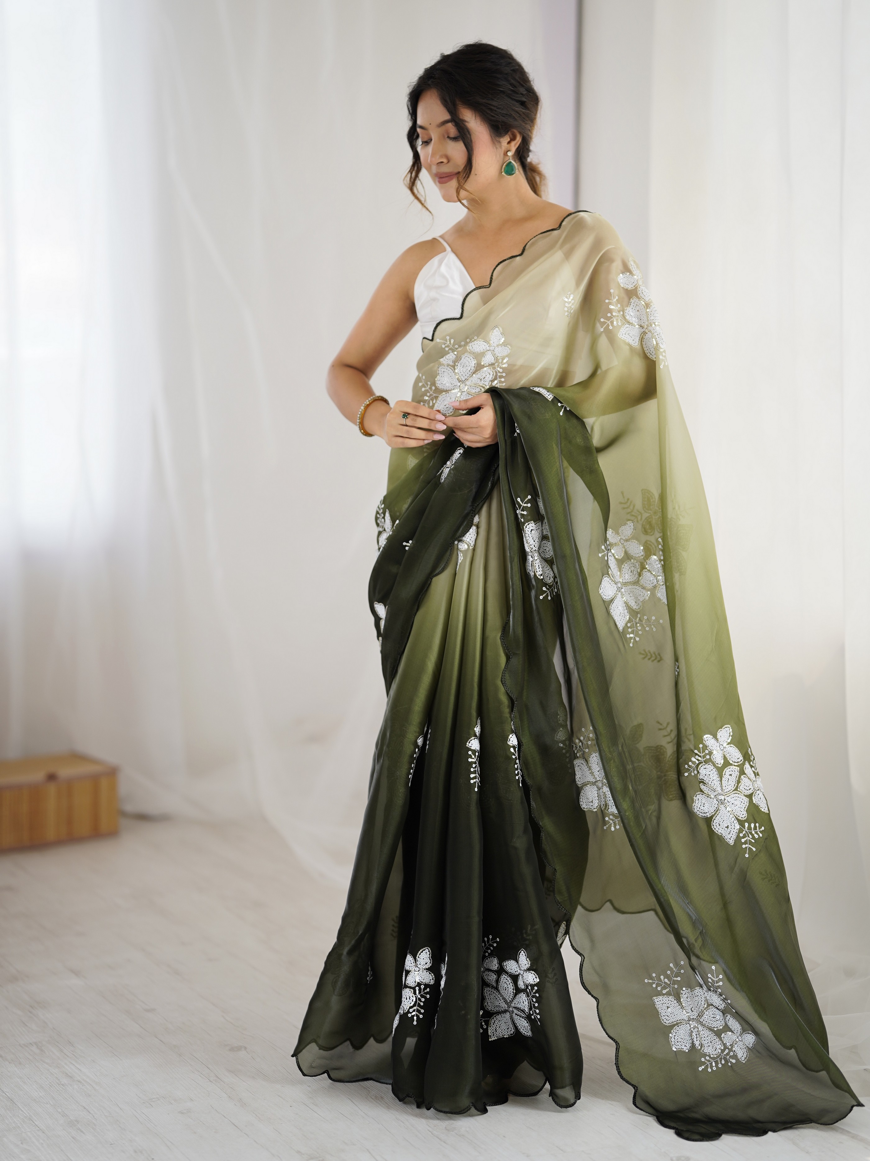 Mahendi Color Glamorous Jimmy Choo Fabric Beautiful Embroidered Saree