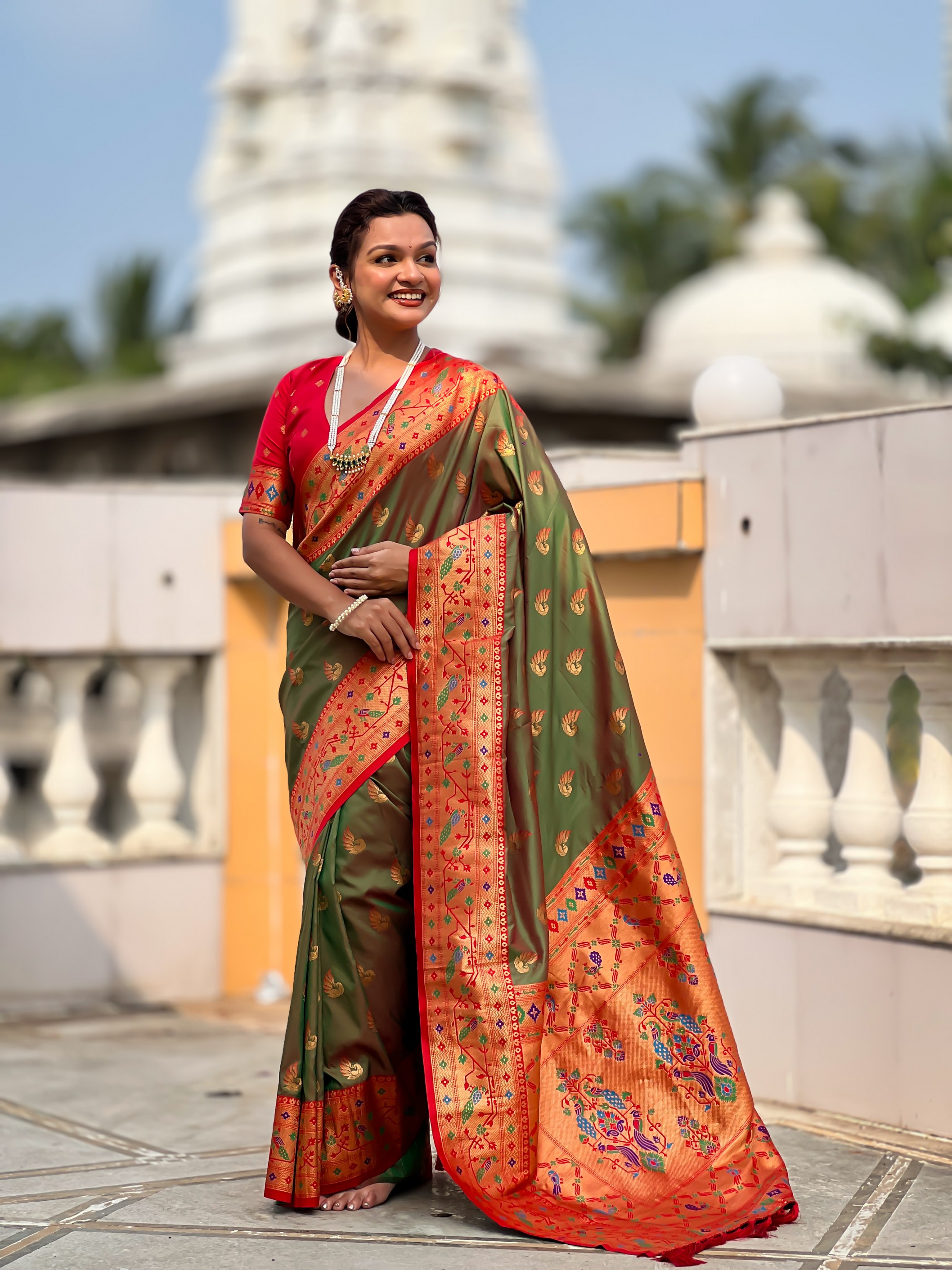 Mahendi Color Paithani Silk Woven Meenakari Jacquard Designer Saree