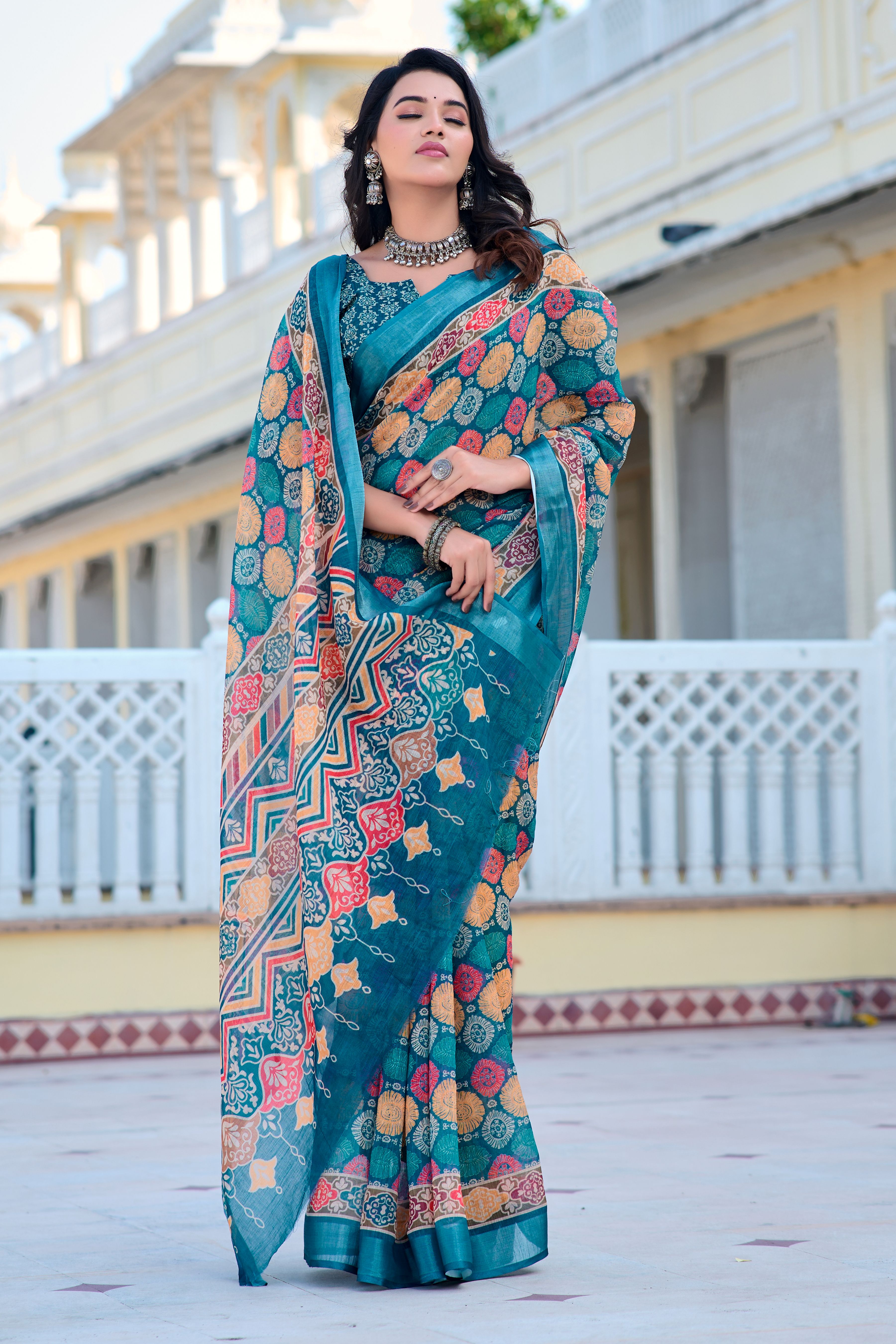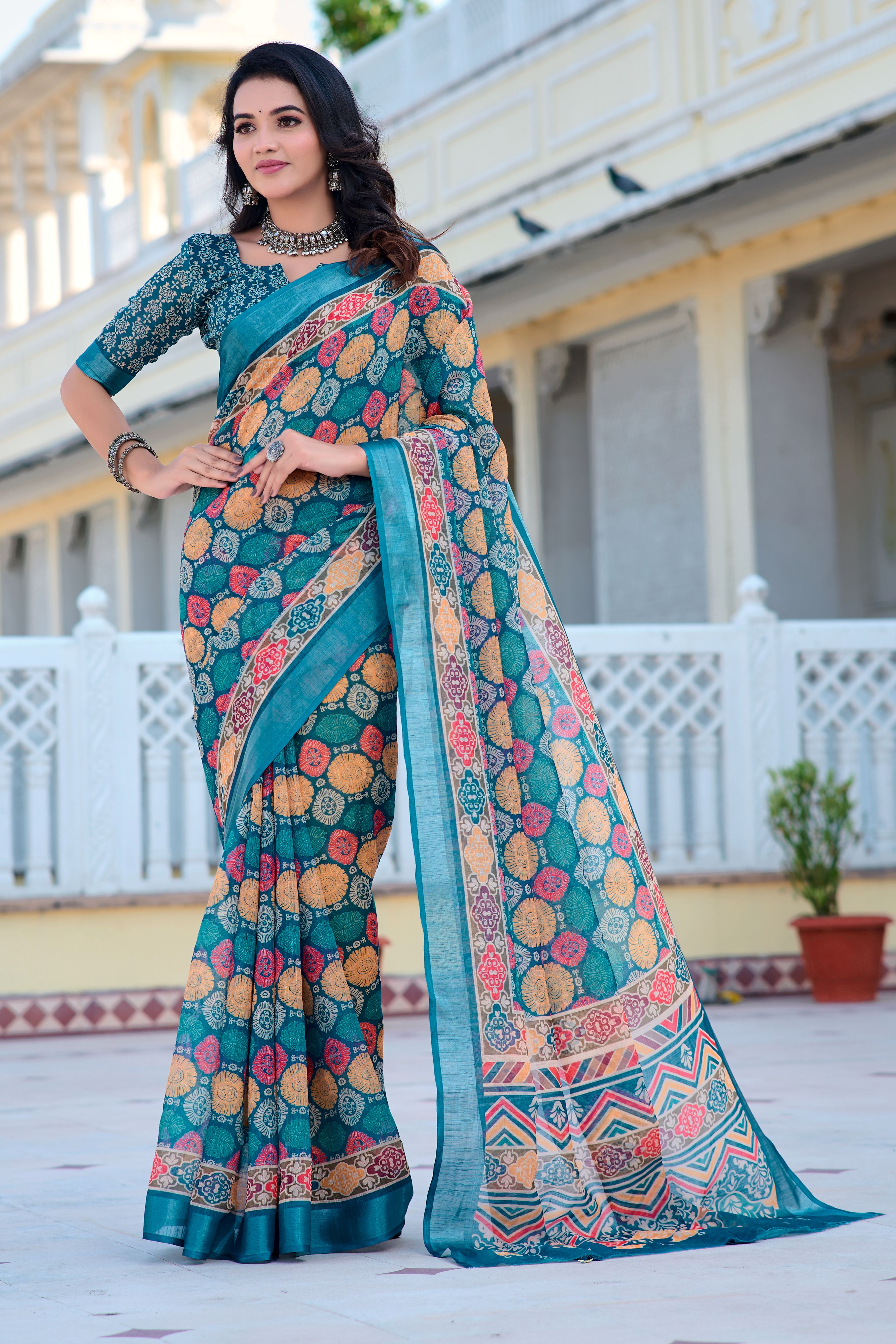 Multicolor Beautiful Linen Cotton Fabric Designer Festive Wear Saree