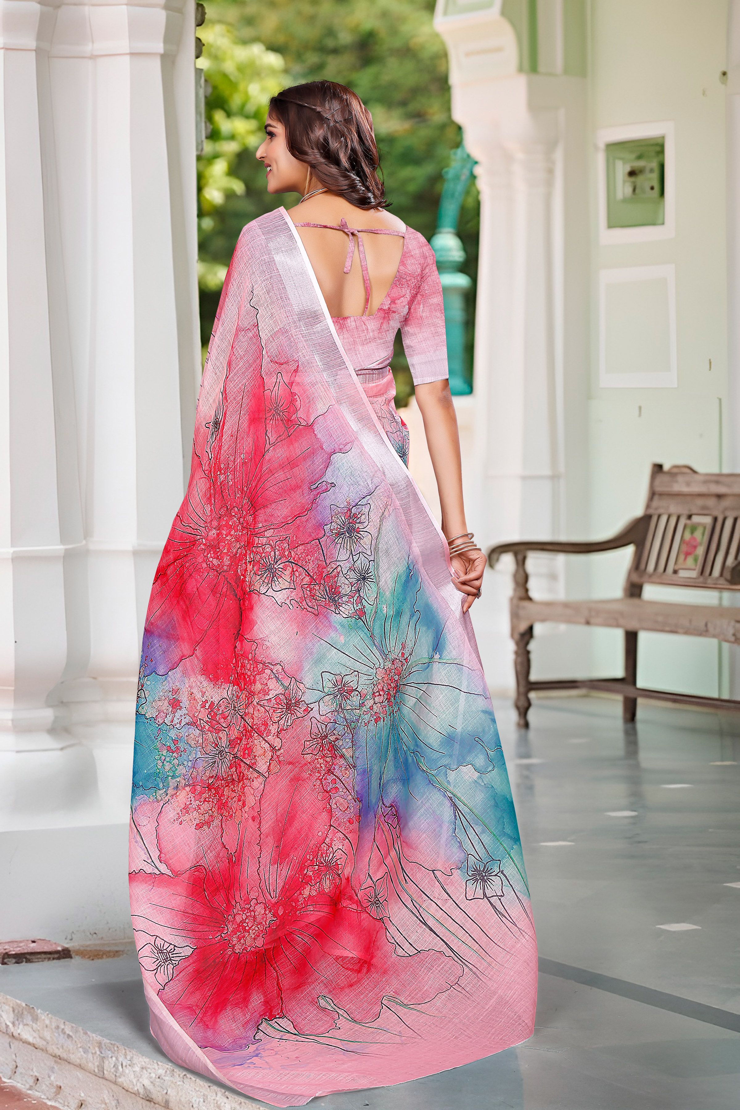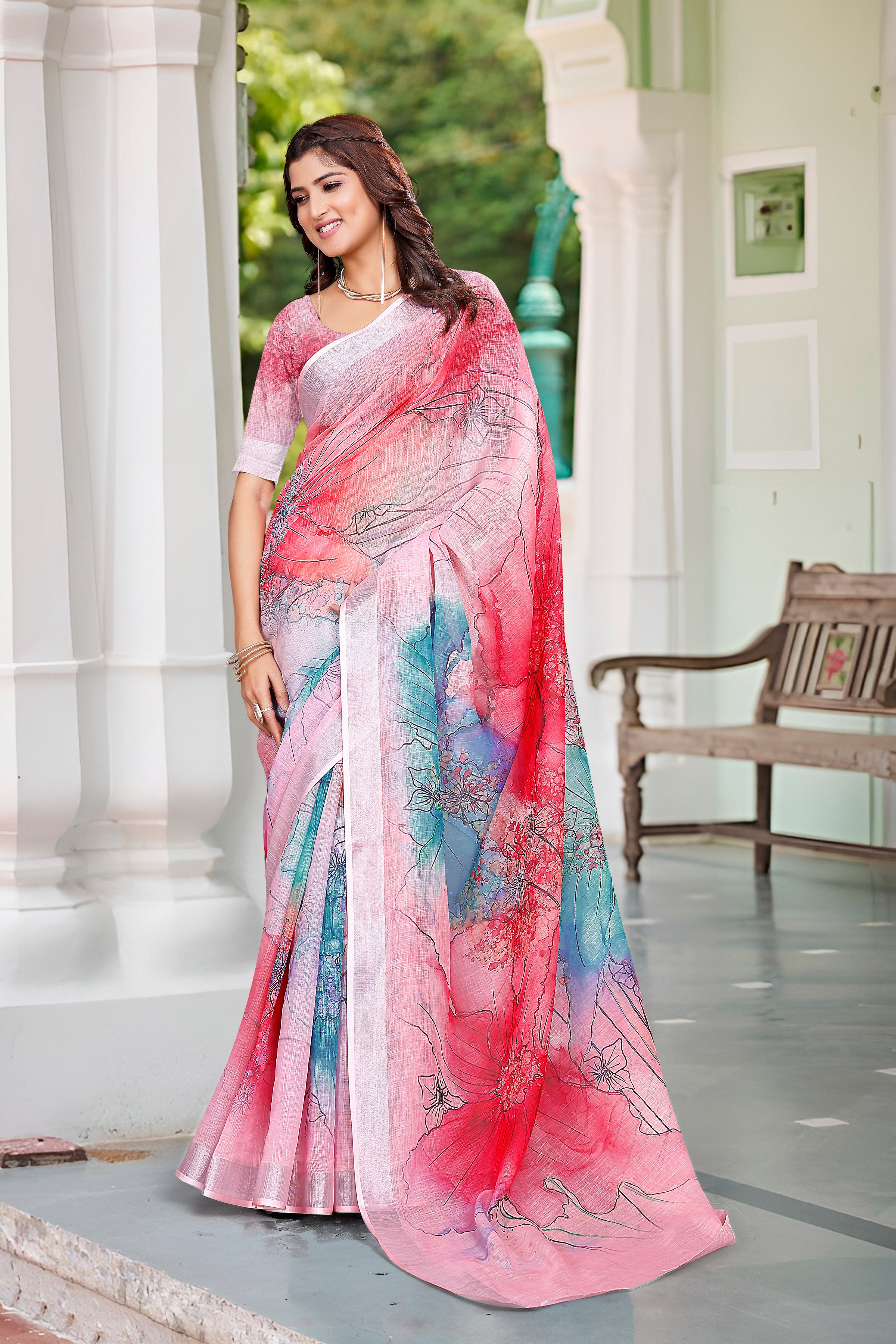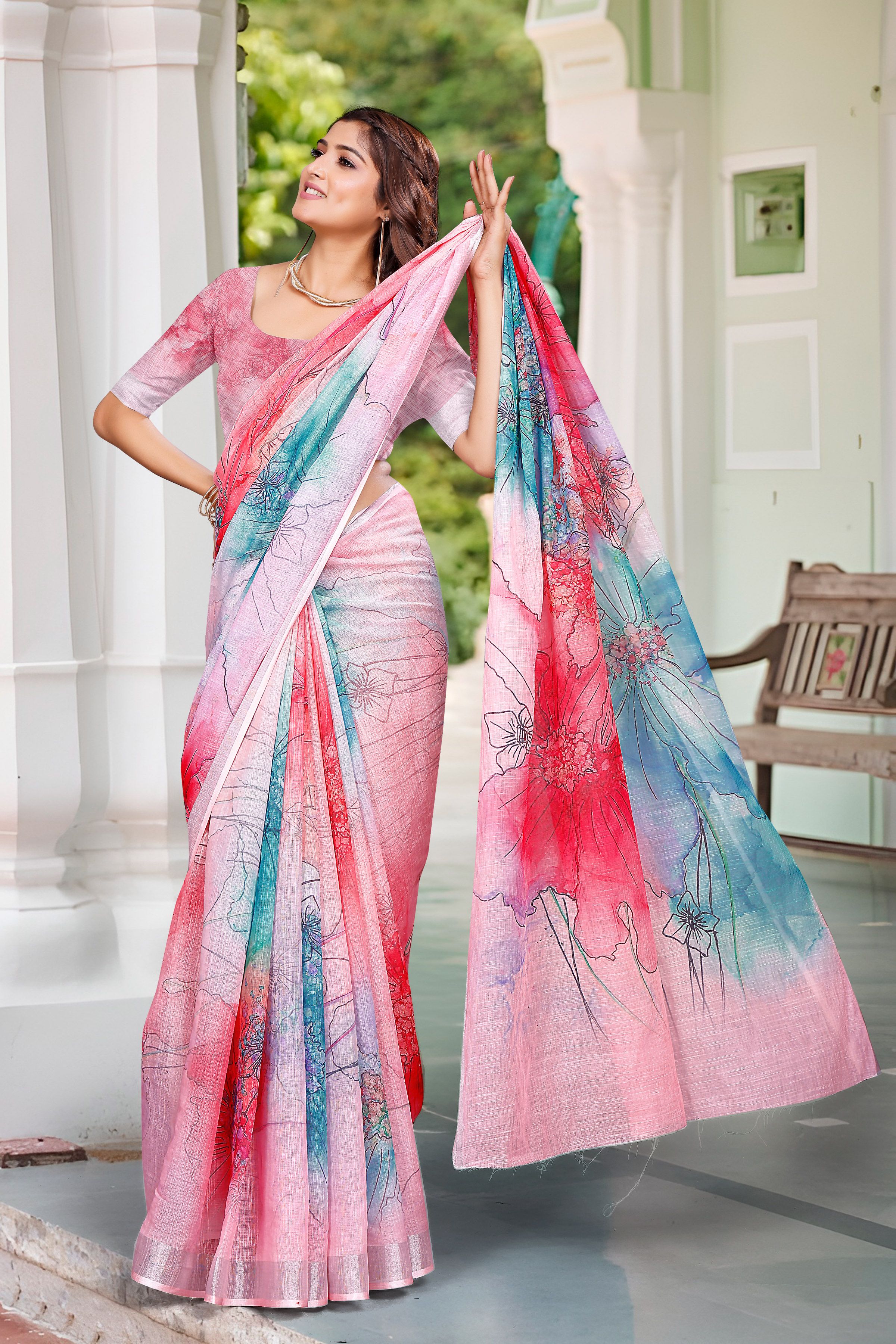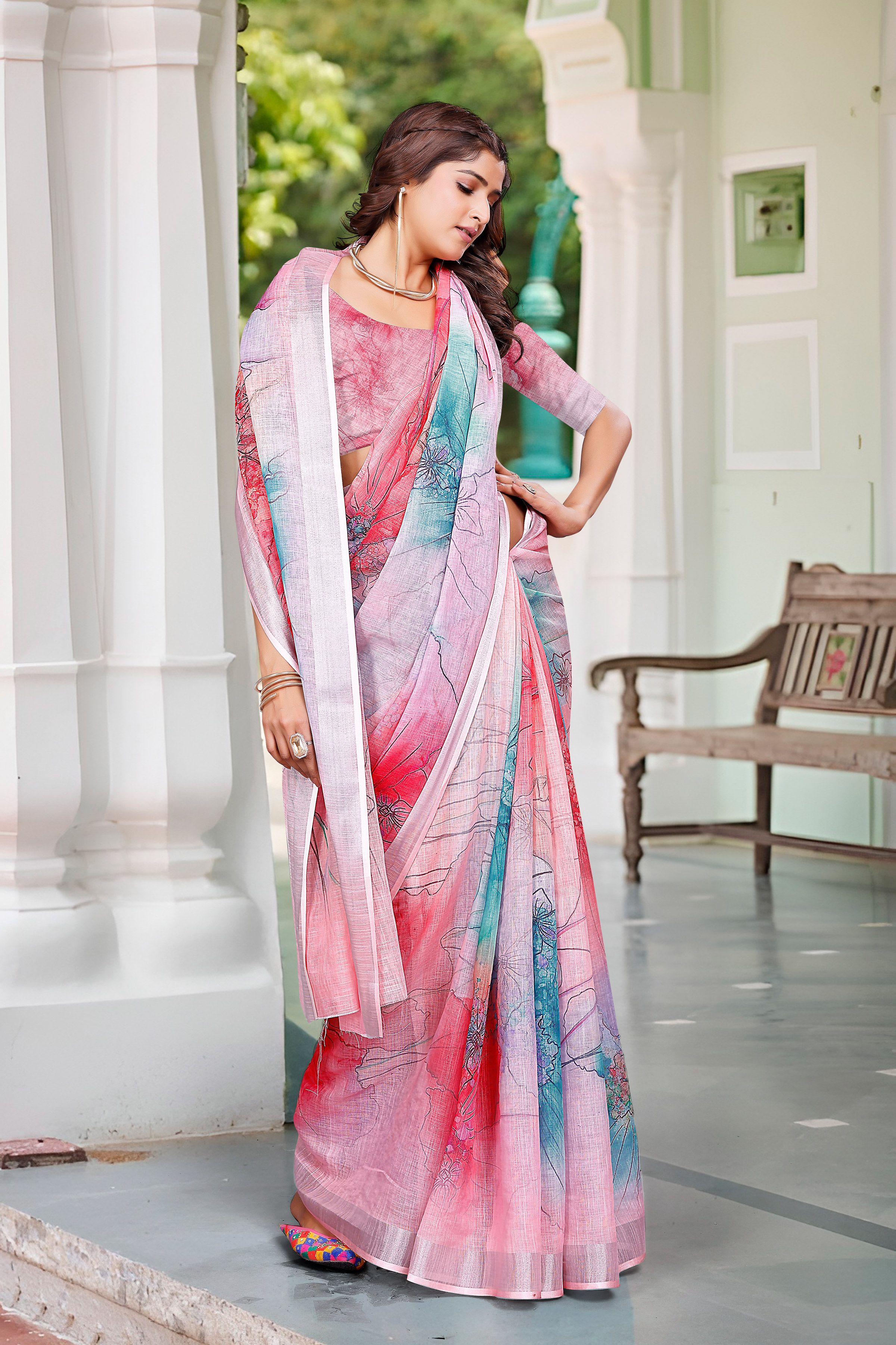 Multy Color Linen Cotton Fabric Beautiful Festive Special Saree