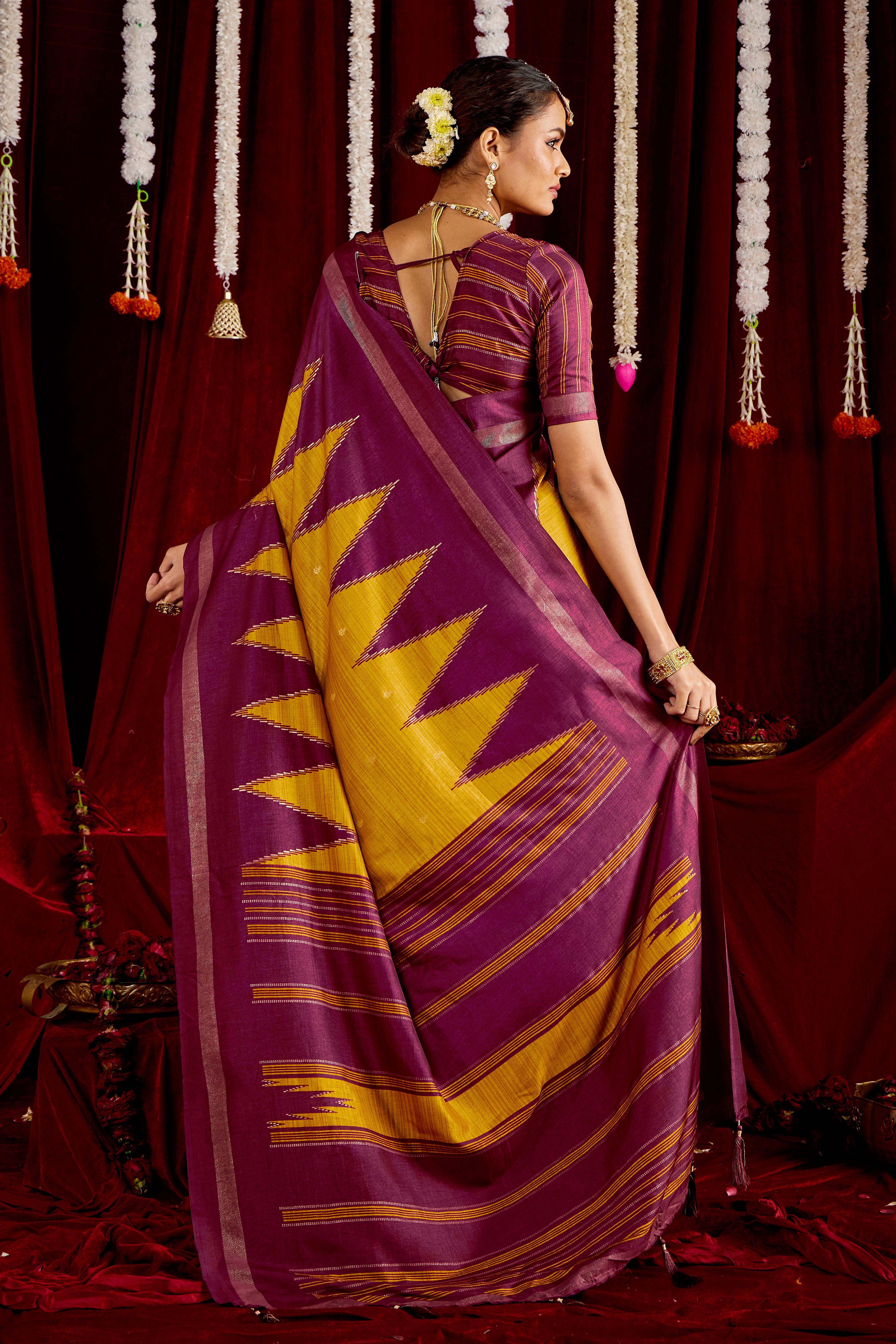 Mustard & Wine Color Ikkat Silk Fabric Designer Zig Zag Printed Traditional Party Looks Saree