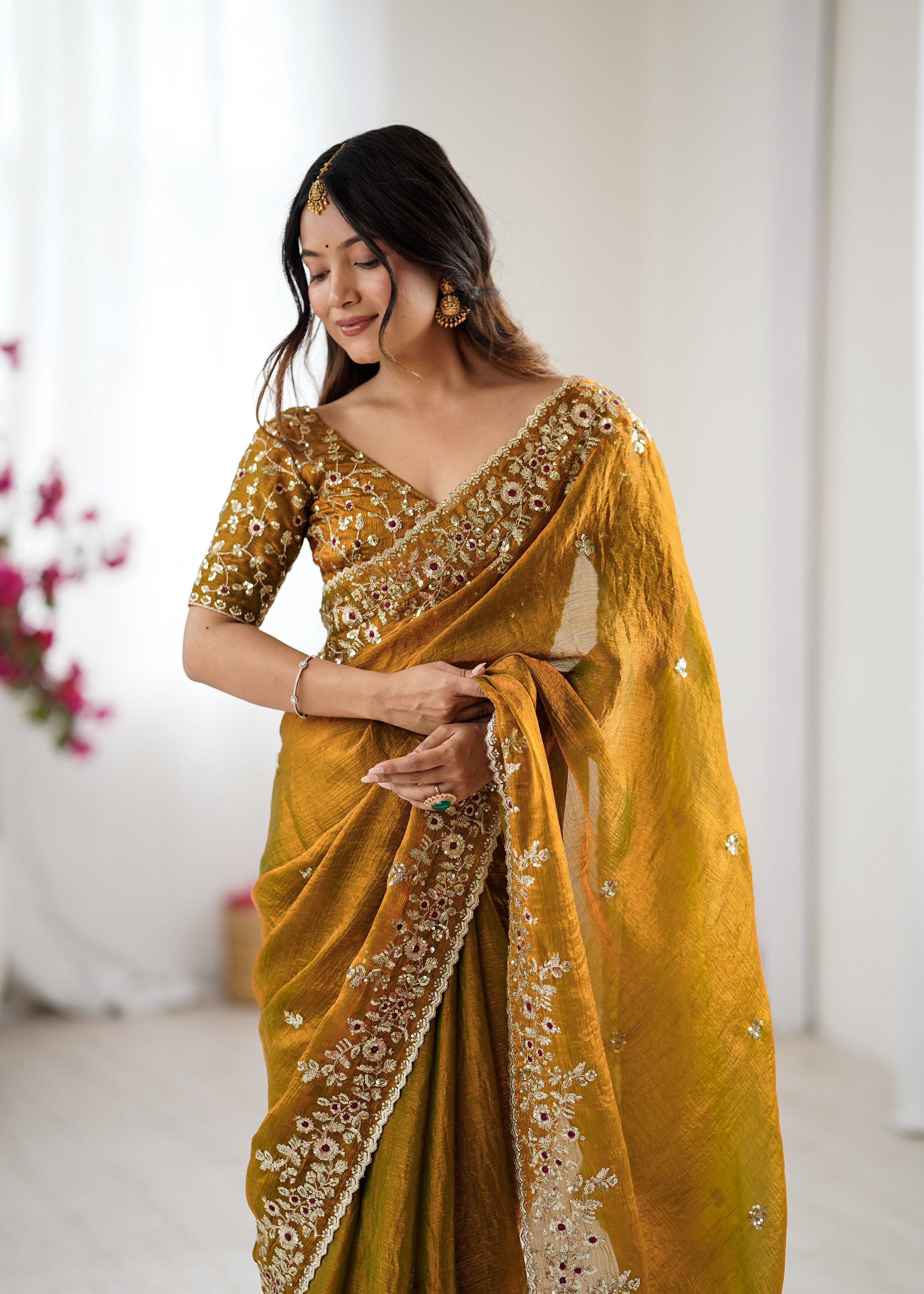 Mustard Color Trendy Fendy Chiffon Fabric Glamorous Partywear Saree