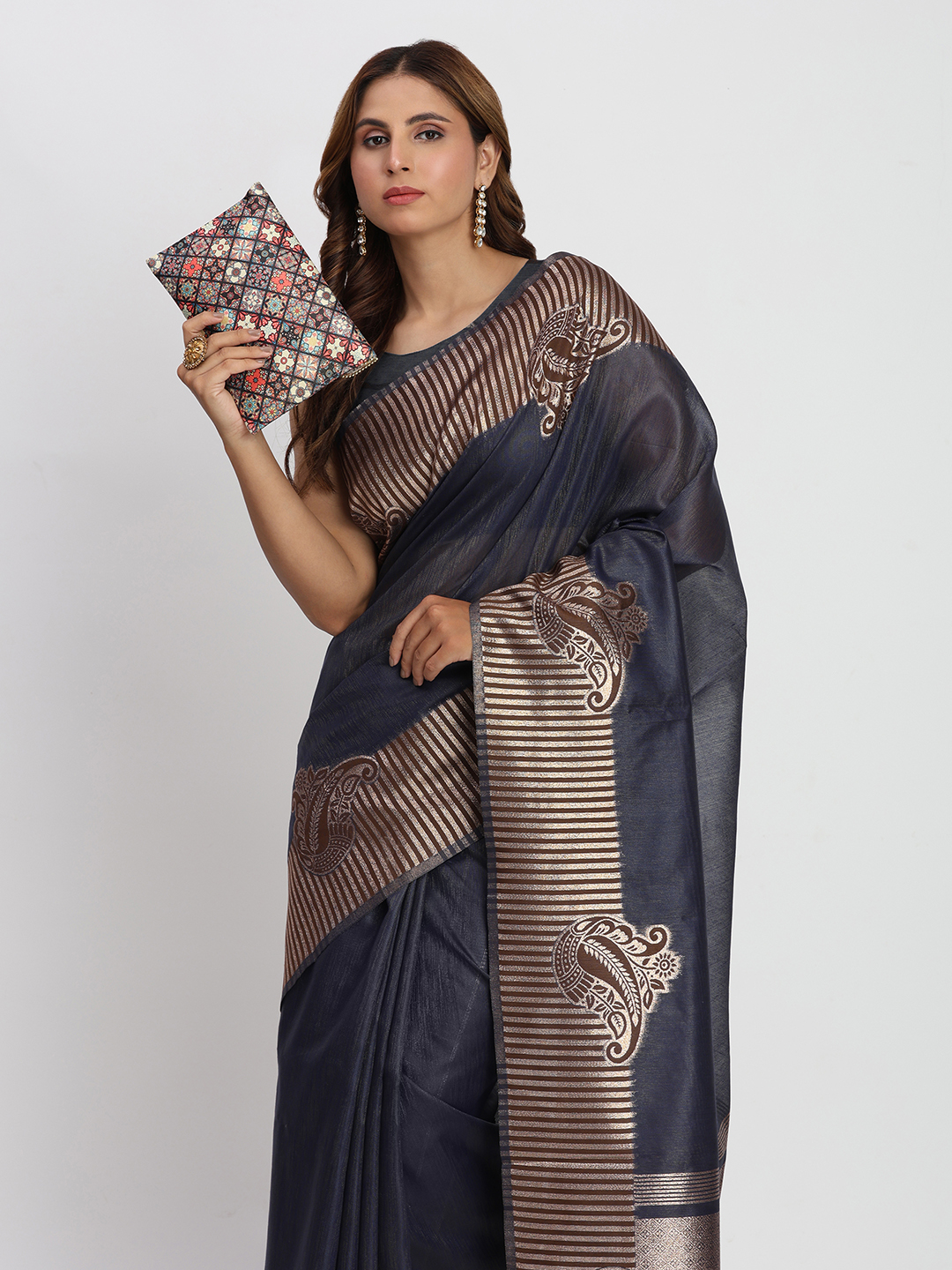 Navy Blue Color Linen Cotton Fabric Woven Galla Designer Traditional Partywear Saree