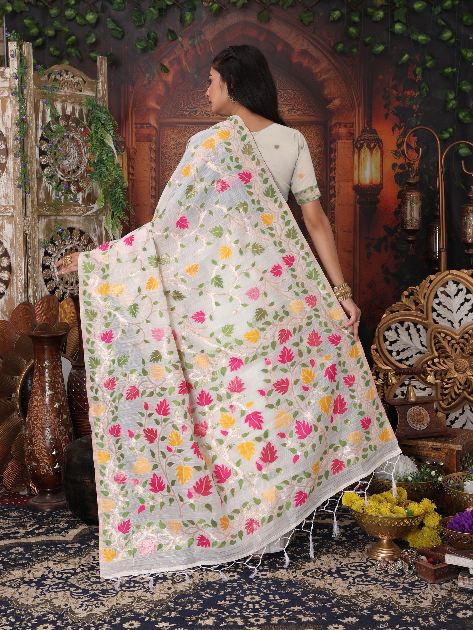 Off White Color Linen Cotton Fabric Woven Designer Partywear Saree