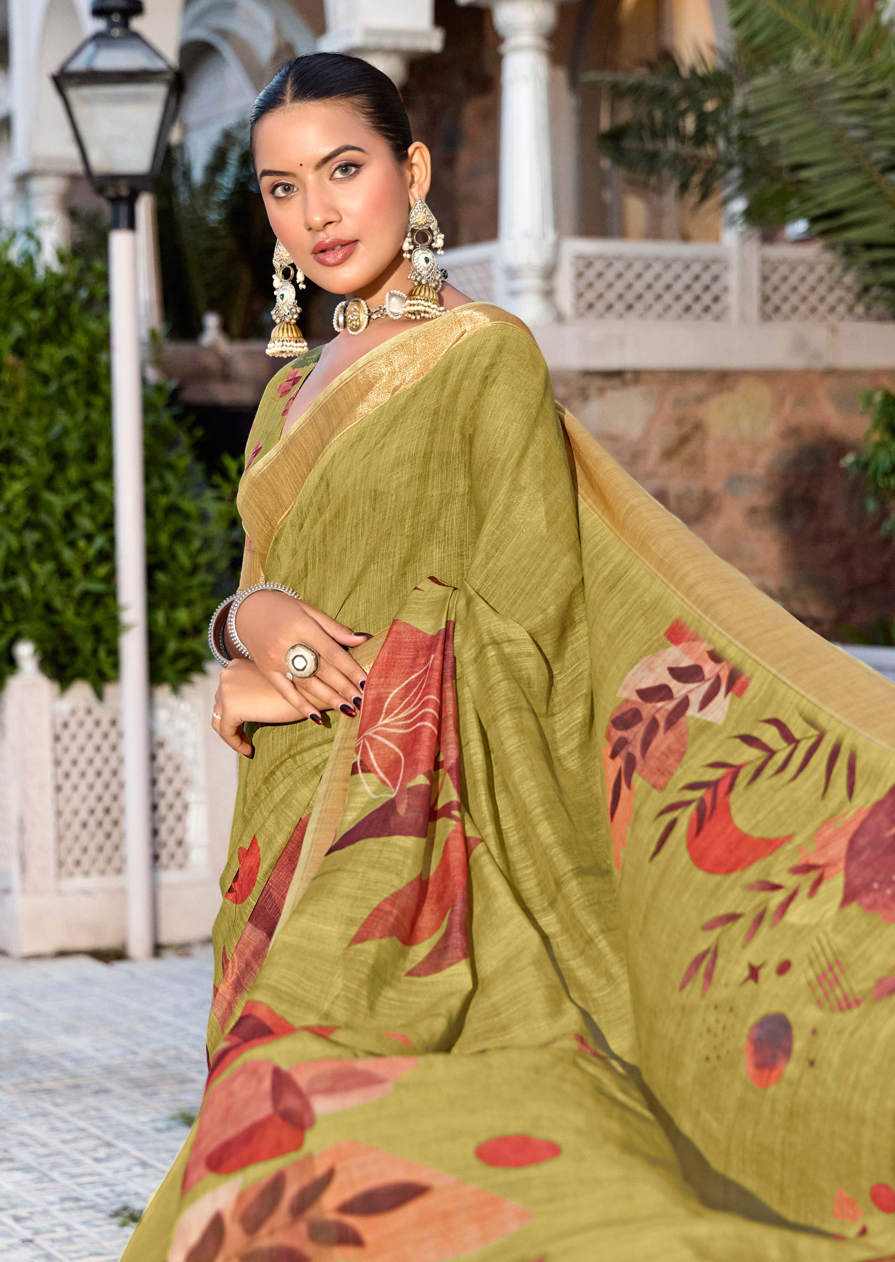 Olive Green Color Beautiful Linen Silk Fabric Saree With Sophisticated Partywear Saree