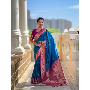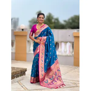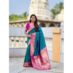 Rama Color Paithani Silk Fabric Woven...