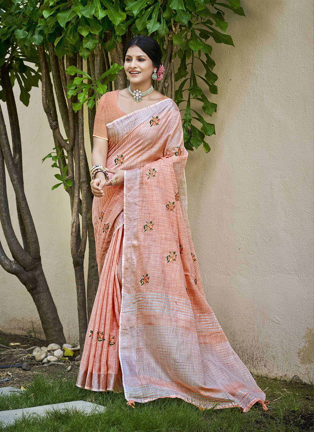 Peach Color Linen Fabric Beautifully Embroidered Ethnic Saree