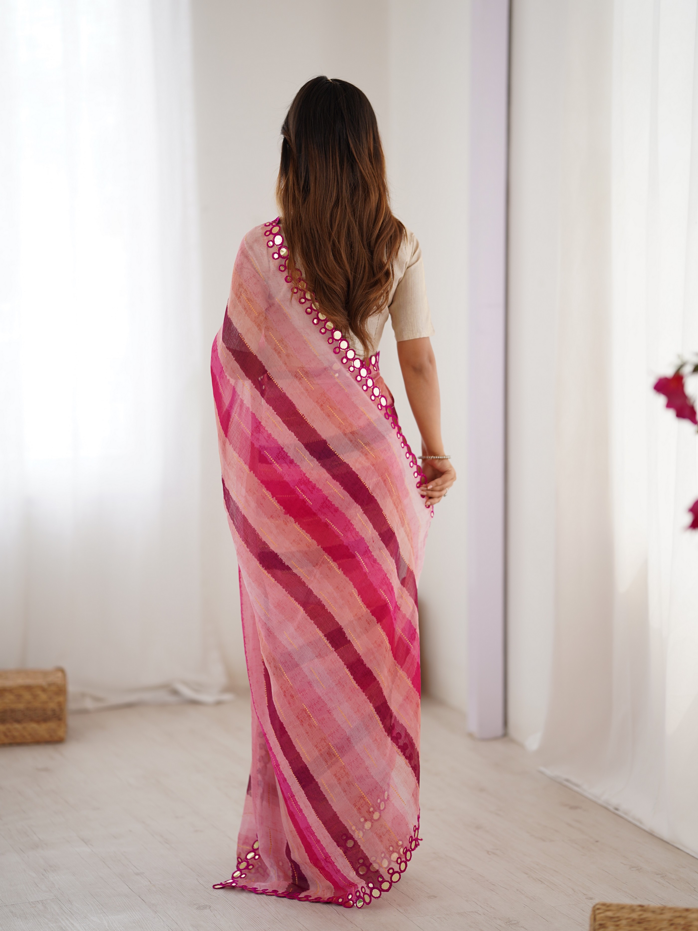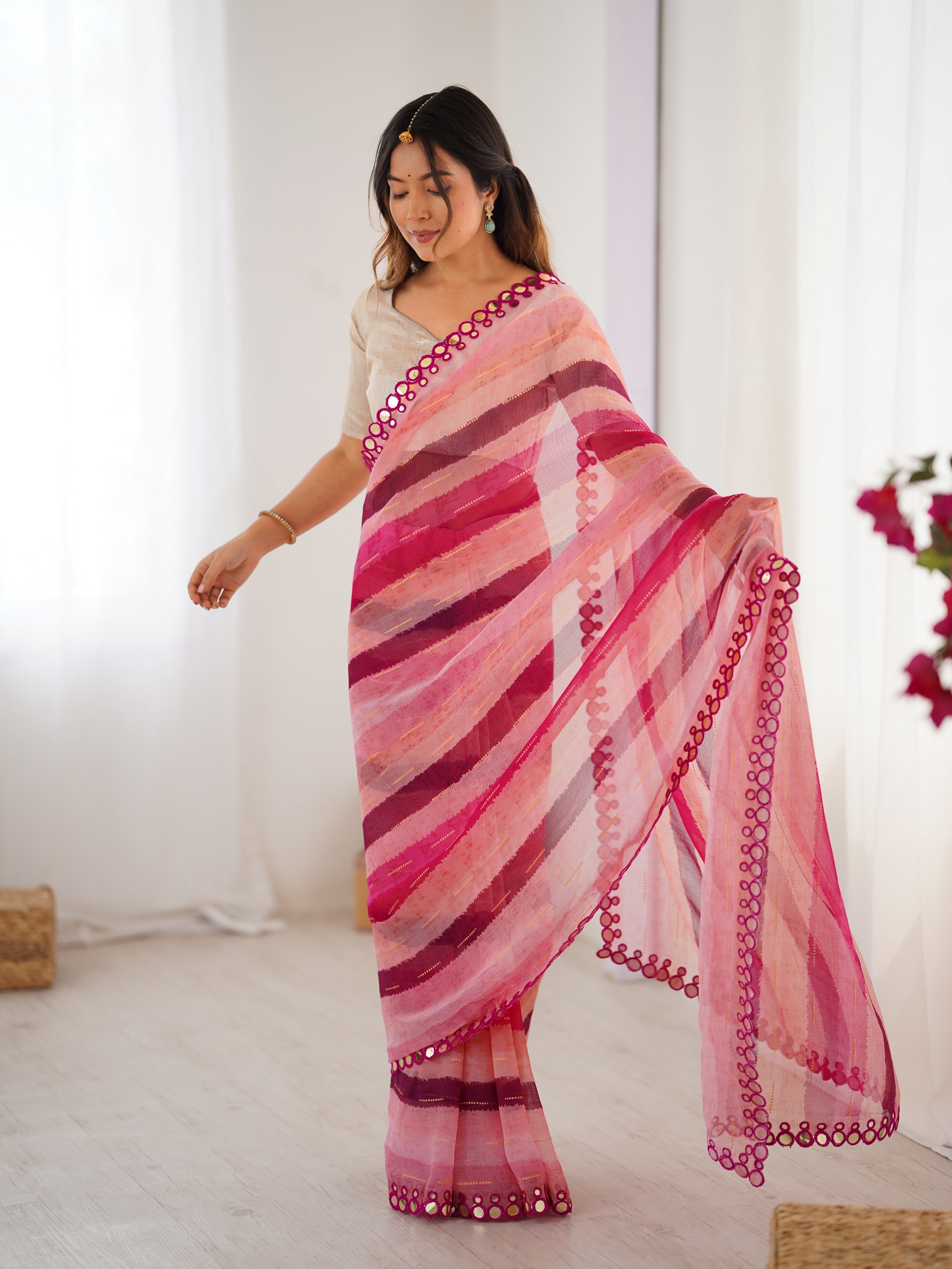 Pink Color Chiffon Fabric Designer Laheriya Printed Saree with Mirror Cut Work