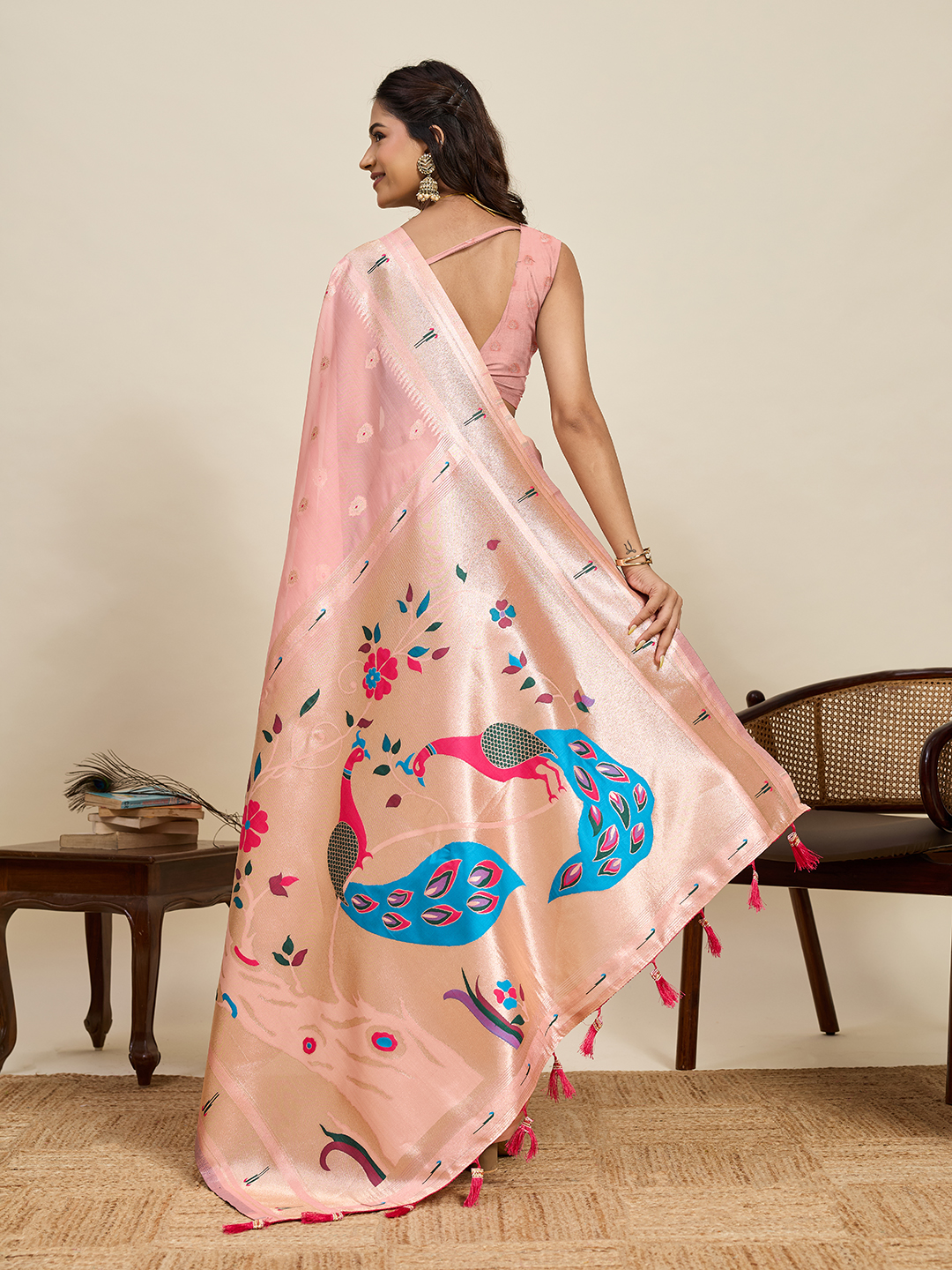 Garb This Party Wear Saree Paired With Blouse.This Saree And Blouse Are Cotton Silk Fabric With Woven Paithani Meenakari Designer. Buy This Pretty Saree Now.