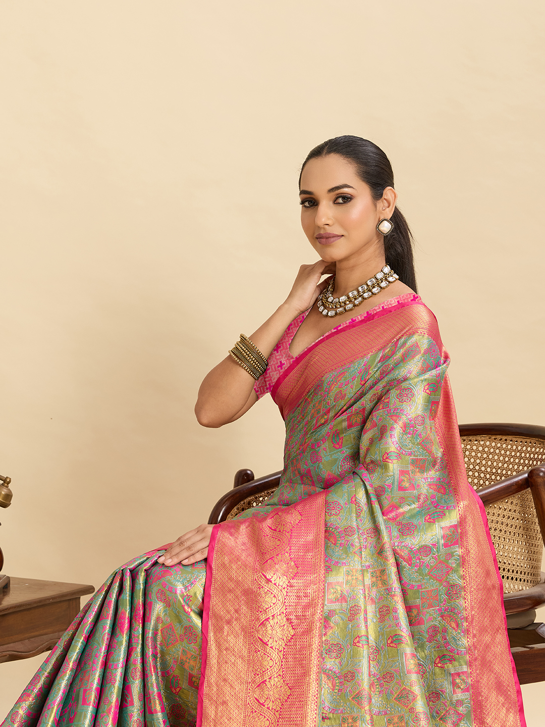 Looking This Party Wear Saree Paired With Blouse.This Saree And Blouse Are Silk Fabric With Woven Designer. Buy This Pretty Saree Now.