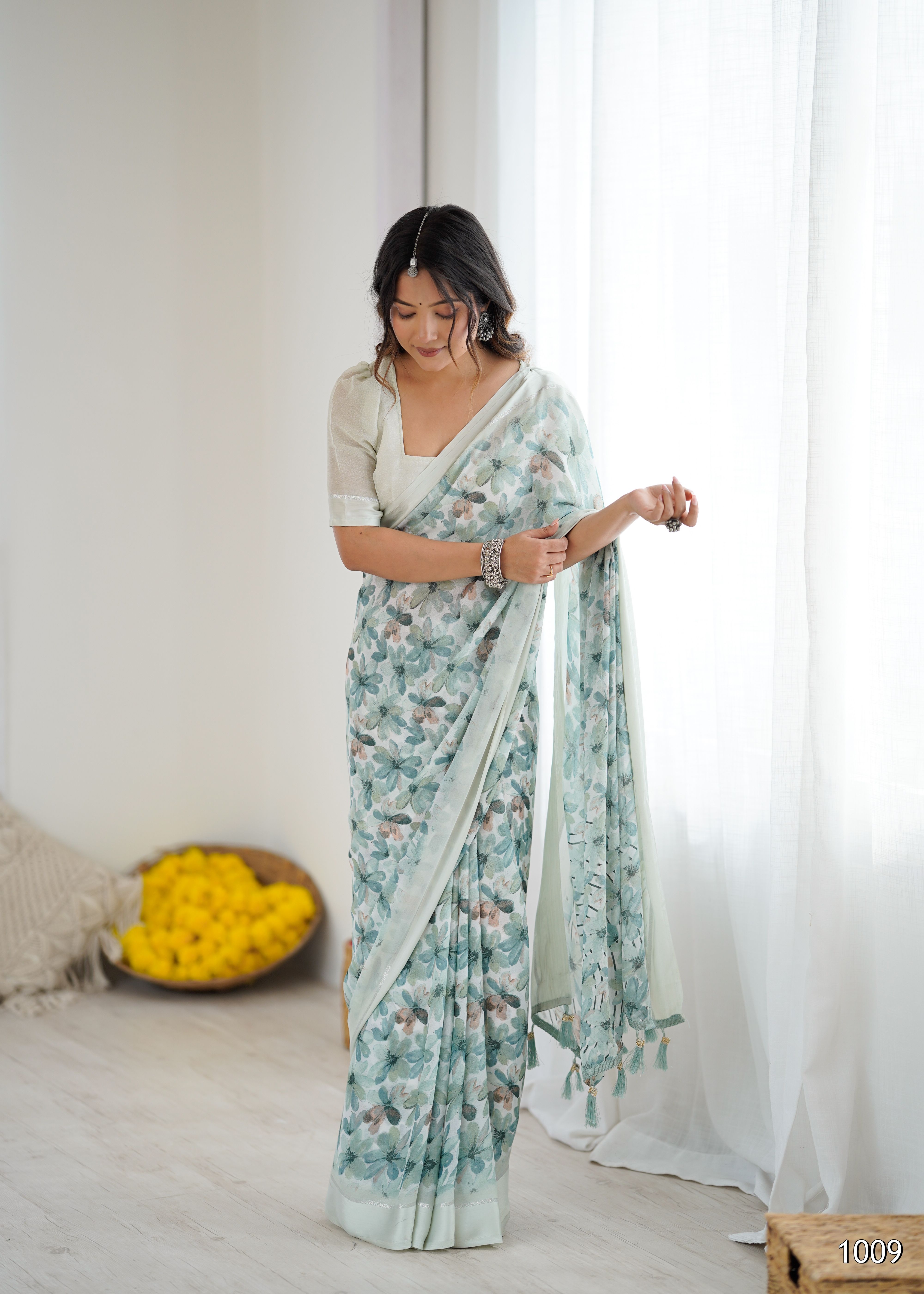 Pista Color Ethnic Printed Georgette Fabric Girlie Partywear Saree