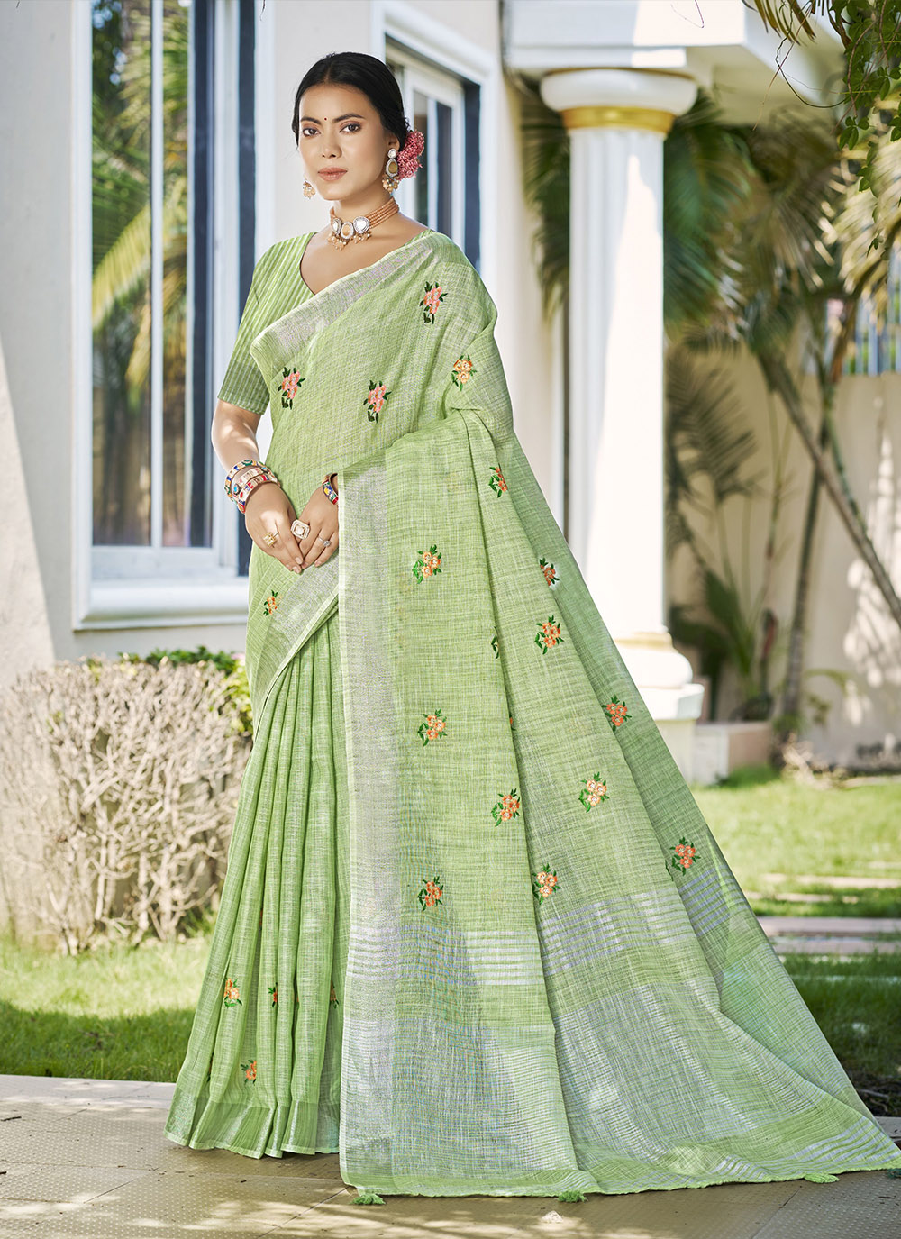Pista Color Linen Fabric Beautifully Embroidered Ethnic Saree
