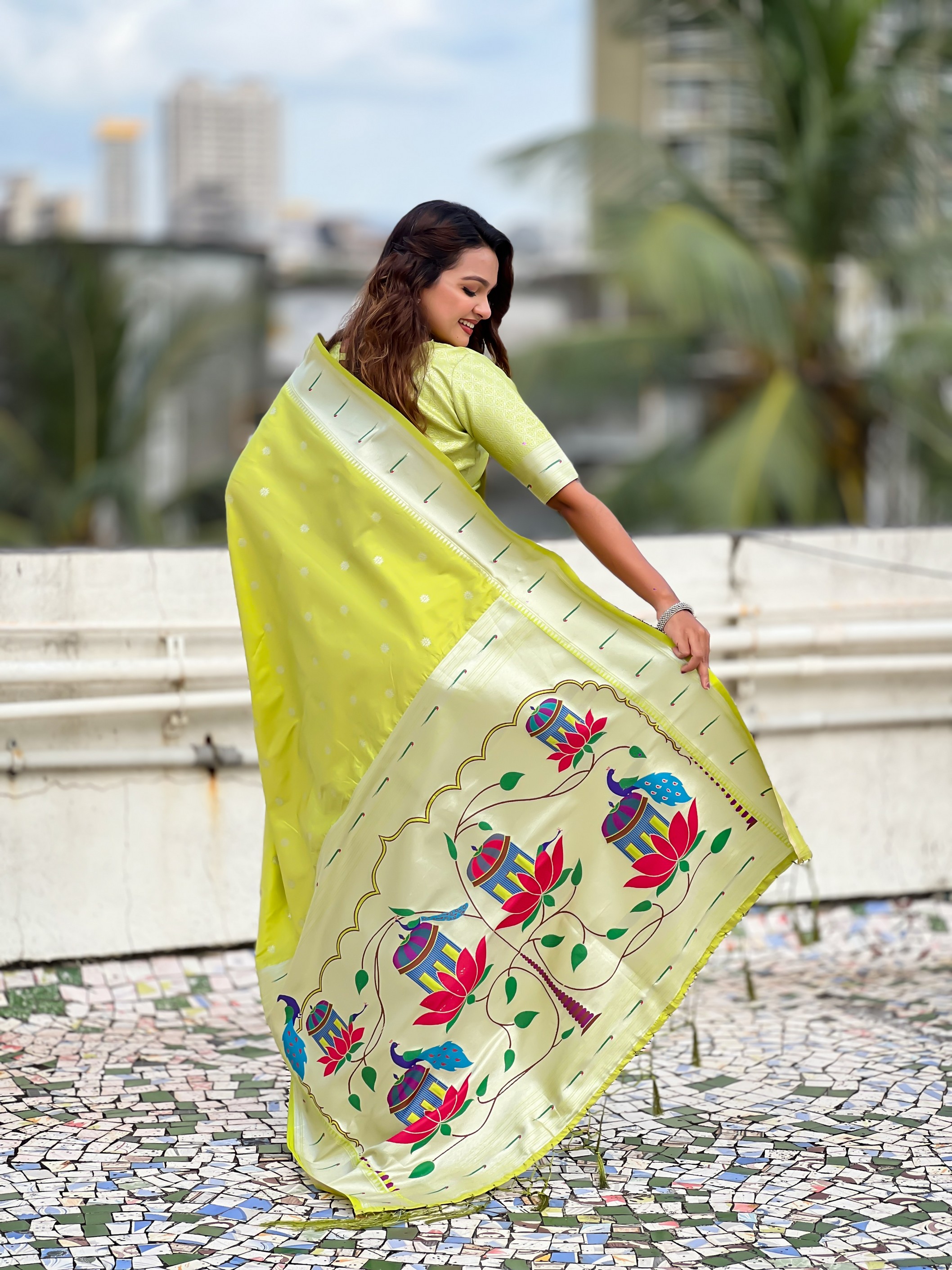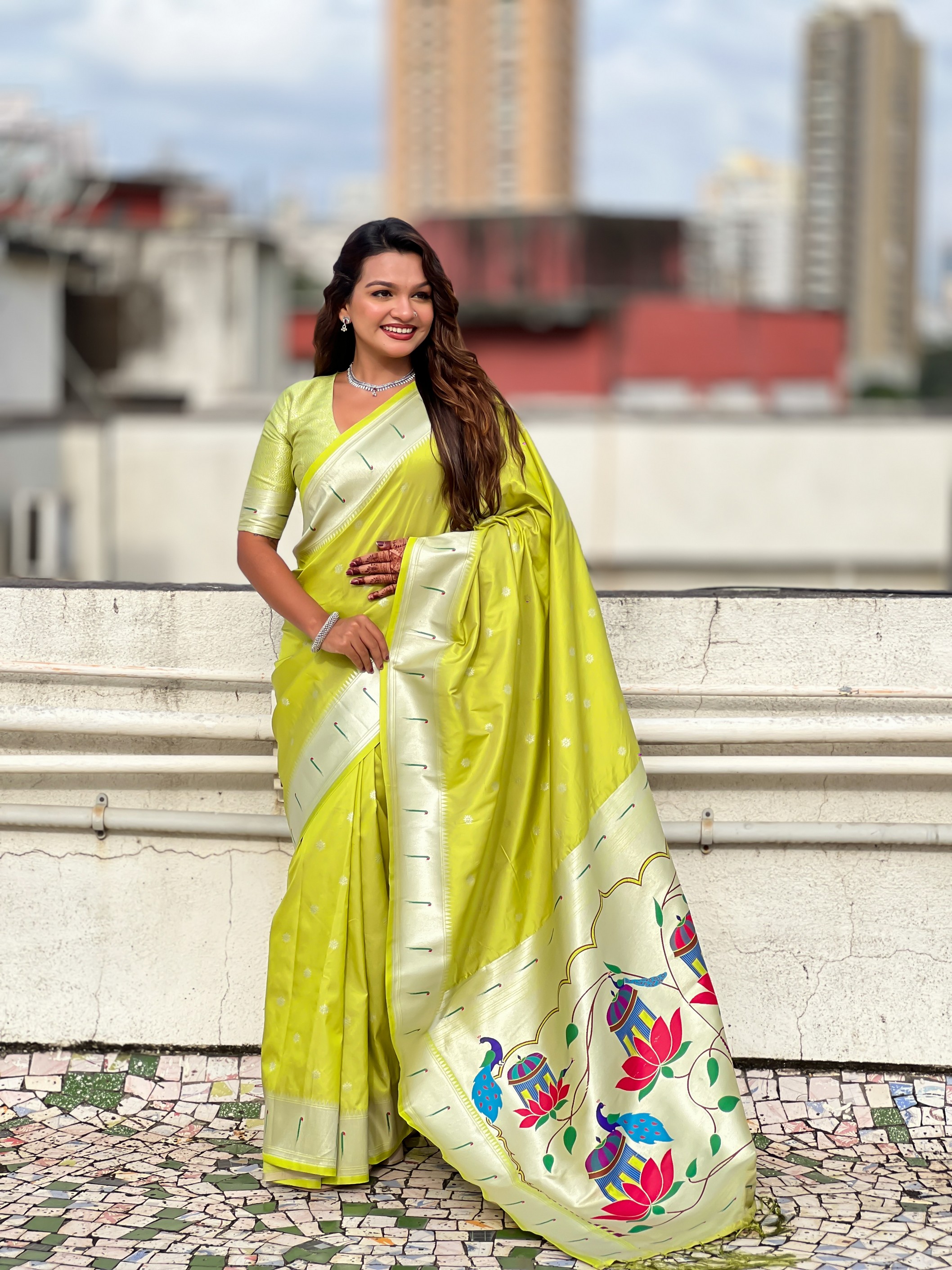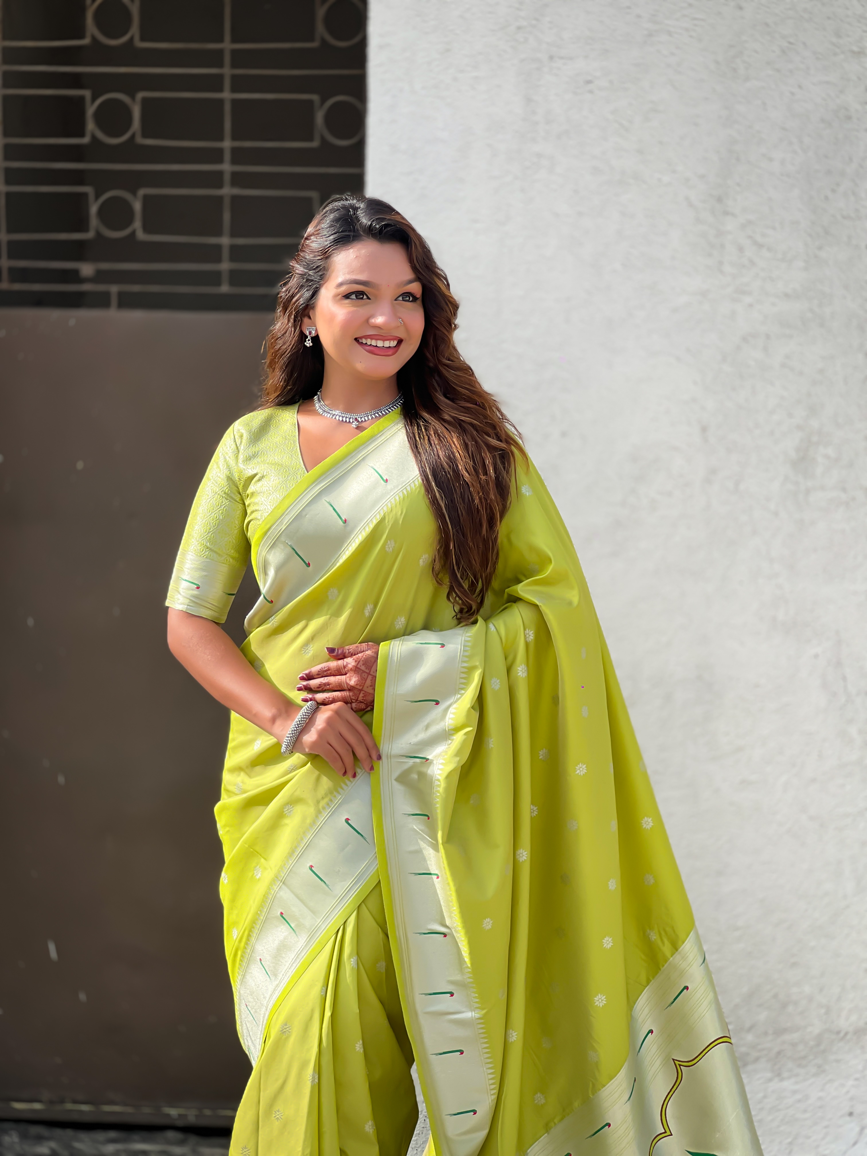 Pista Color Paithani Silk Woven Designer Ceremonial Partywear Saree