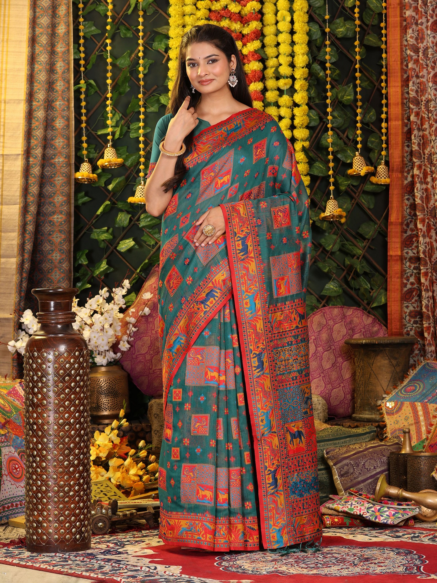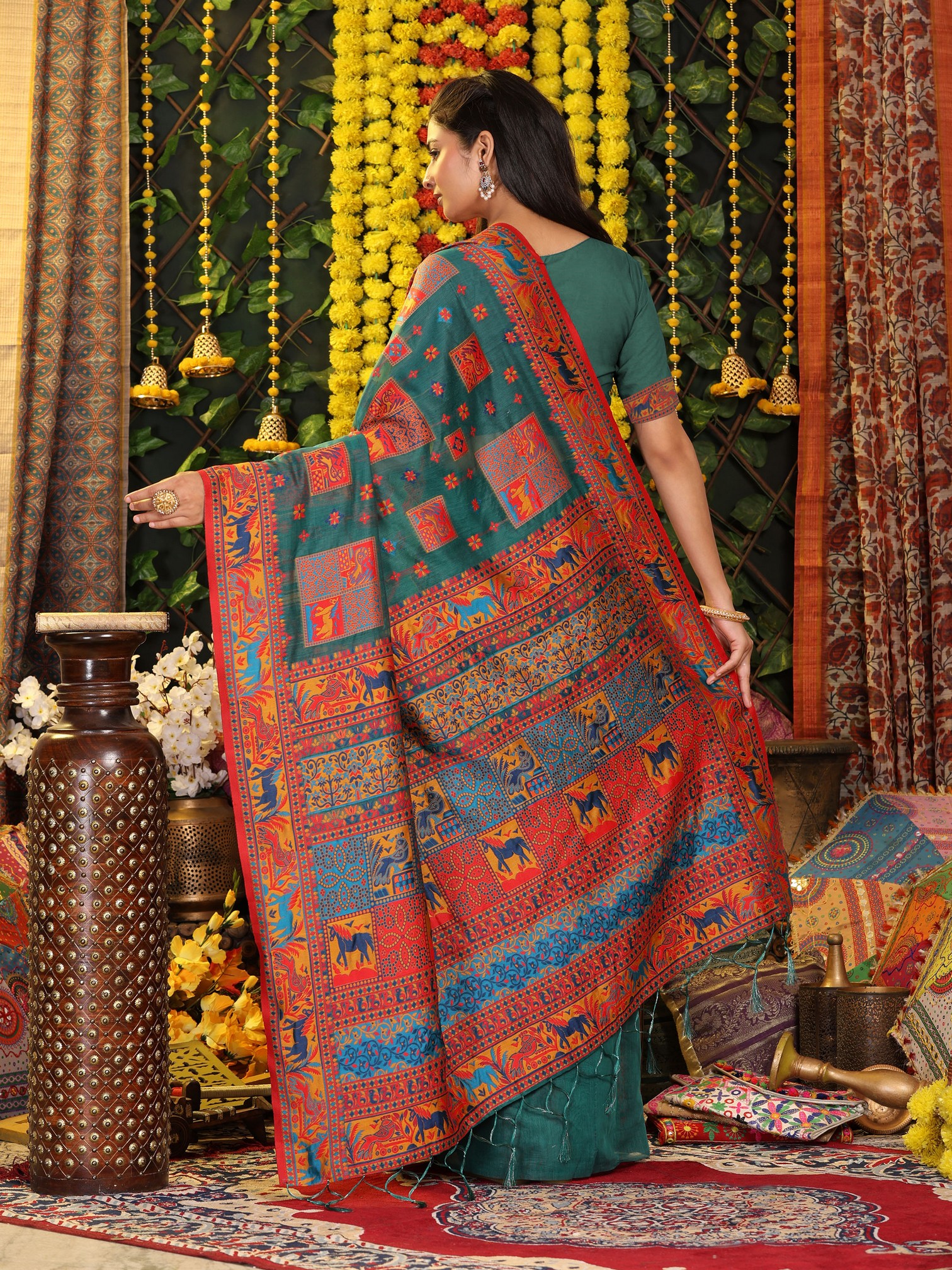 Rama Green Color Linen Cotton Fabric Resham Woven Designer Partywear Saree