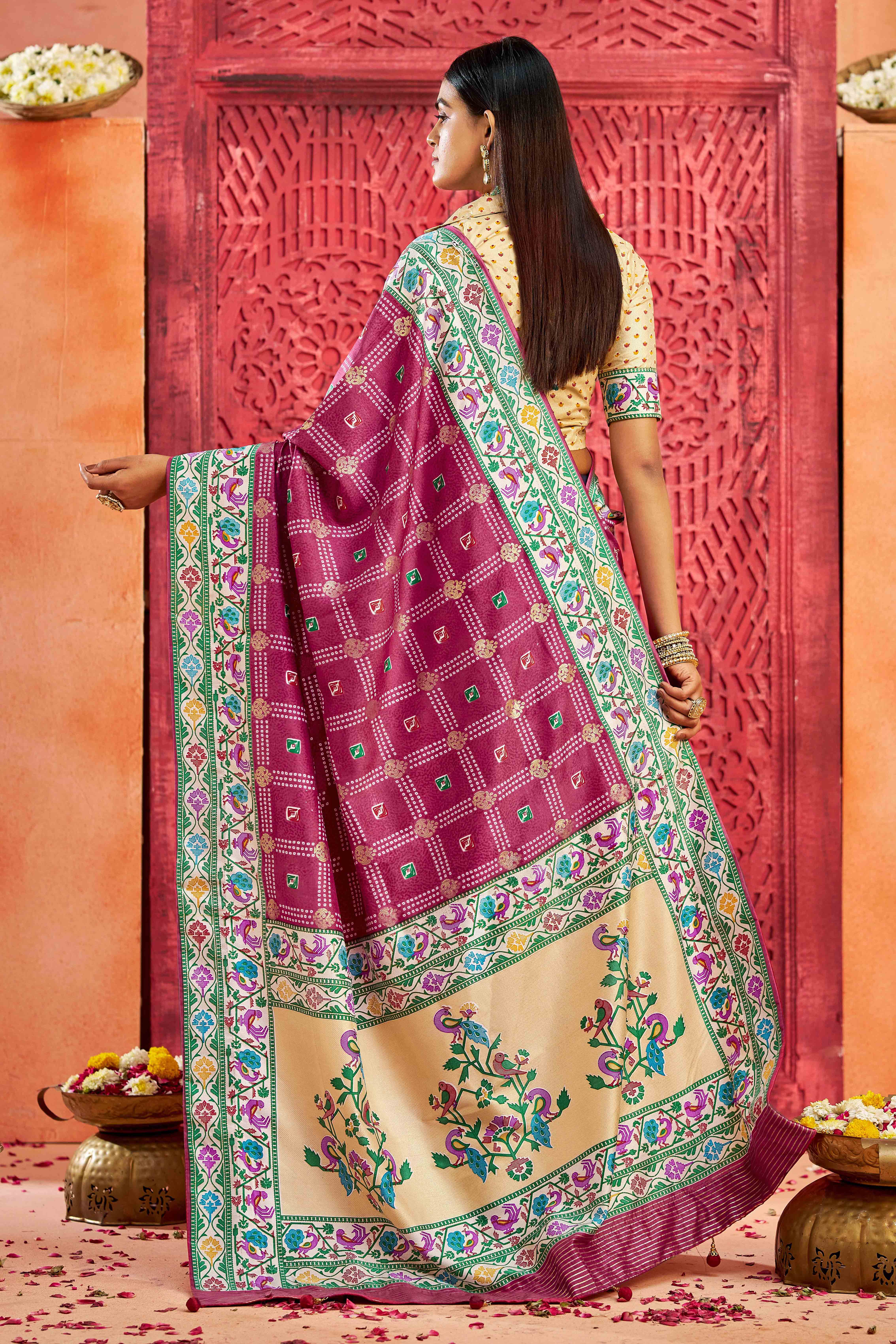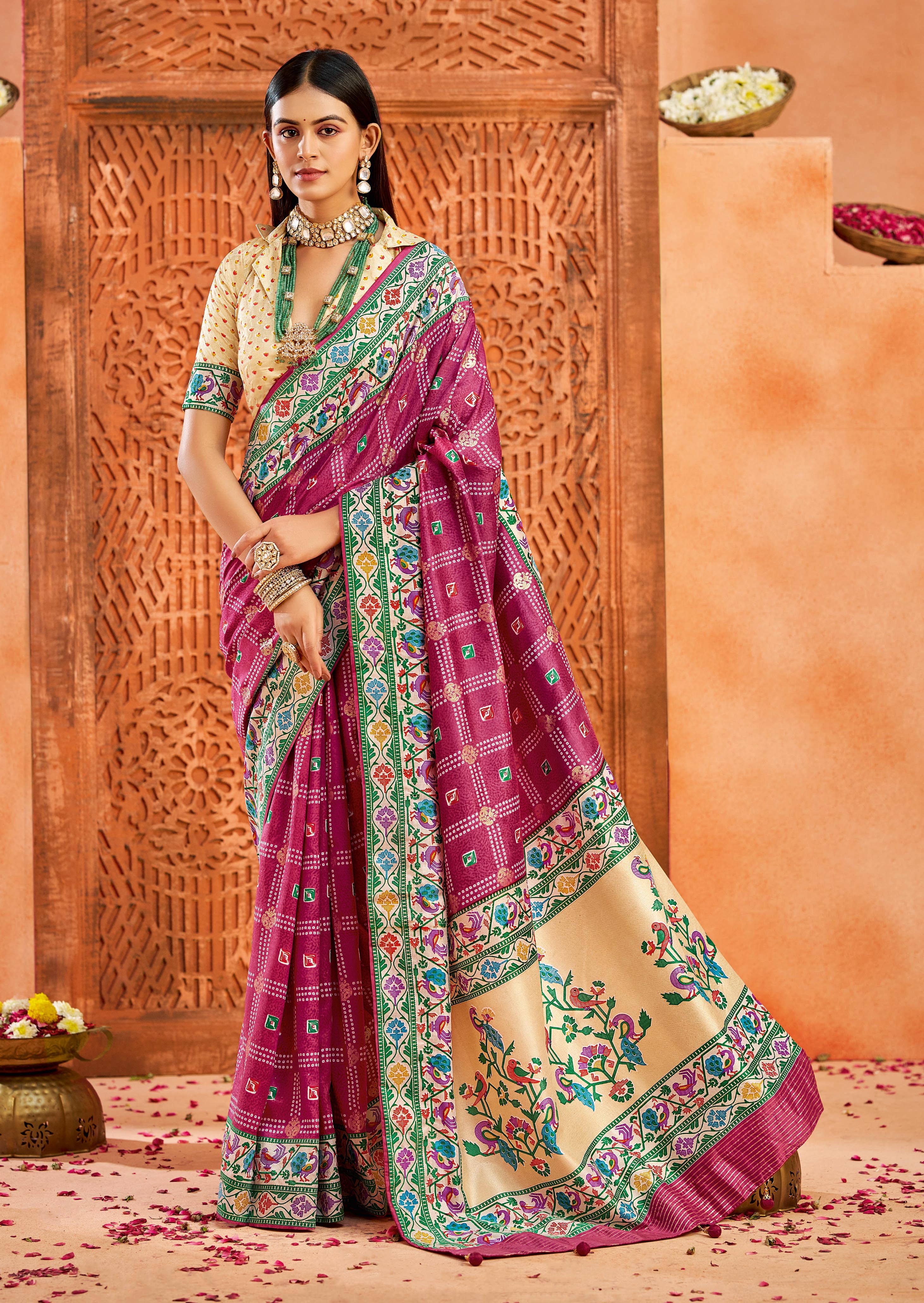 Rani Pink Color Velvet Tussar Silk Fabric Partywear Saree With Paithani Pallu And Traditional Ghatchola Print