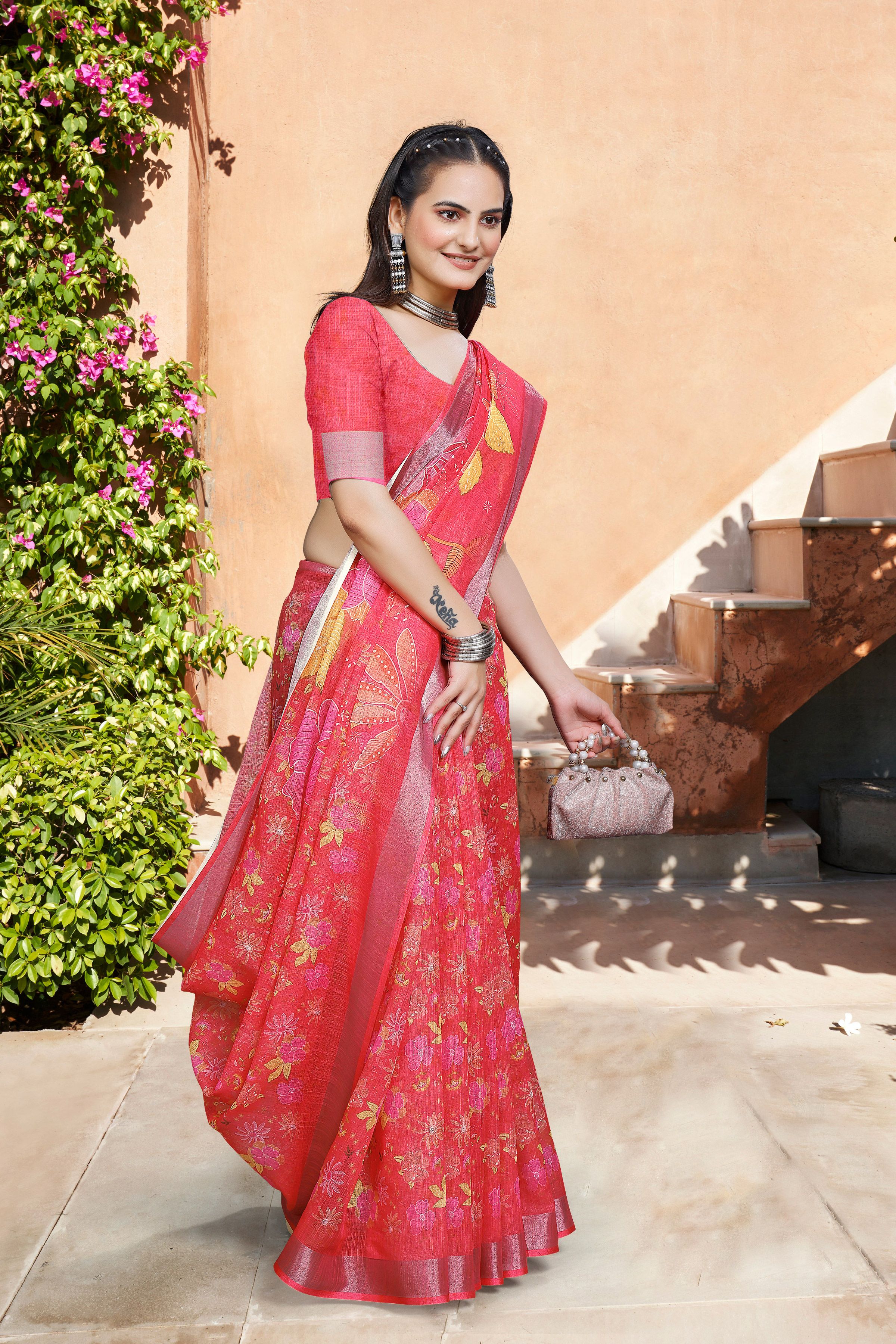 Look These Festive Saree in Fine Colored.These Saree Are Linen Cotton And Blouse is Fabricated On Linen Cotton Pair.Its Beautified With Woven Jari Border With Designer Digital Printed.