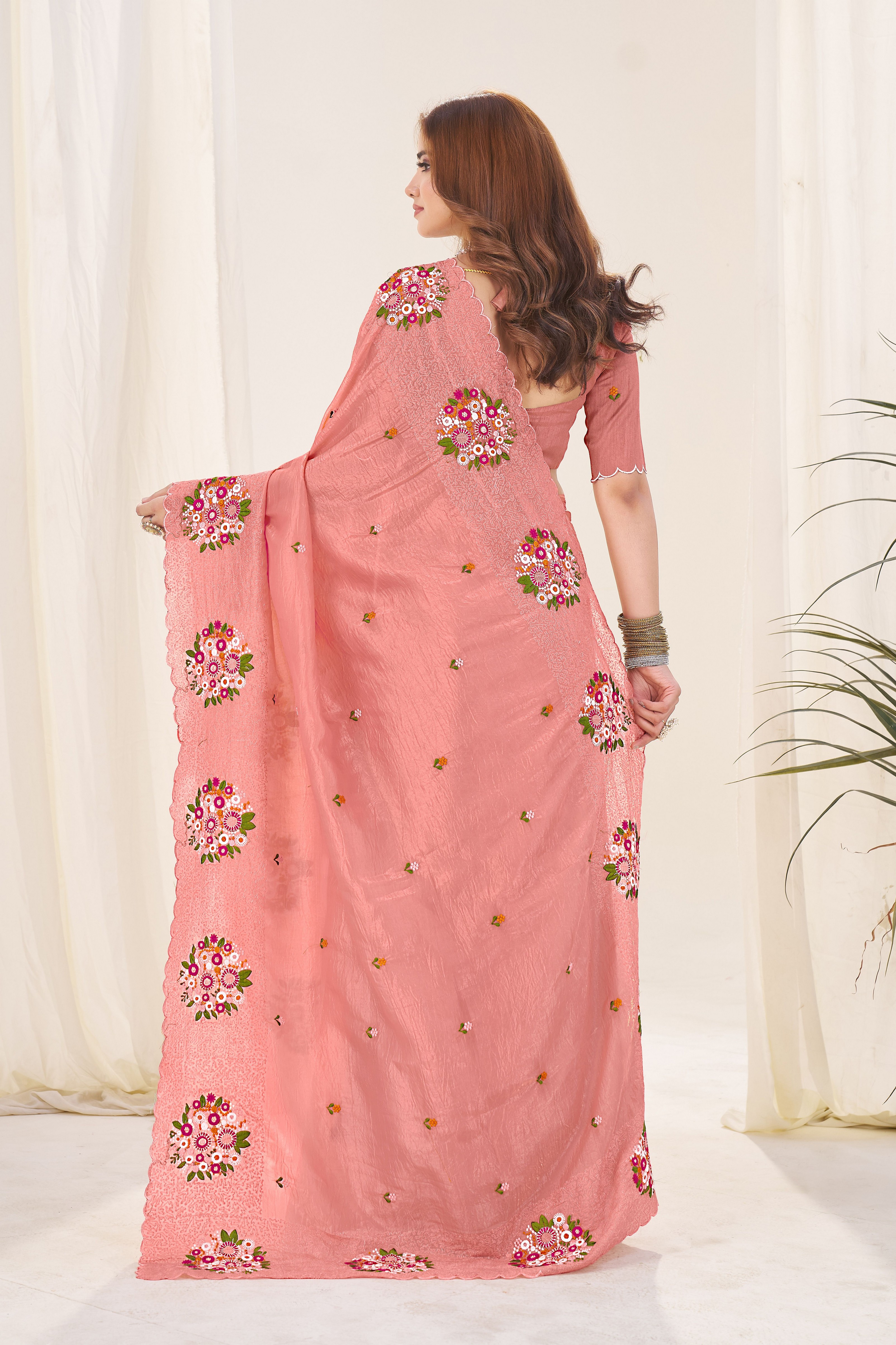 Rust Color Gold Crush Fabric Designer Embroidered Saree