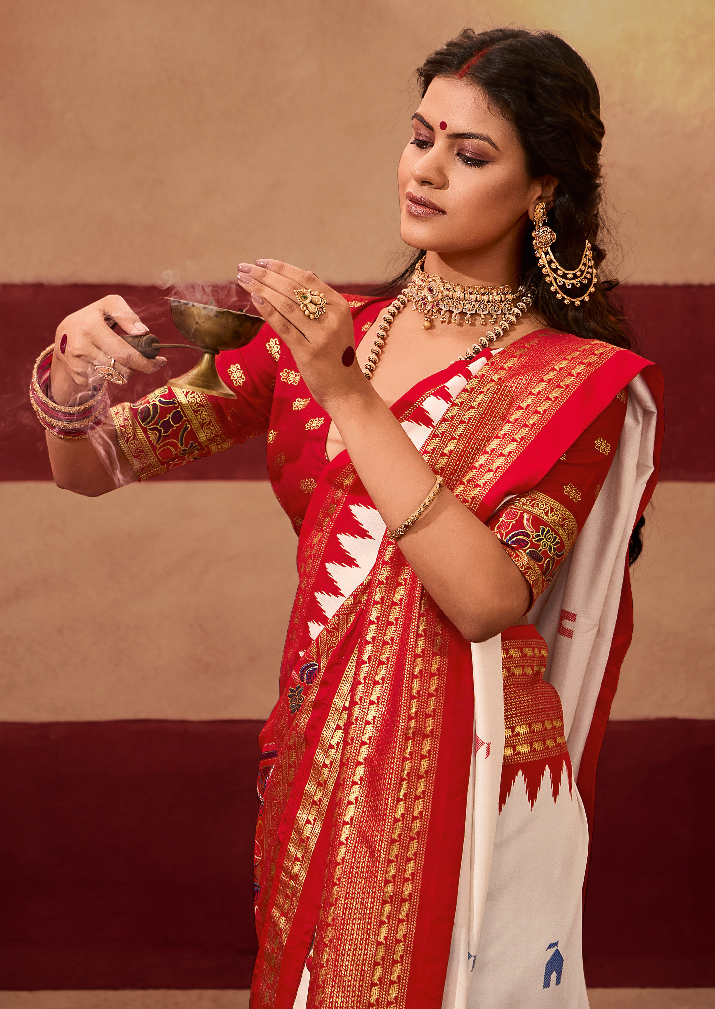 Sambhalpuri Foil Printed Red Color Velvet Tussar Silk Fabric Sophisticated Saree