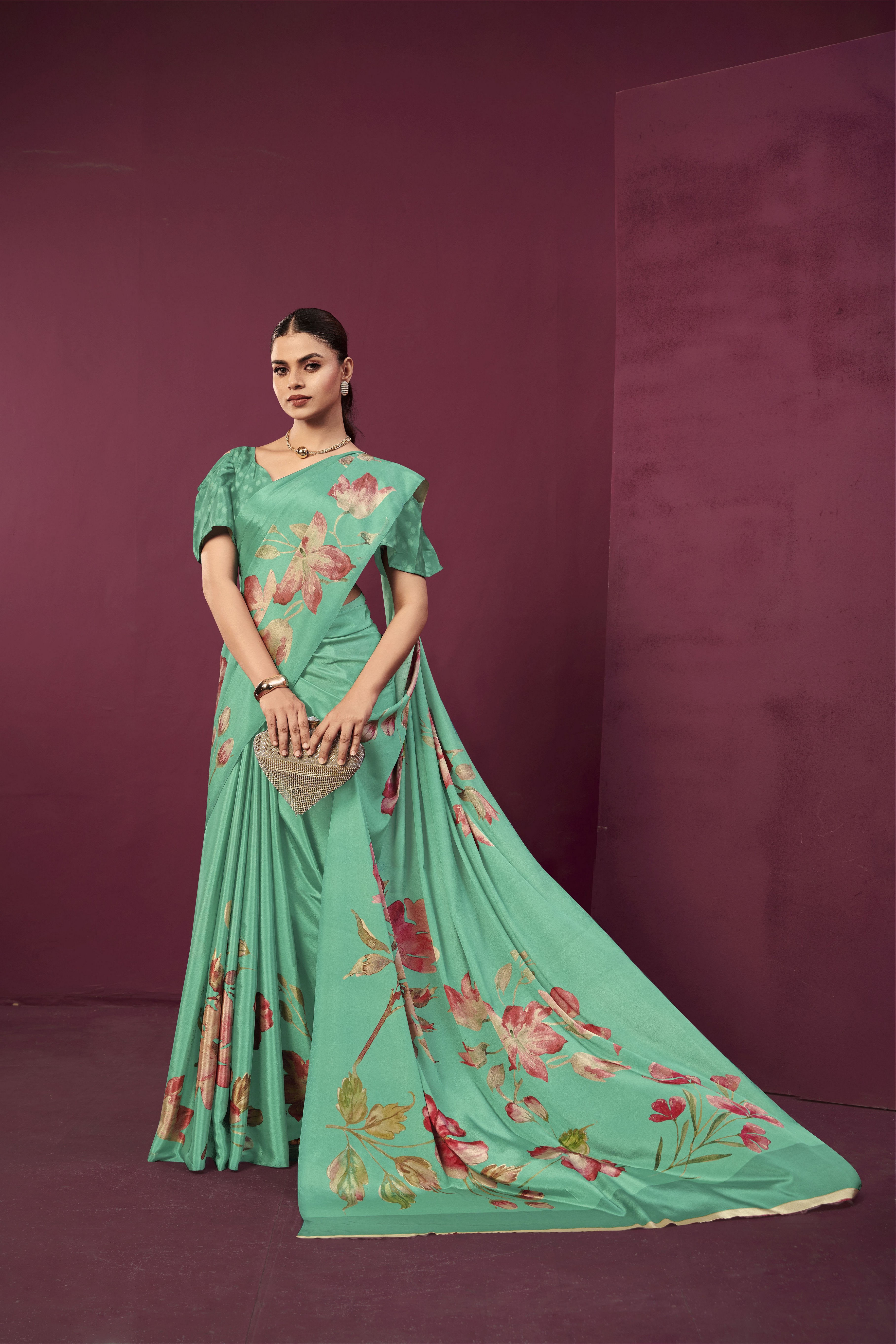 Sea Green Color Malai Crepe Silk Fabric Designer Digital Printed Ceremonial Partywear Saree