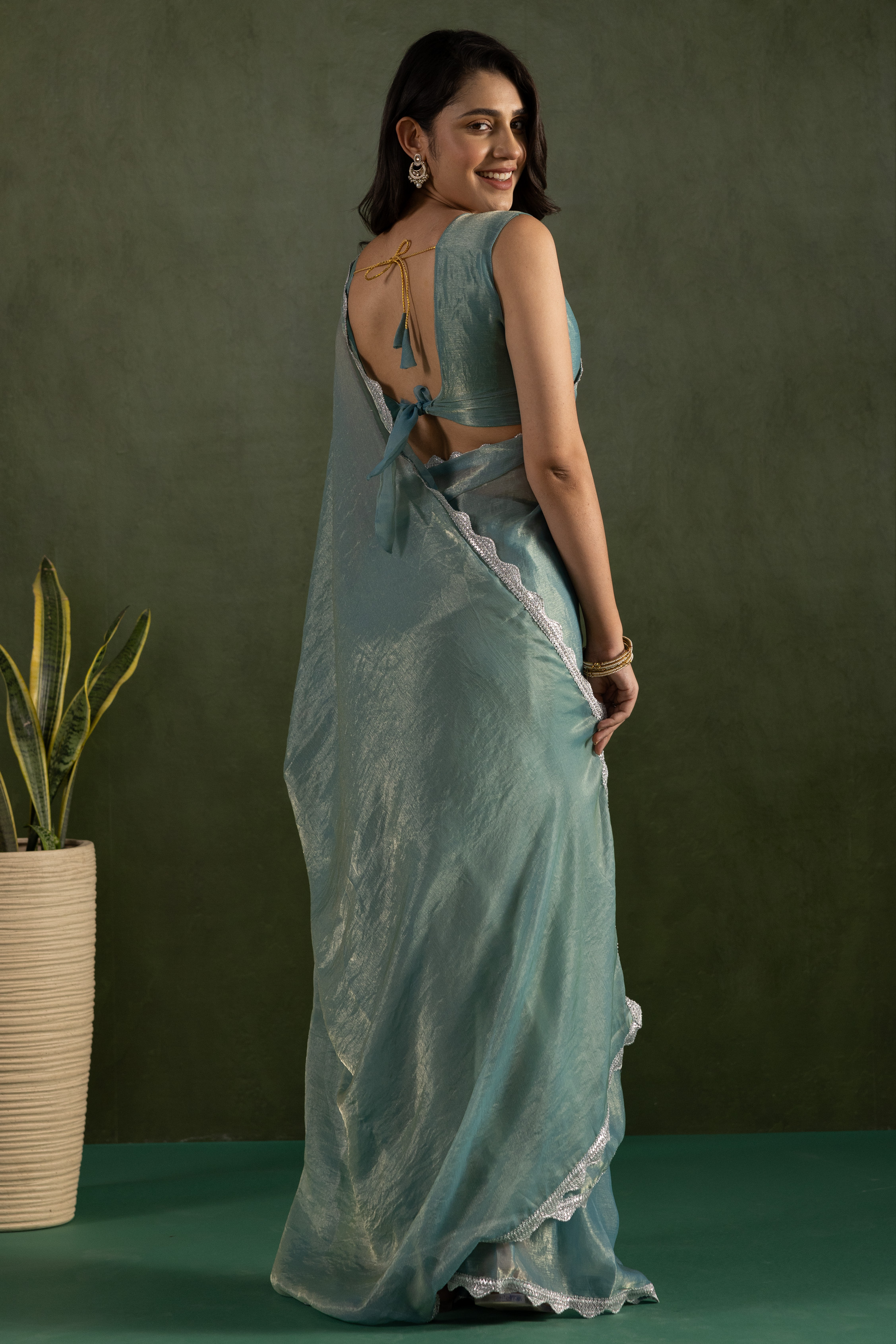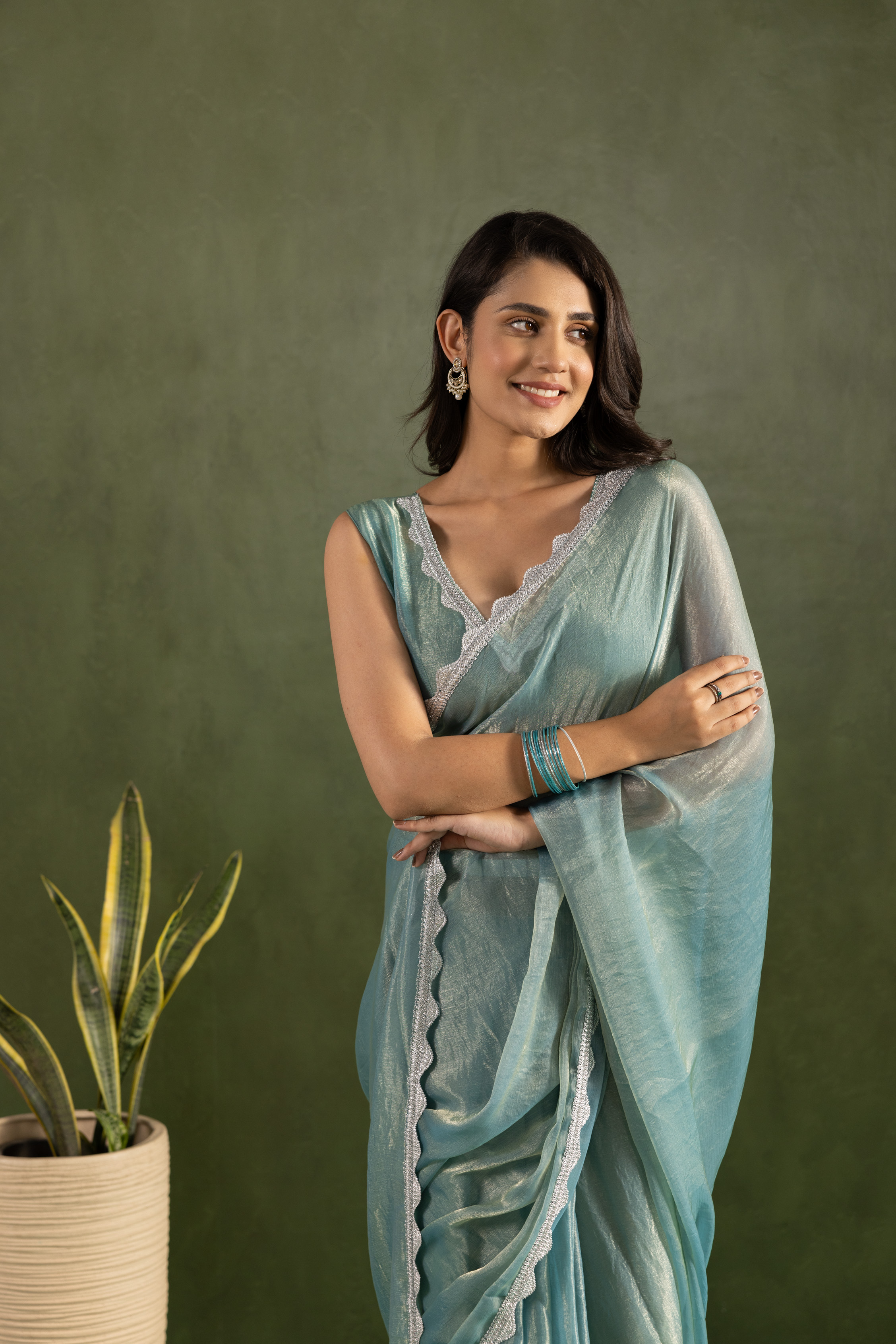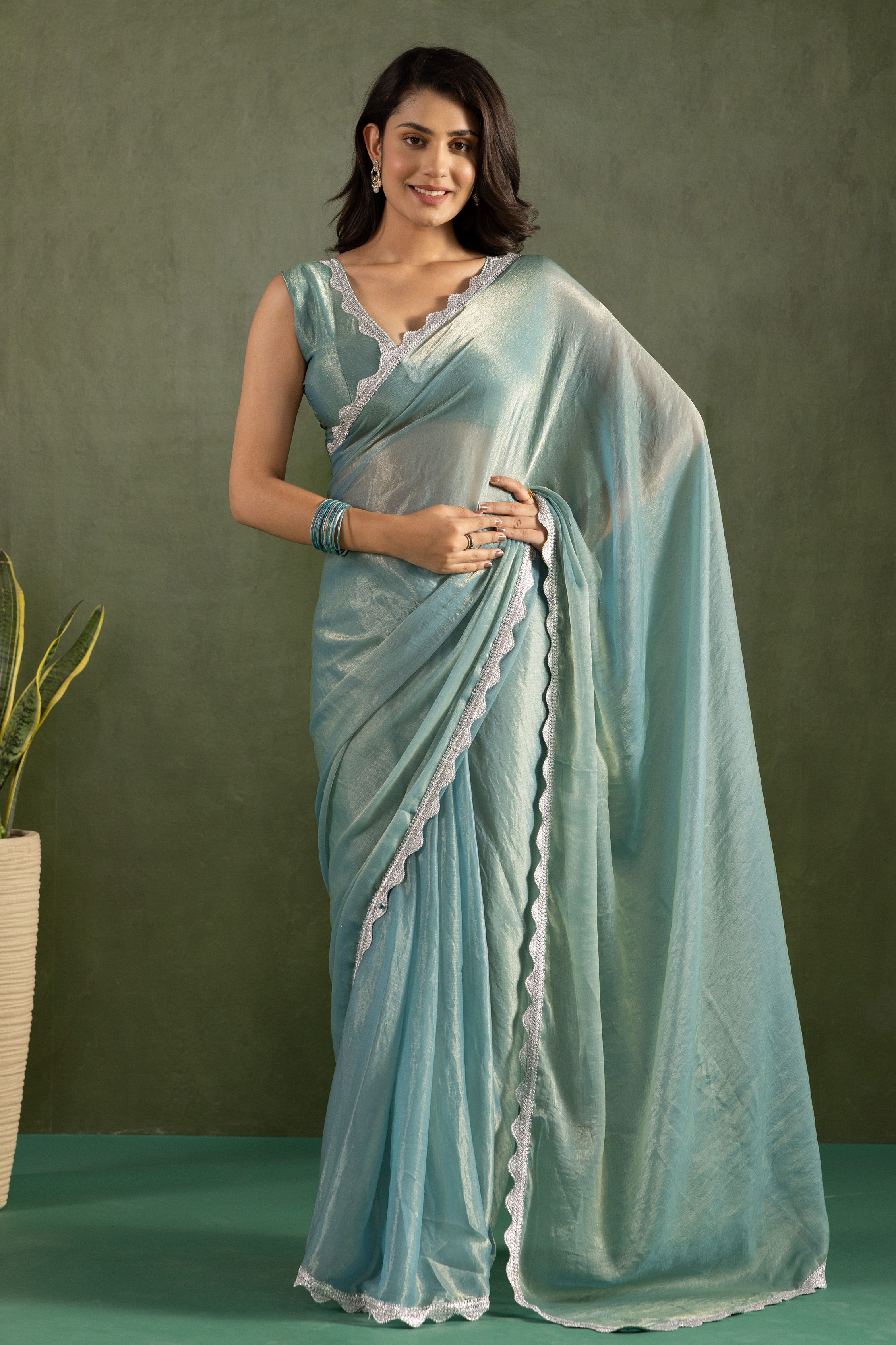 Sky Blue Color Chiffon Fabric Ready To Wear Saree For Graceful Bollywood Style Saree