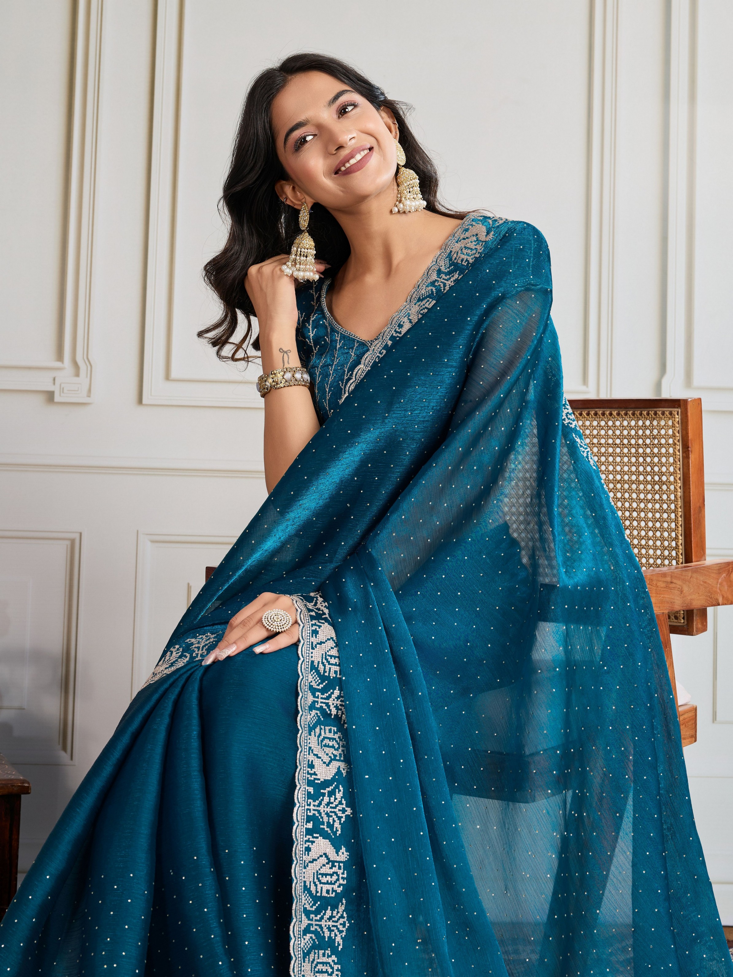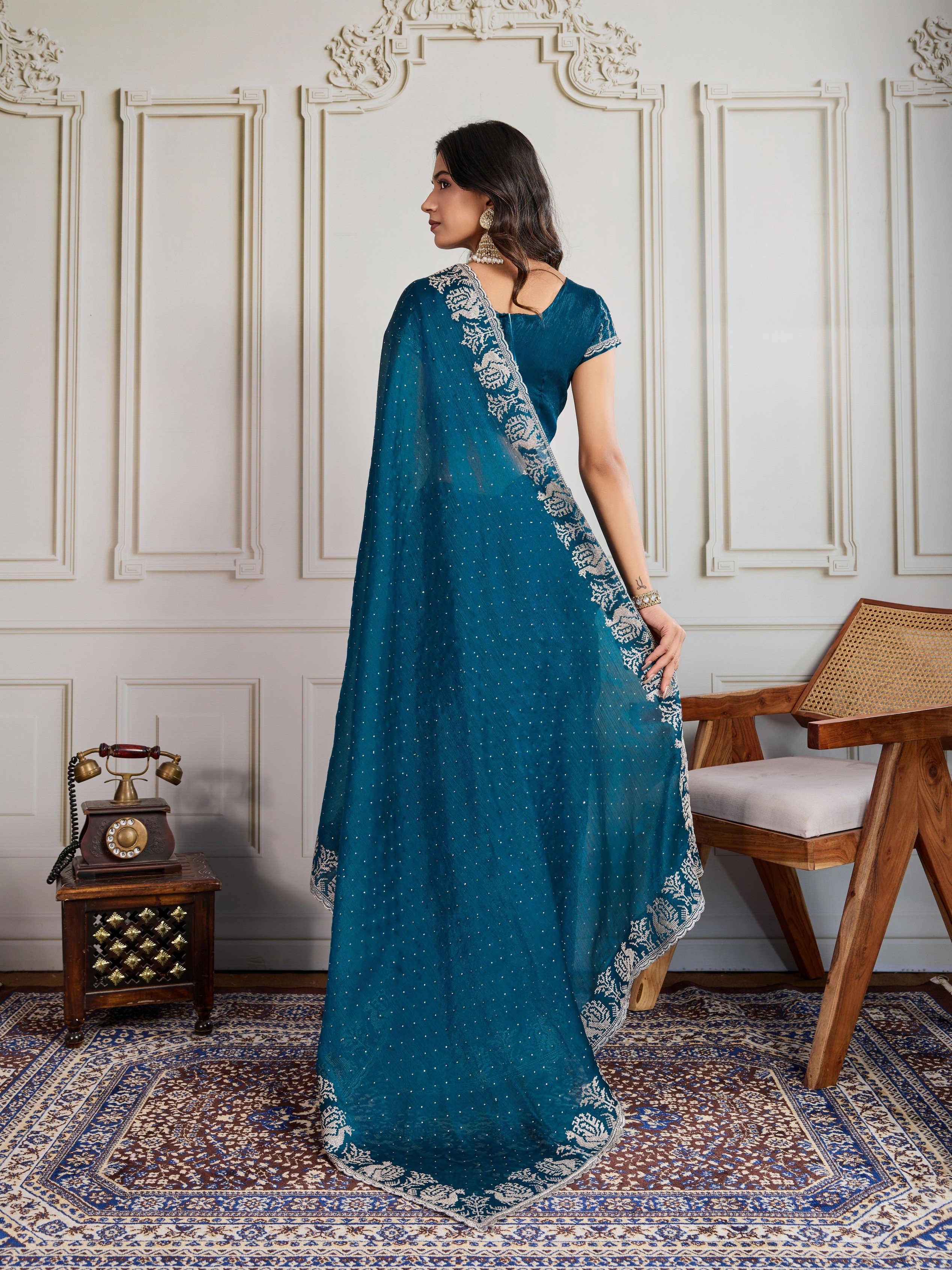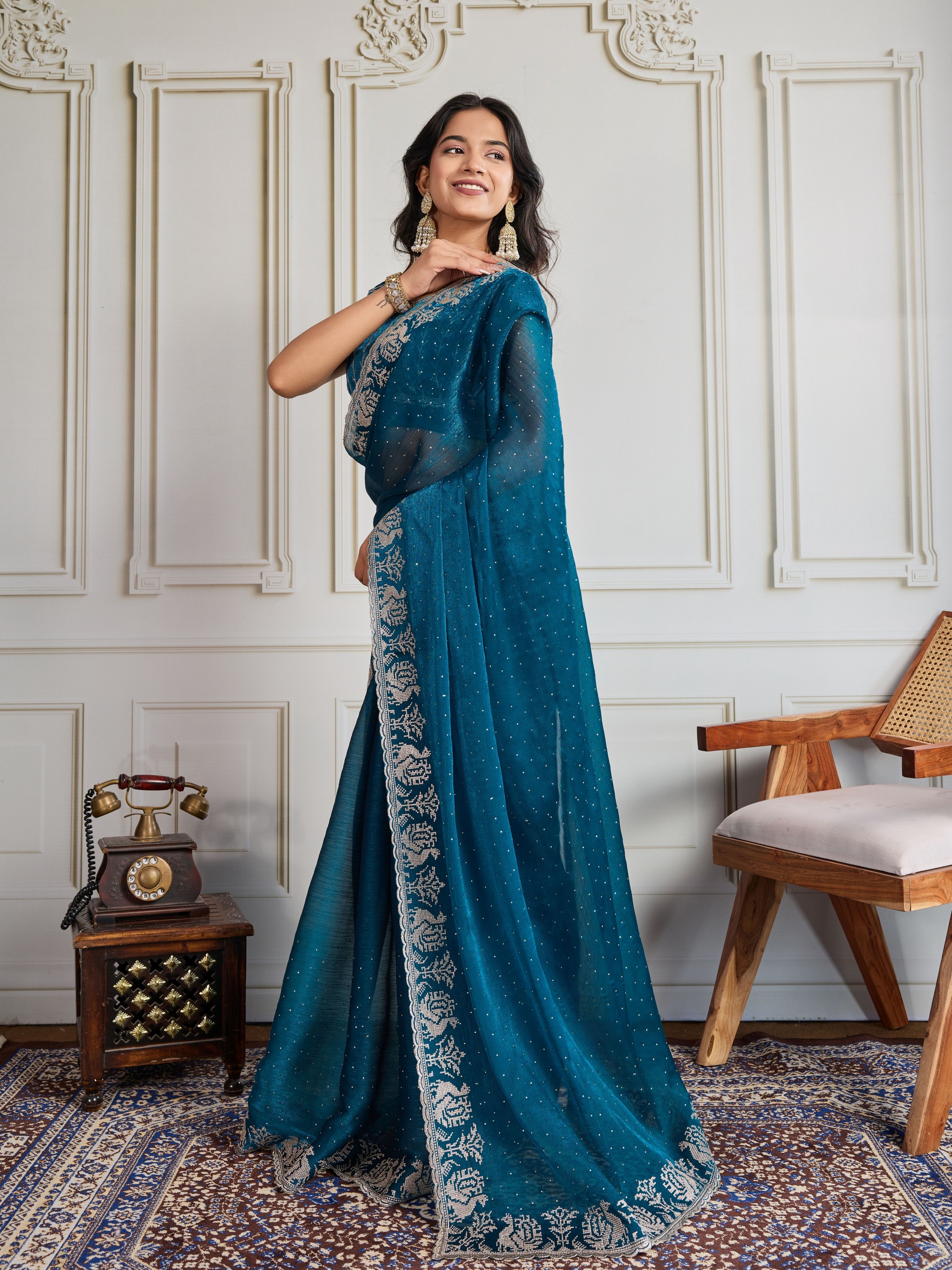 Teal Blue Color Burberry Silk Fabric Graceful Partywear Saree