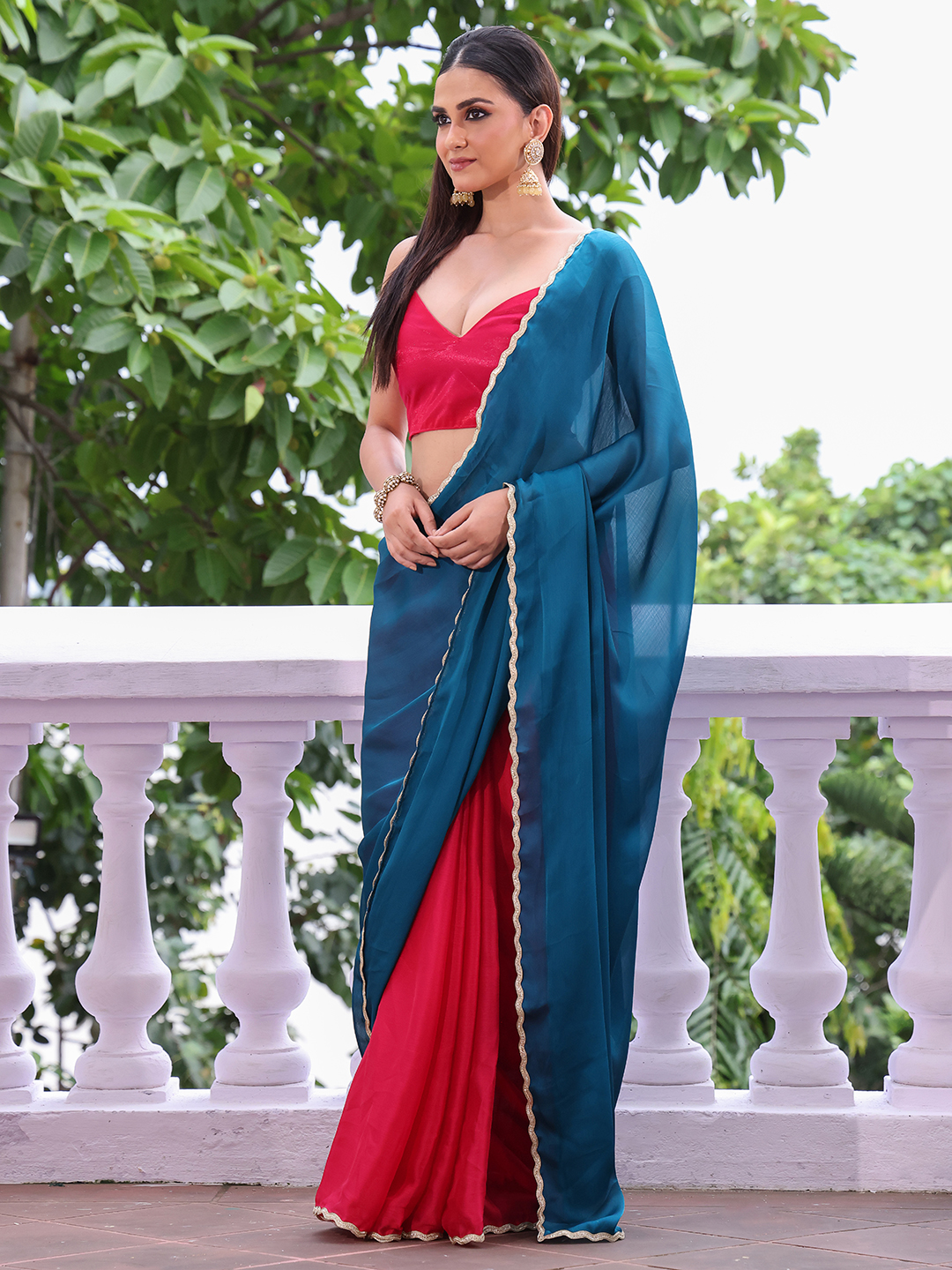 Teal Color Chiffon Fabric Heavy Ceremonial Wear Bollywood Saree
